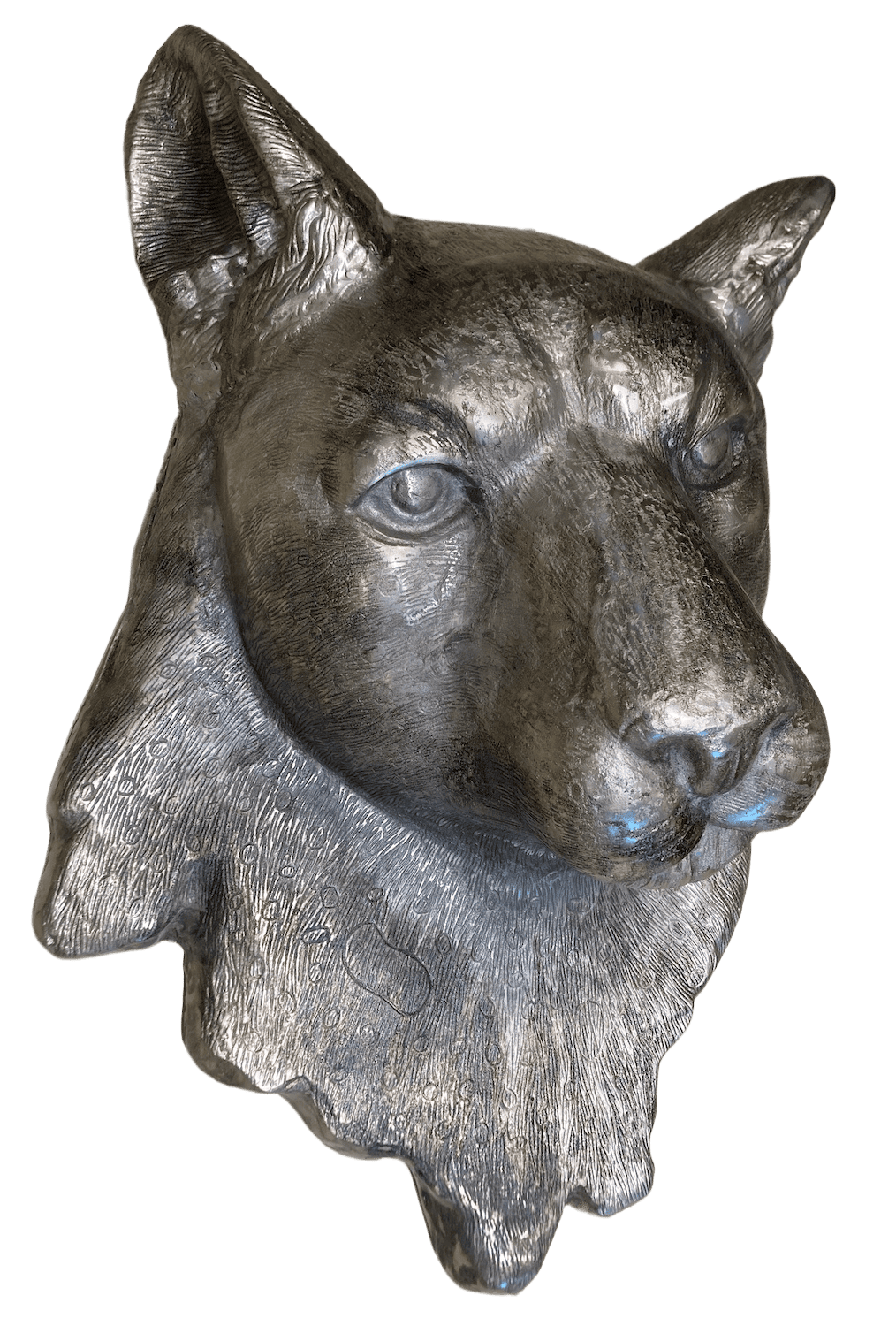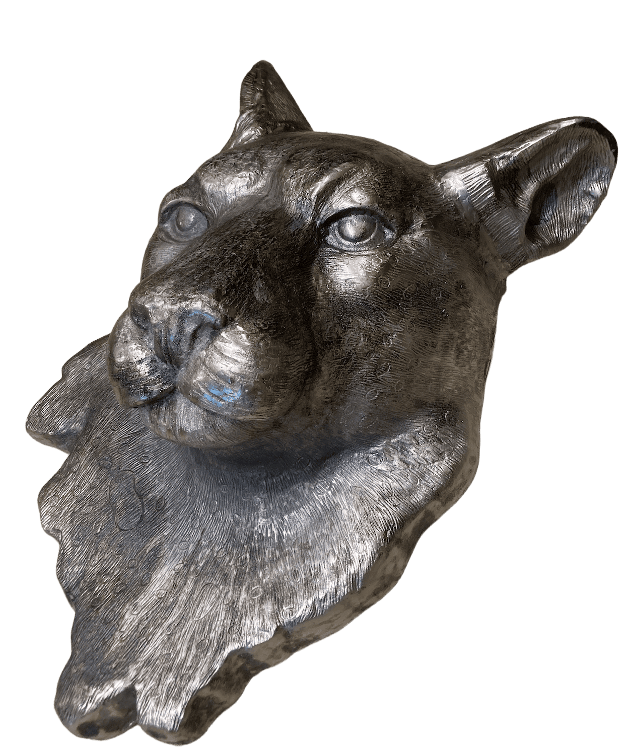 Eigenwilliges Wandobjekt eines übergroßen Leopardenkopfes (80 cm) aus Aluminium. Das Tier wirkt nachdenklich und etwas abwesend. Ein ungewöhnliches Tierporträt mit magnetischer, fast hypnotischer Wirkung. Hinten ist es mit einer stabilen Aufhängung versehen.