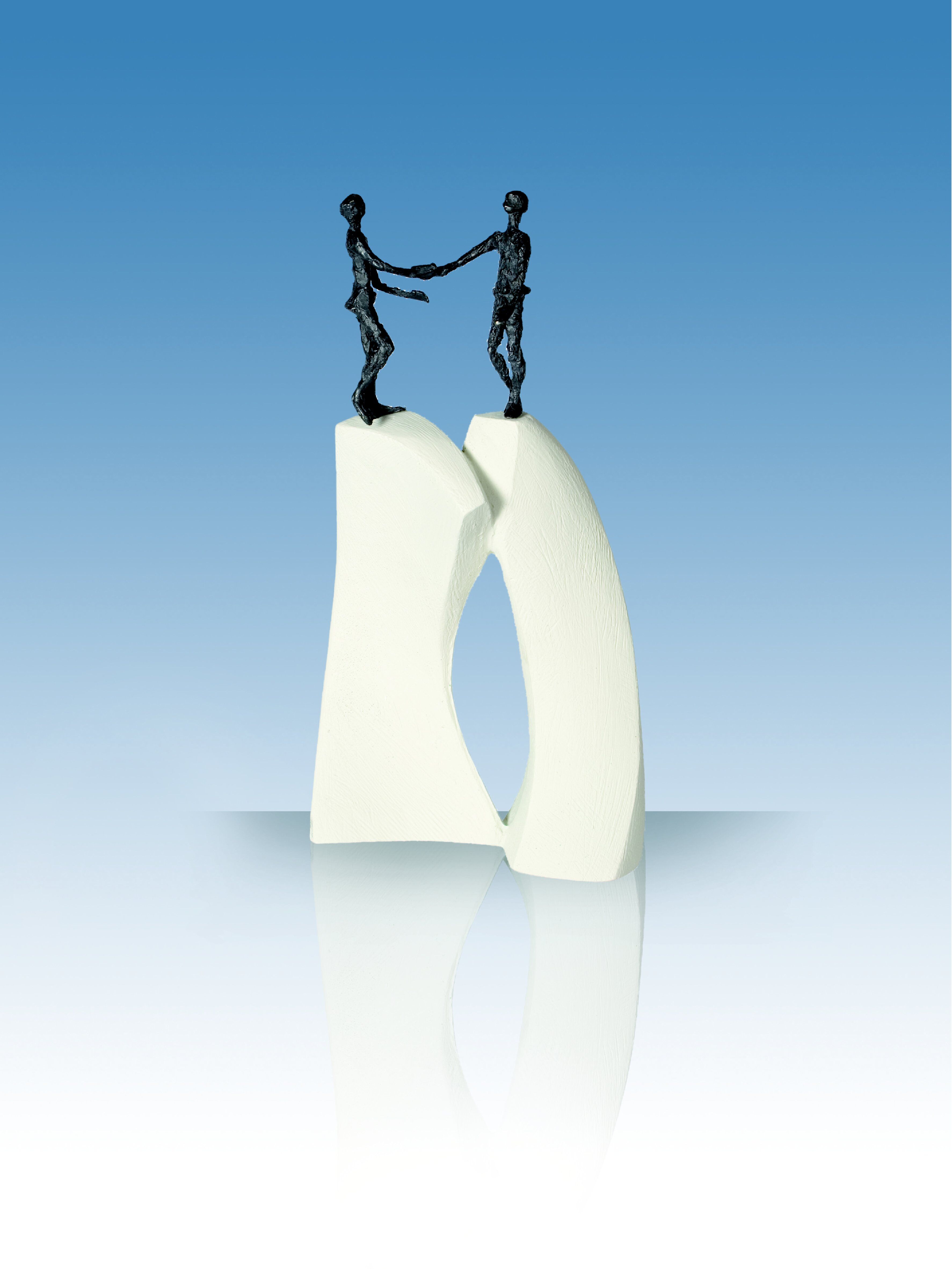 Die Hand reichen heißt Abstand zu überbrücken. Zum Kennenlernen, zur Versöhnung oder um eine gemeinsame temporäre Basis finden. Die Bronzeplastik ist mit dem weißen Sockel verbunden. Dessen Oberfläche ist leicht gewunden und handschmeichelnd geformt. Es ist angenehm, ihn zu berühren und in der Hand zu halten. Eine Geschenkidee für geschäftliche und versöhnlcihe Anlässe.