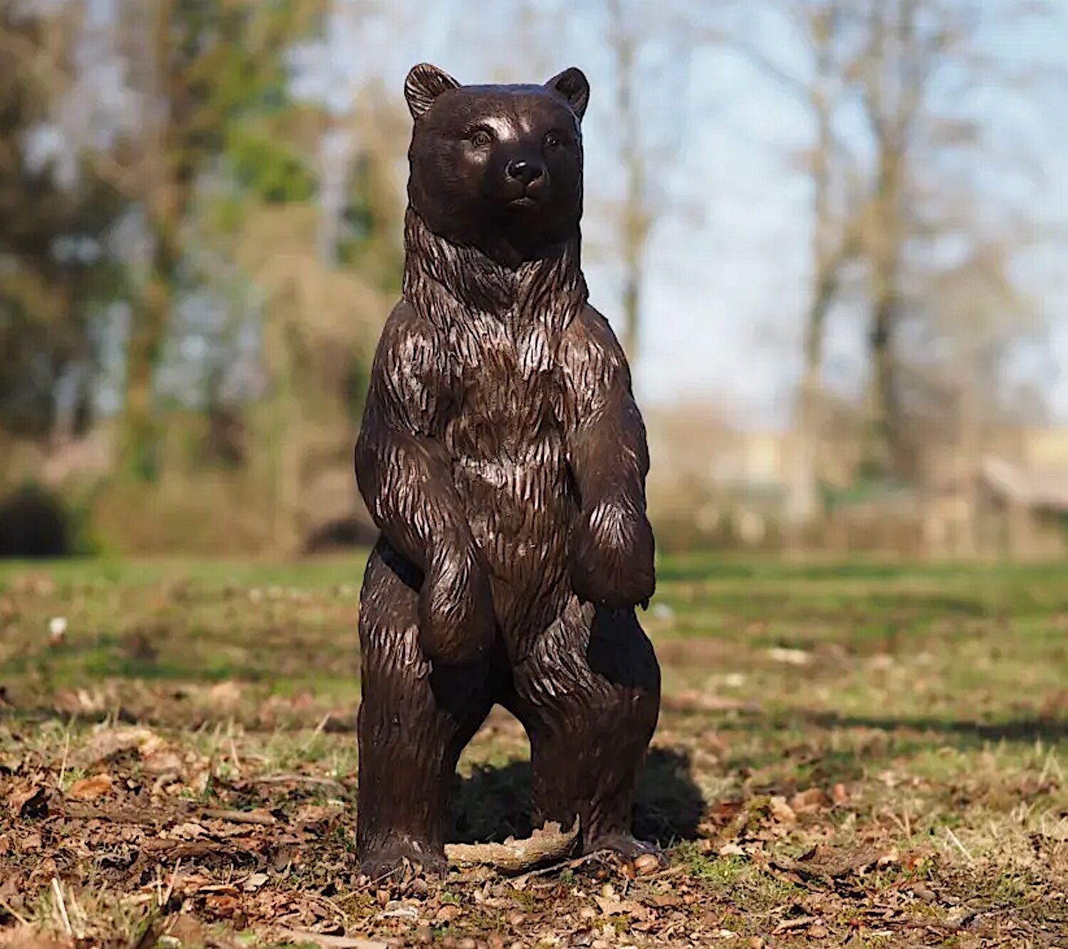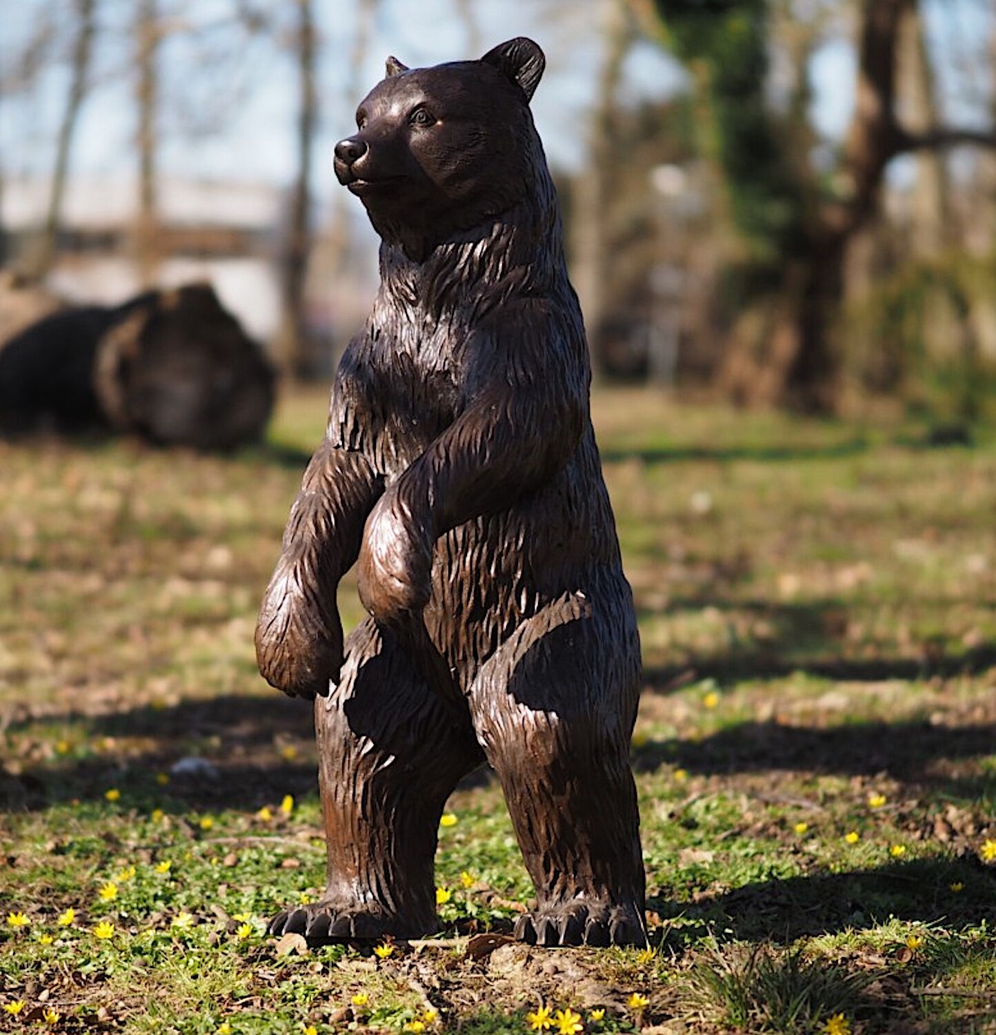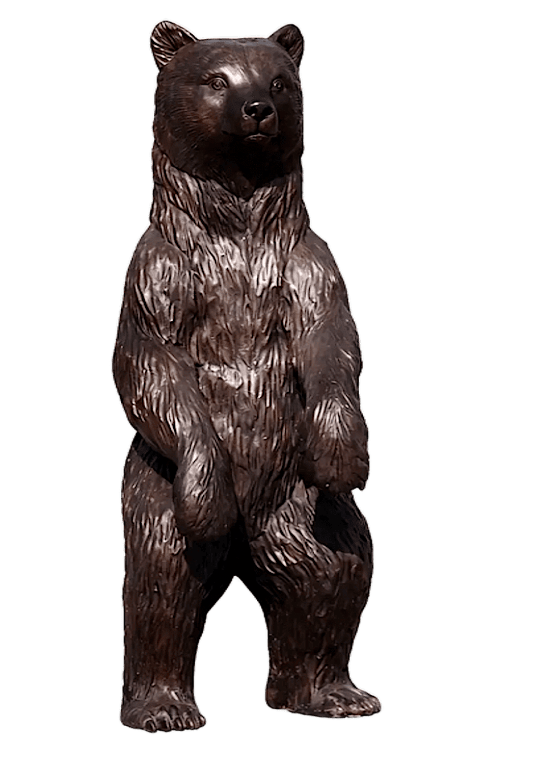 Lebensnaher, stehender Bär aus patinierter Bronze mit einer Höhe von 91 cm. Die fein herausgearbeiteten Details zeichnen das authentische Bild eines jungen Bären, wie er genau so in Ihrem Garten oder Haus stehen könnte.