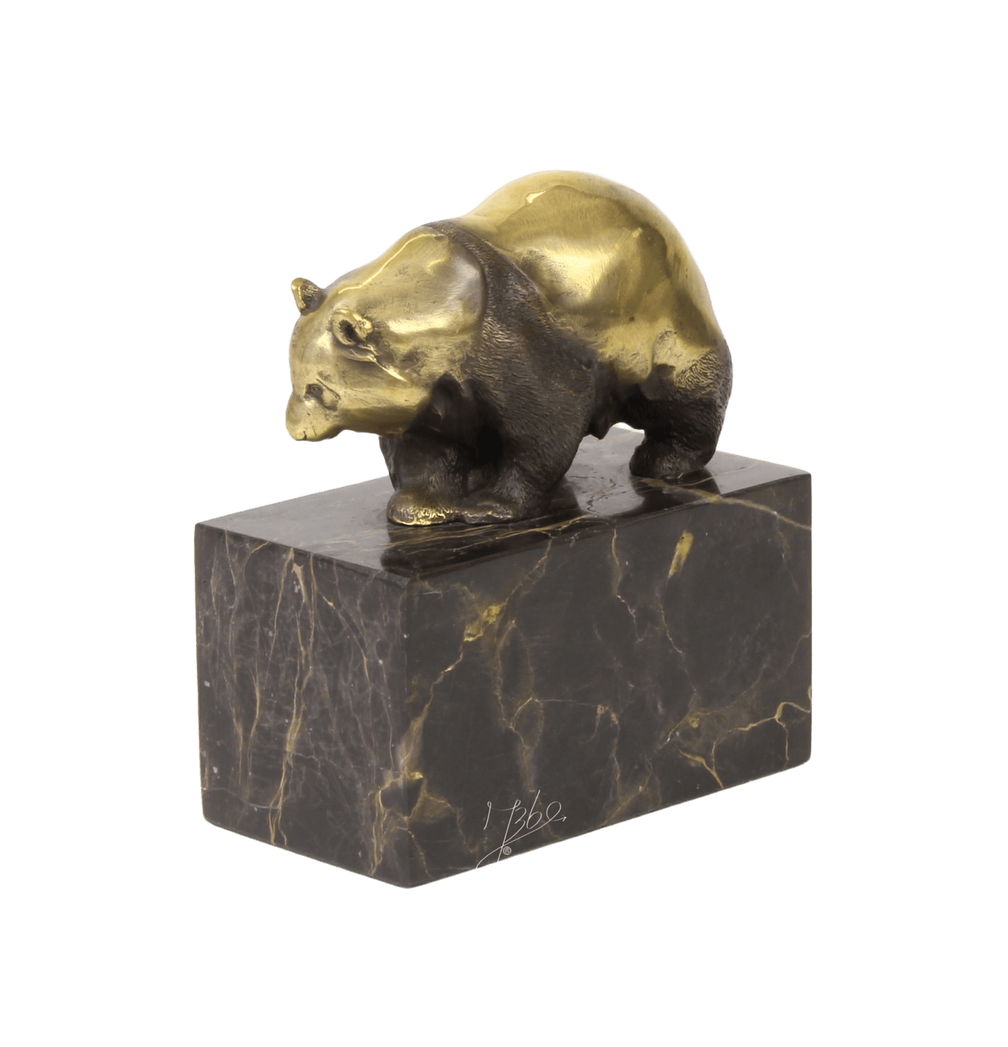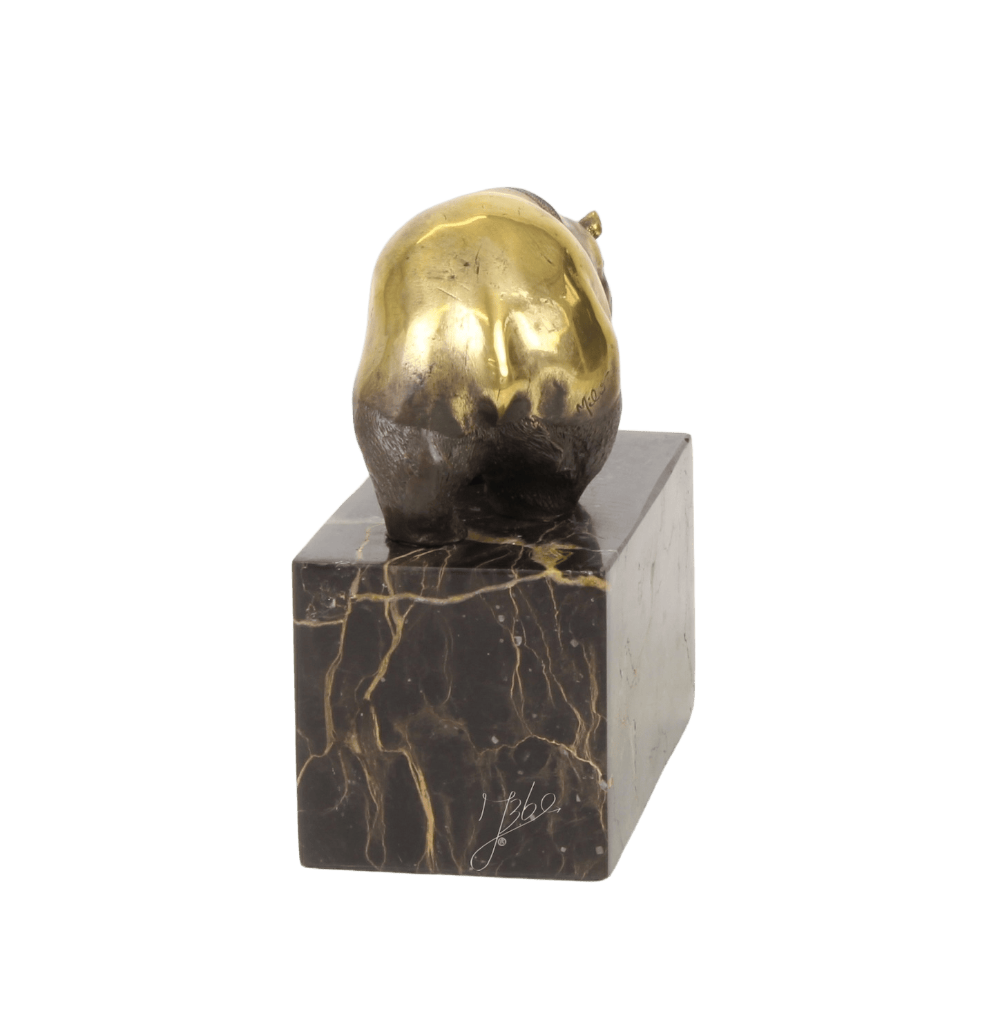 Kleiner laufender Pandabär aus patinierter Bronze auf einem Steinsockel (insgesamt 14 cm hoch). Seiner schleppenden Gangart nach hat er zuviel Bambus gefressen. Die treffliche Darstellung dieses beliebten Tieres stammt vom portugiesischen Bildhauer Miguel Fernando Lopez (geb. 1955).