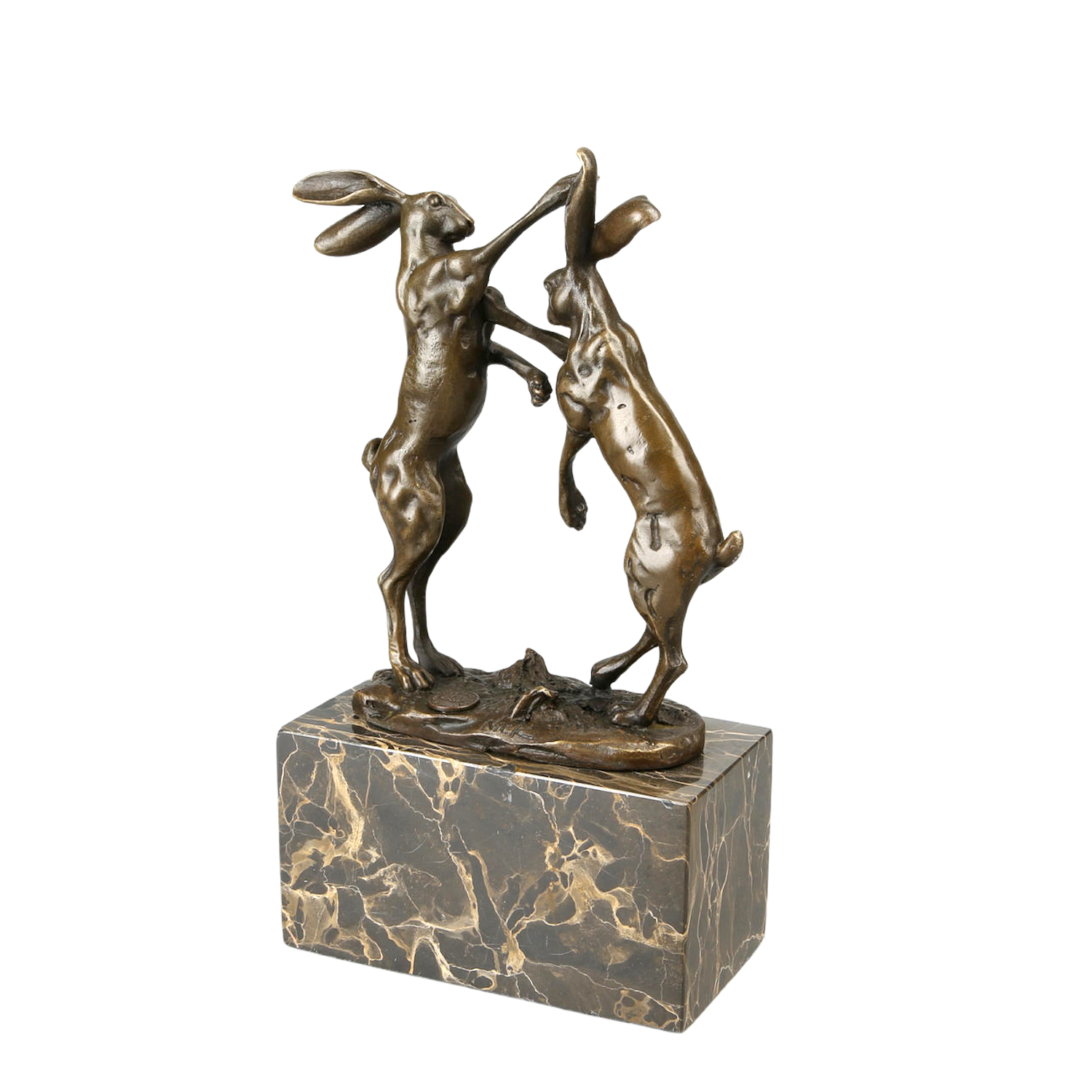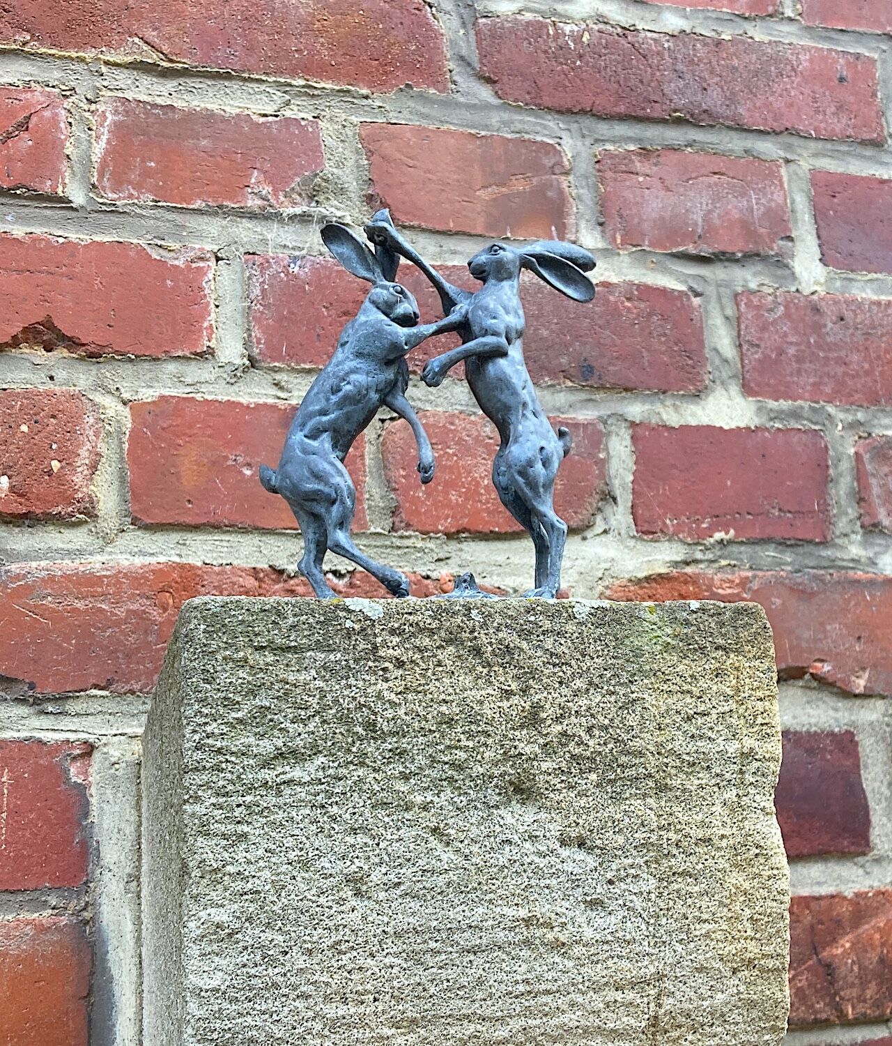 Boxende Feldhasen sind ein beindruckendes Ritual. Dabei testet die Häsin die Stärke eines männlichen Hasens. Erst, wenn sie den stärksten erwischt hat, ist sie zur Paarung bereit. Diese kleine Bronze auf Steinsockel (ca. 24 cm hoch) zeigt einen solchen Kampf.