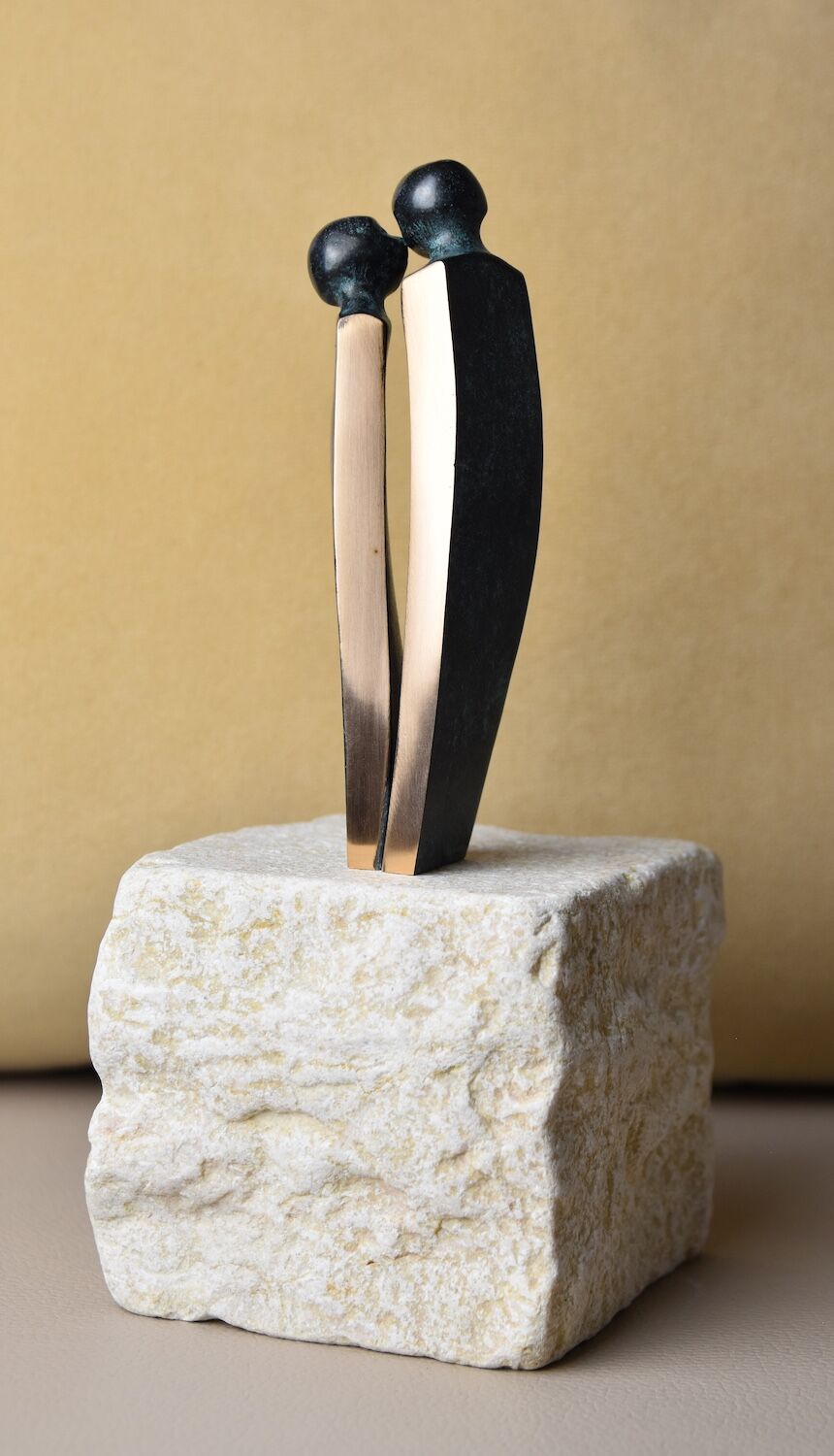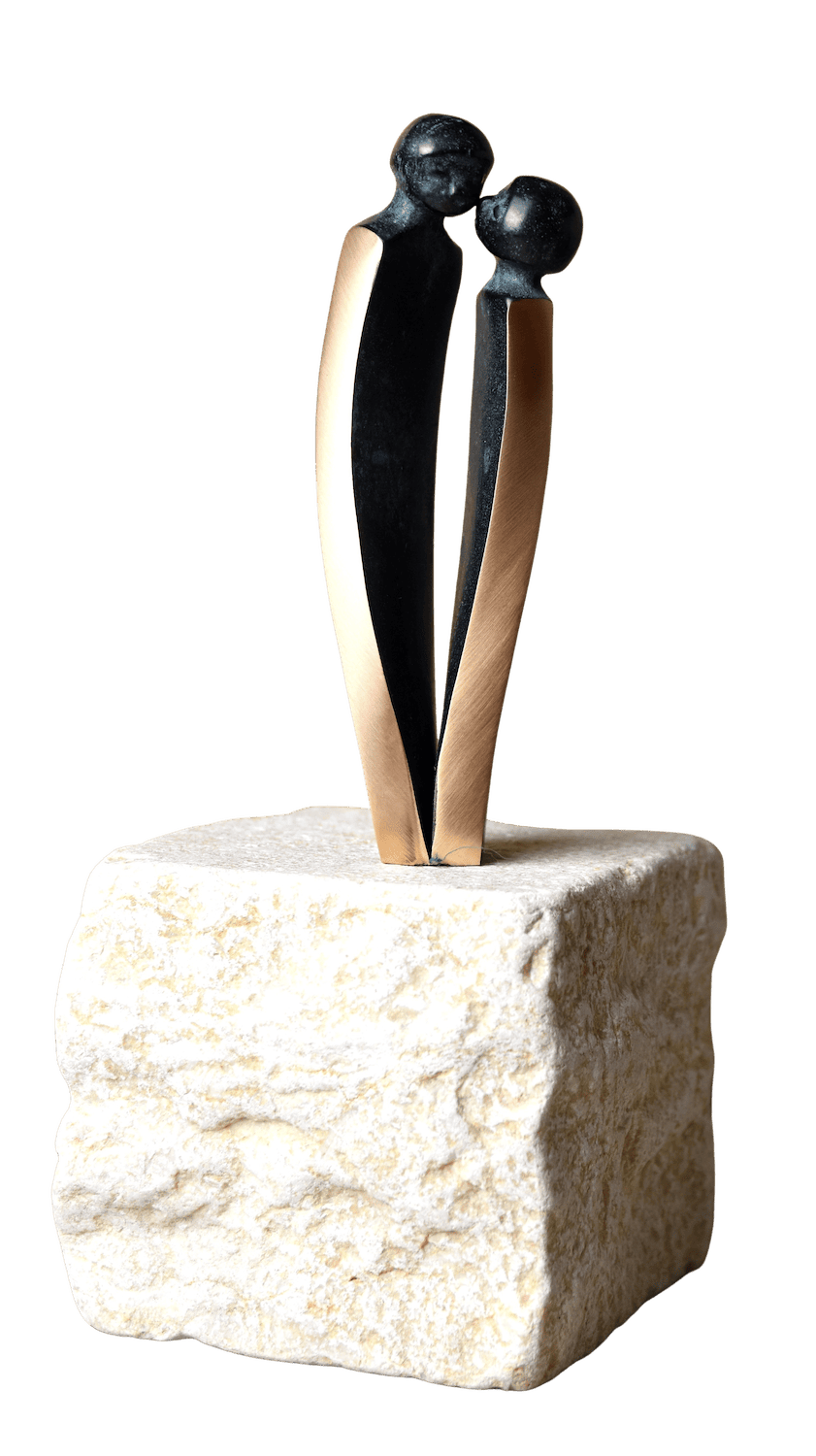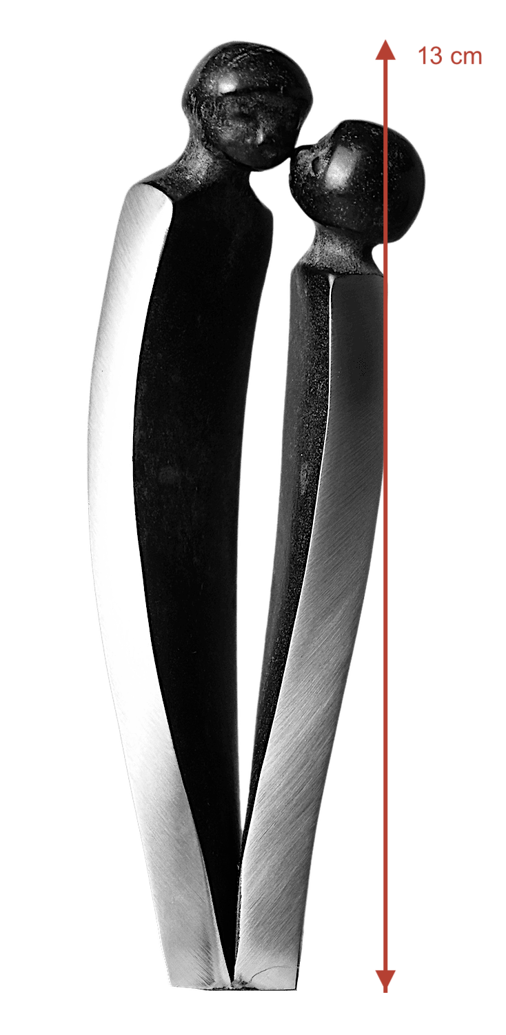 Äußerst elegant stilisierte, kleine Bronzeplastik (13 cm) eines Paares, das einen Wangenkuss austauscht. An den Seiten zeigt sich die Bronze poliert und unpatiniert. Ein auch haptisch sehr angenehmes Werk, das zu betrachten und berühren Freude macht.
