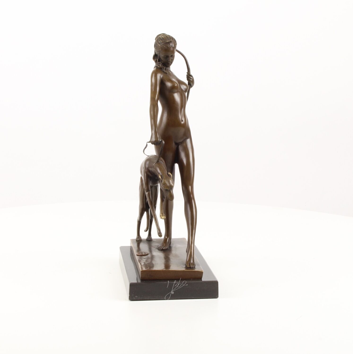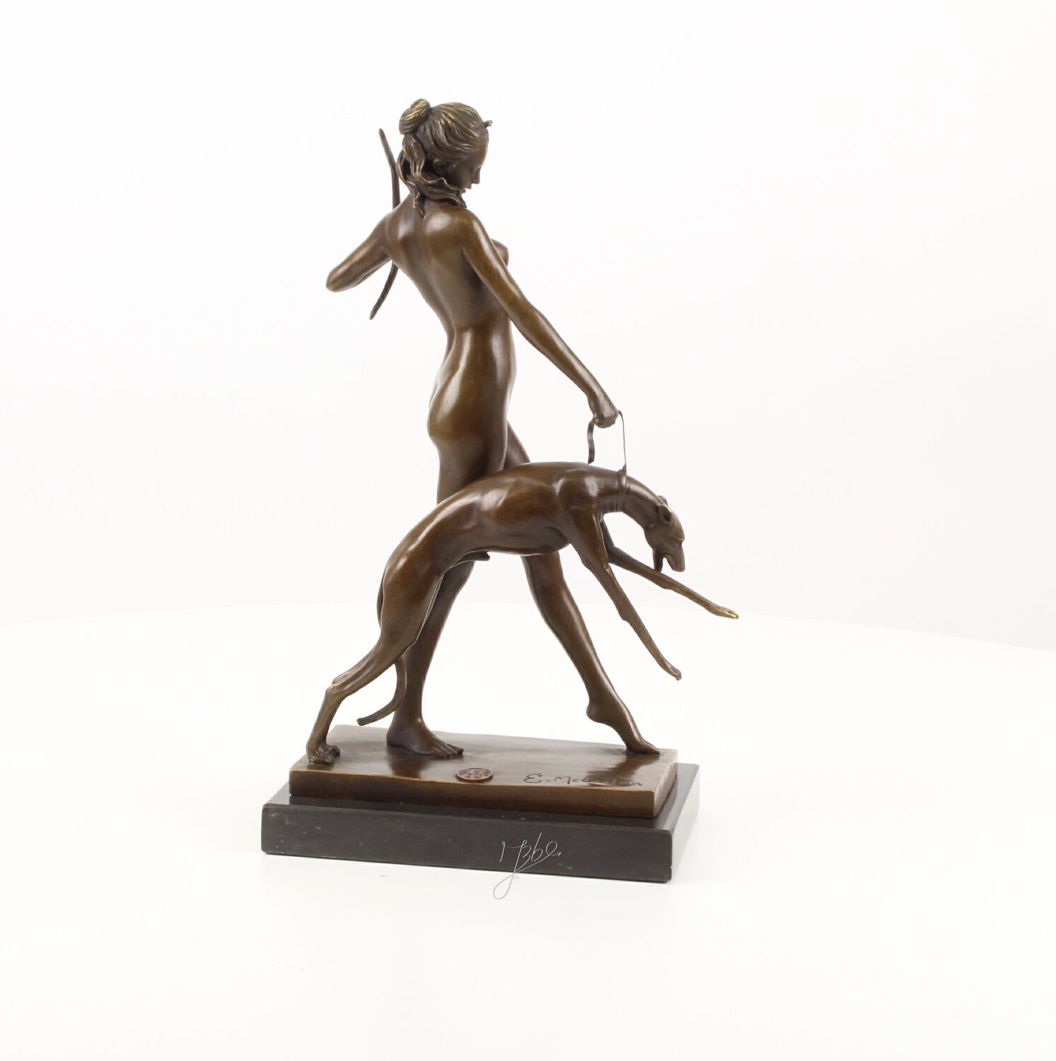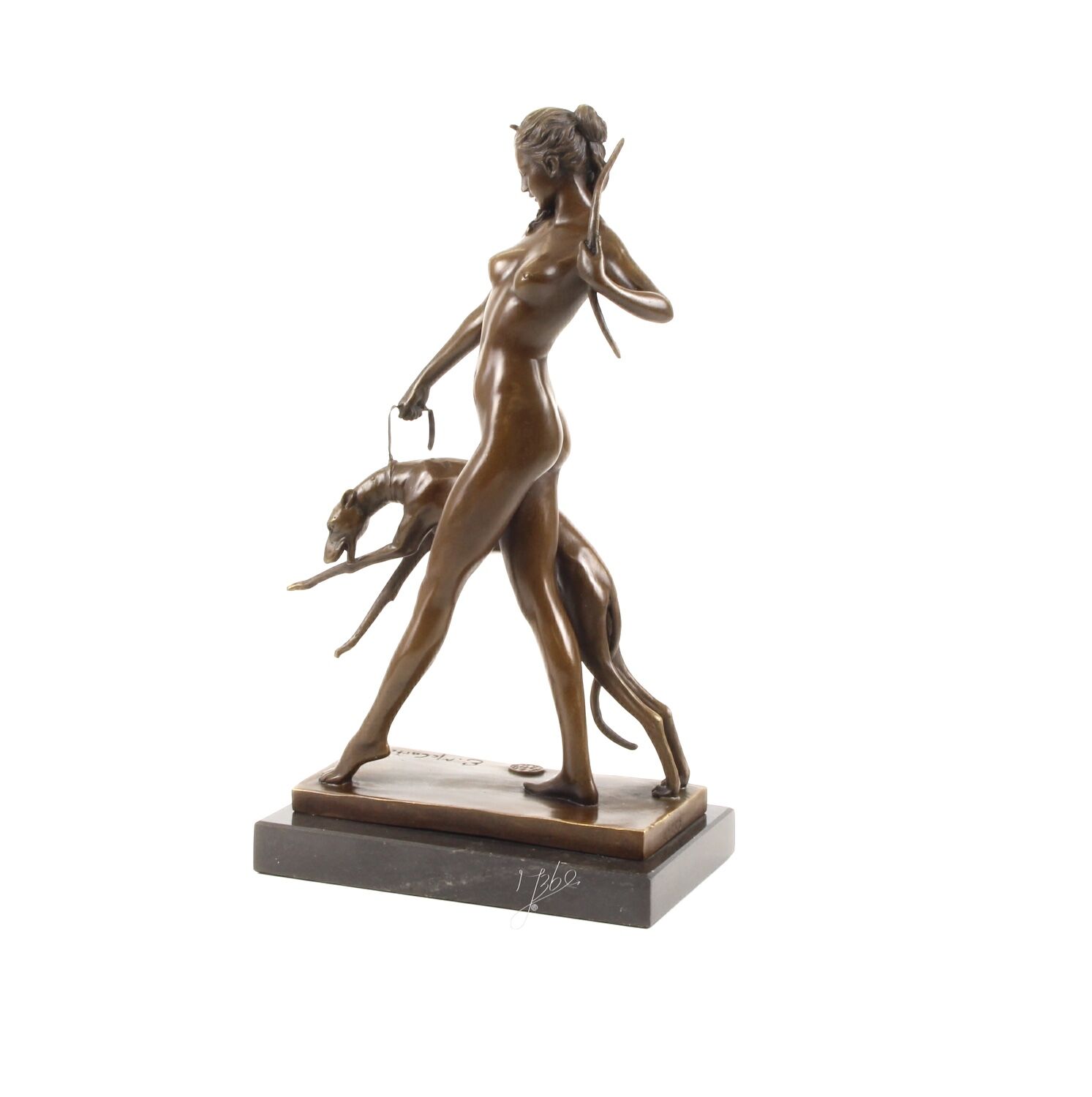 Die Bronzeplastik auf Steinsockel (32 cm) zeigt die Göttin Diana auf der Jagd. Mit der rechten Hand bändigt sie einen Jagdhund/Windhund, in der linken hält sie einen Bogen. Eine moderne Interpretation dieser mythologischen Situation des amerikanischen Bildhauers Edward McCartan (1879-1947), dessen Werke sich zwischen Neoklassizismus und Art déco bewegen. Sie erhalten eine originalgetreue Replik dieses eleganten Objekts.