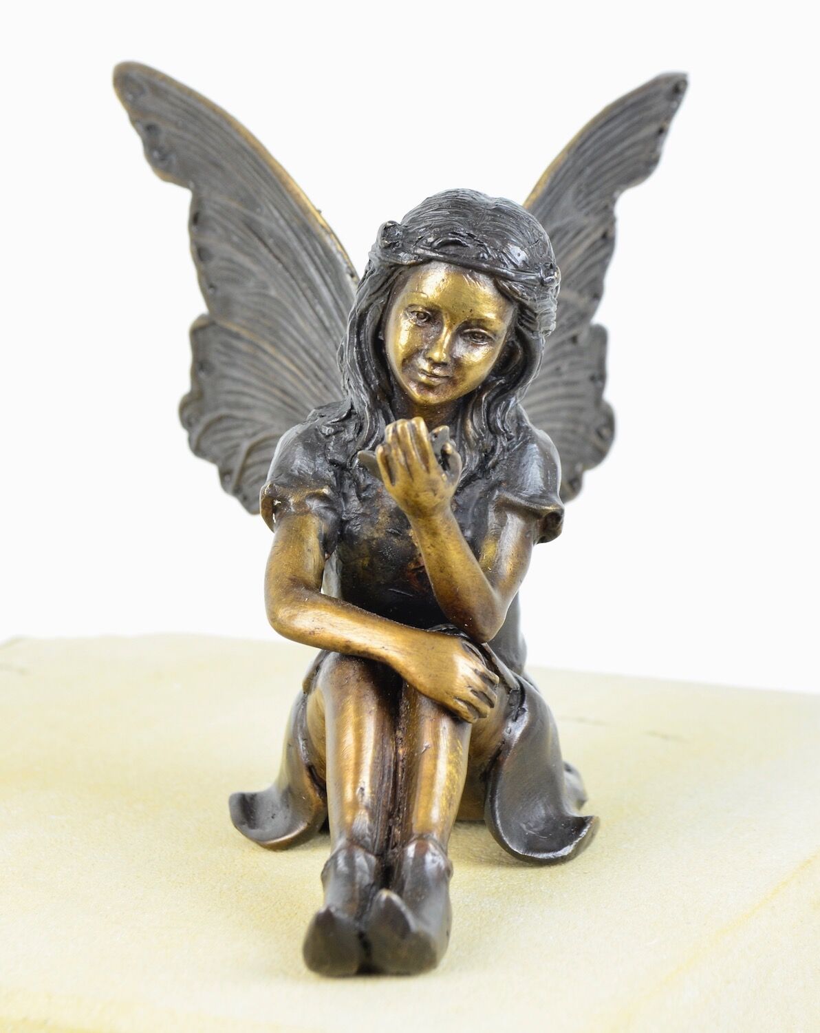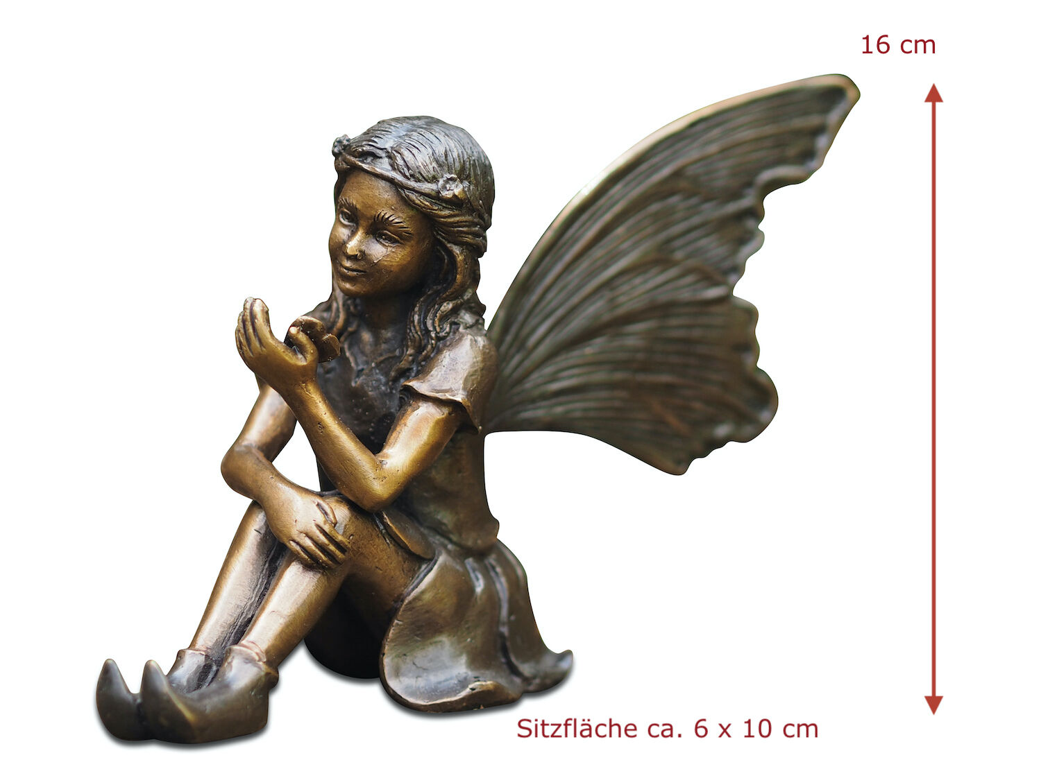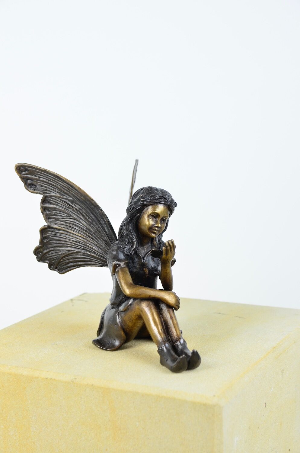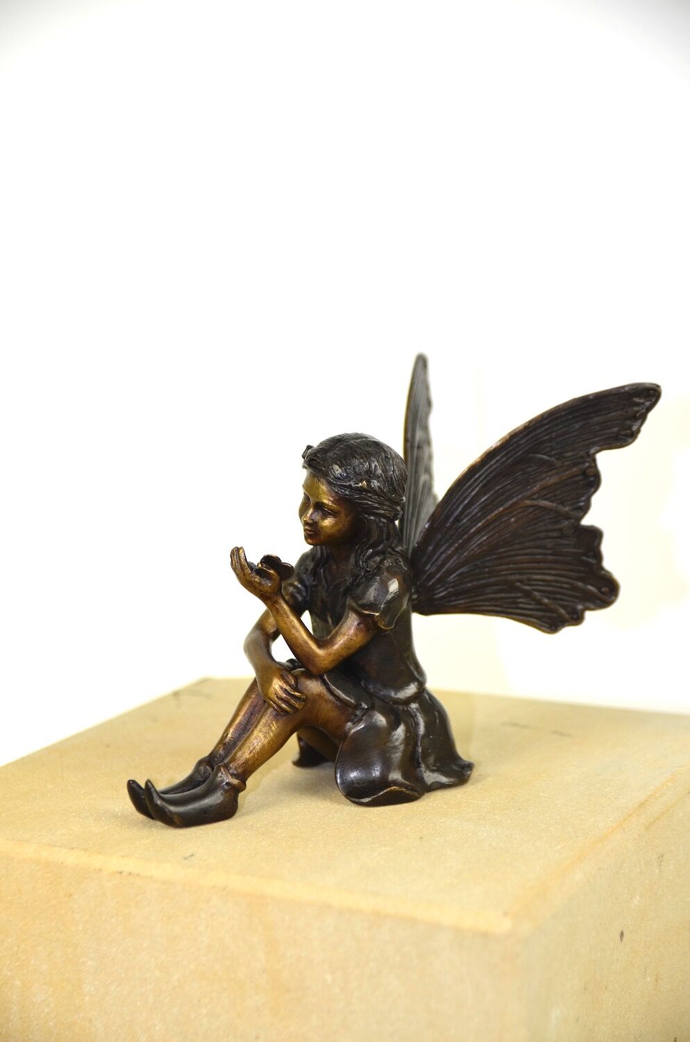 Bronzefigur einer reizenden kleinen Elfe (16 cm), die einen Schmetterling betrachtet, der auf ihrem linken Daumen gelandet ist. Sehr fein detaillierte gestaltete Bronzeplastik für drinnen und draußen.