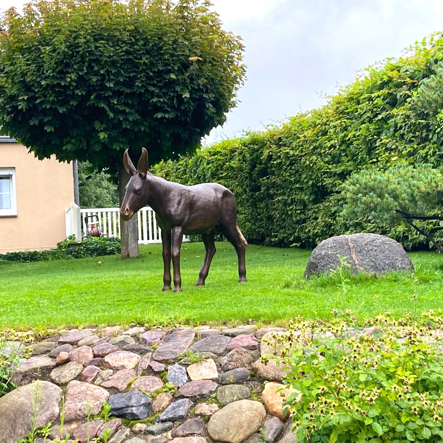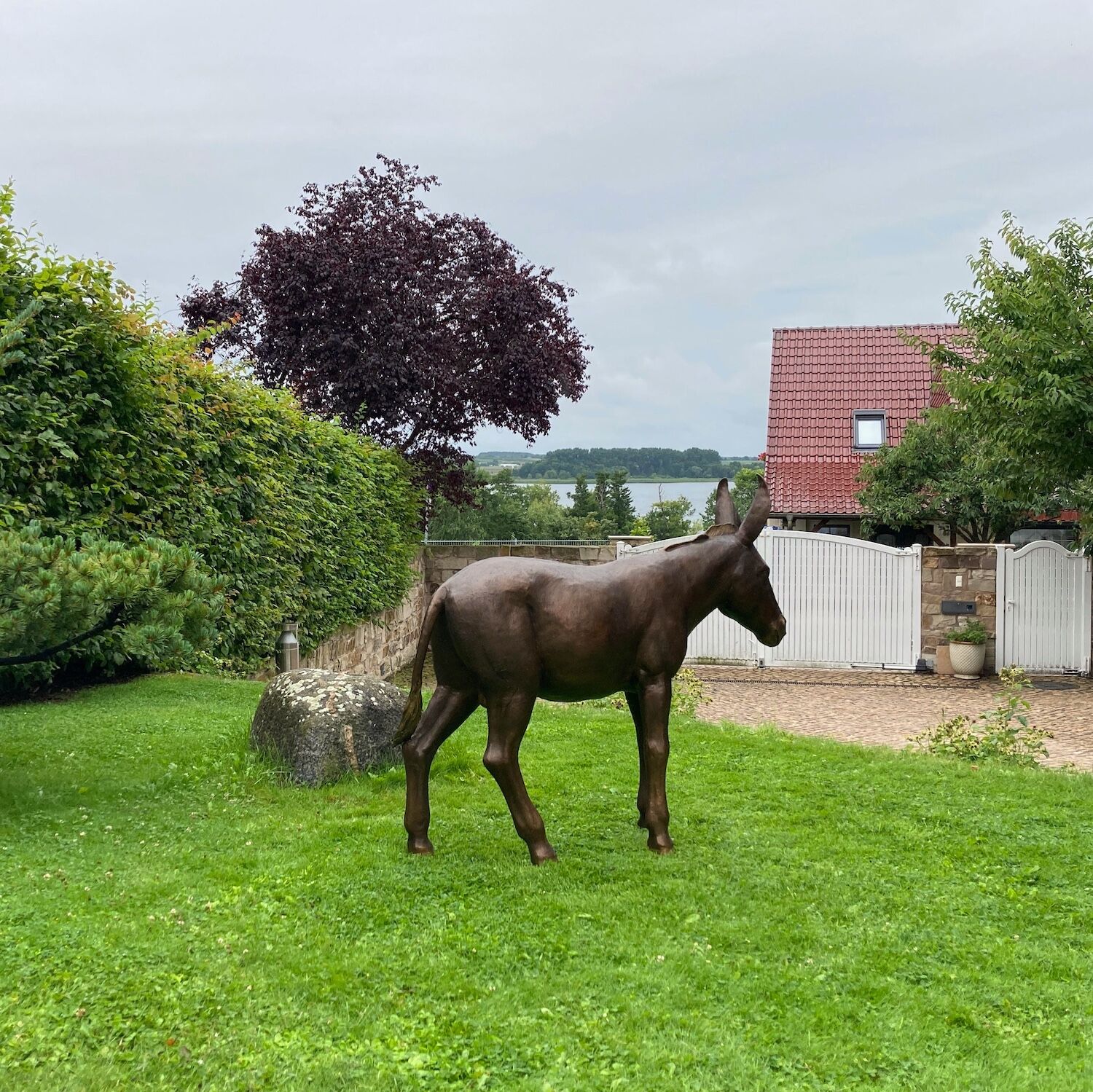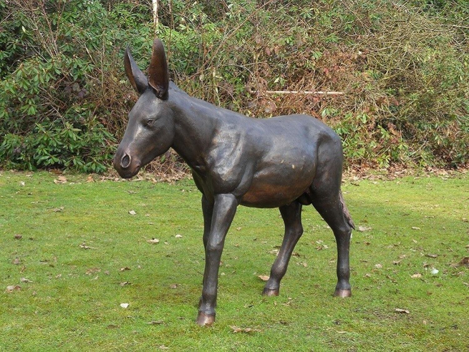 Stehender Esel aus patinierter Bronze (130 cm). Genau so könnte er stehen - in der Steppe, auf einer Hochebene oder bald in Ihrem Garten. Sie werden diese Bronzeplastik lieben, ob draußen im Garten oder drinnen in einem geräumigen Haus.