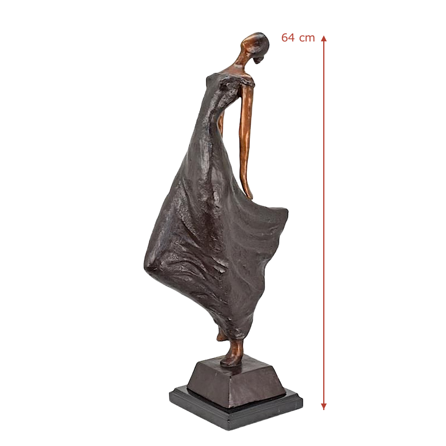 Mit zurückgeworfenem Kopf schreitet die Dame voran. Das angewinkelte rechte Bein verharrt schwebend. Das Kleid der zweifarbig patinierten Bronzefigur (64 cm auf Steinsockel) zeichnet den schlanken Körper ab und bildet hinten einen Schweif. Eine präzise, künstlerisch abstrahierte Studie einer tanzenden Frau. Pure Eleganz in Bronze für Haus oder Garten.