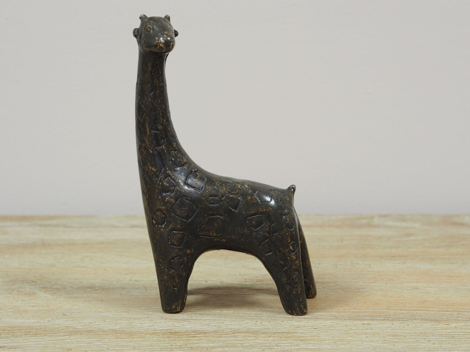 Darstellung einer archaisch anmutenden Giraffe aus patinierter Bronze (17 cm). Sie wirkt stilisiert, verfügt aber über alles, was eine Giraffe zur Giraffe macht. Eine ruhige kompakte Bronzeplastik für draußen und drinnen.