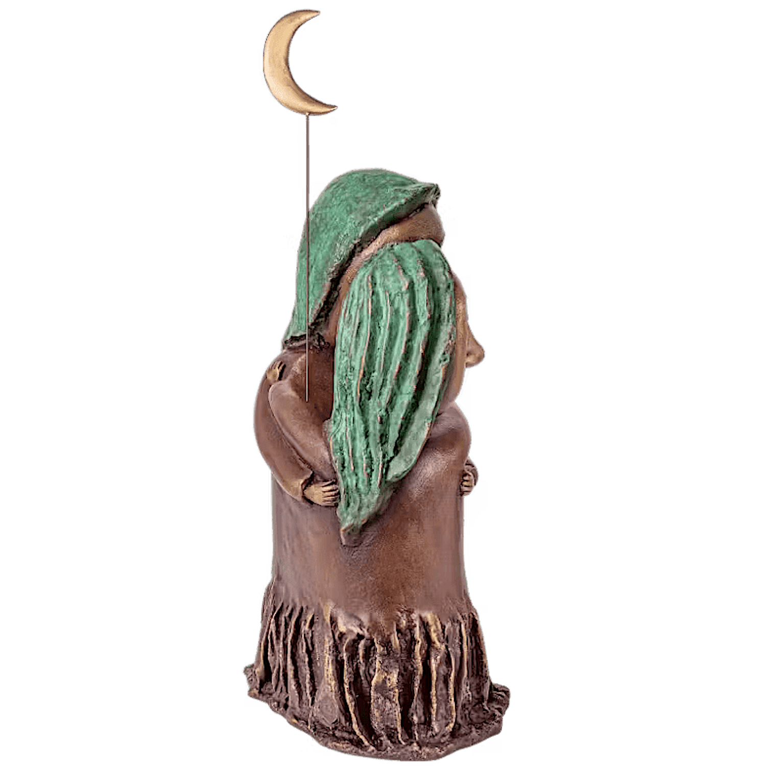 Ein innig vereintes Paar unter einer Mondsichel. Unterhalb der Arme verschmelzen sie einem Baumstamm gleich - und scheinen Wurzeln zu schlagen. Die romantische, fast kindlich reine Anmutung dieser Bronzeplastik (33 cm) berührt.