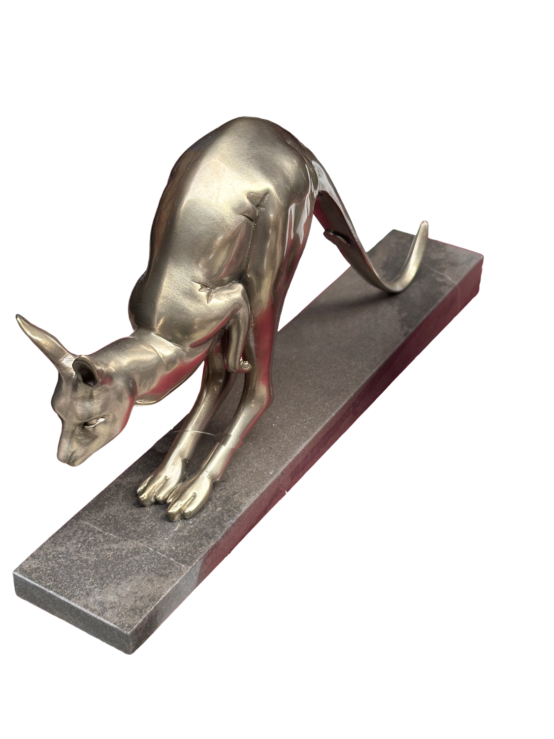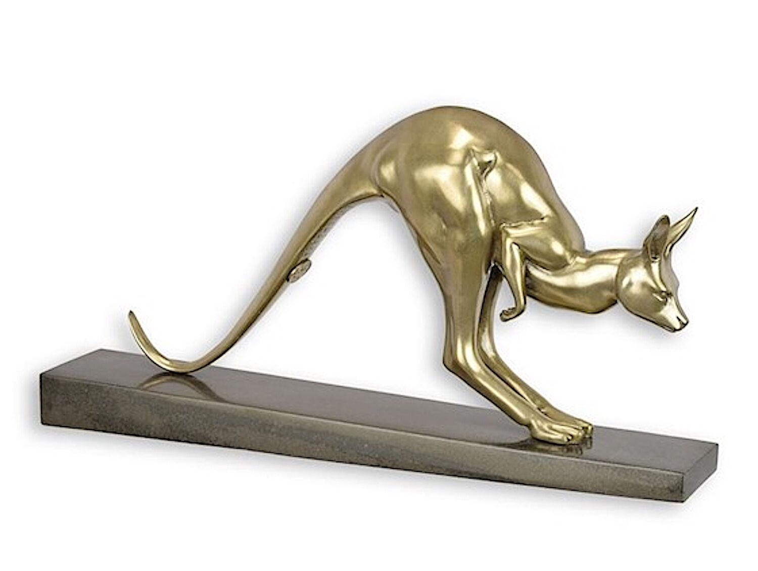 Ein hüpfendes Känguru als versilberte Bronzeplastik auf einem schmalen länglichen Natursteinsockel (32 cm). Eine stilisierte Darstellung des Tieres in einer arttypischen Bewegung. Eine hochwertige kompakte Bronzeplastik für draußen und drinnen.