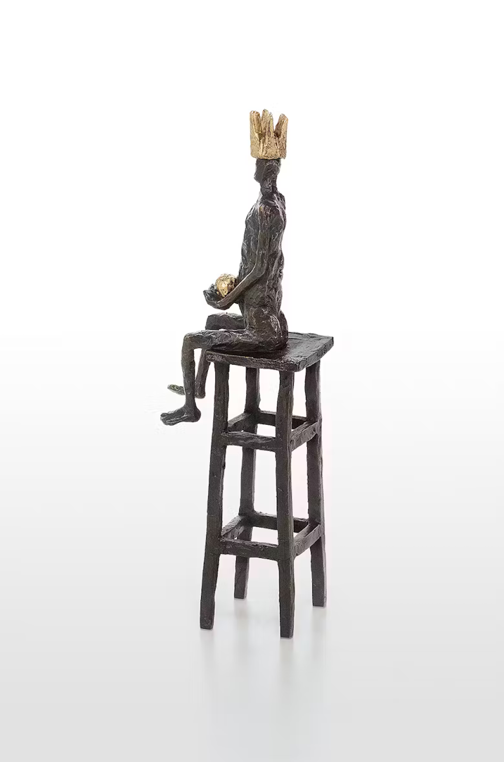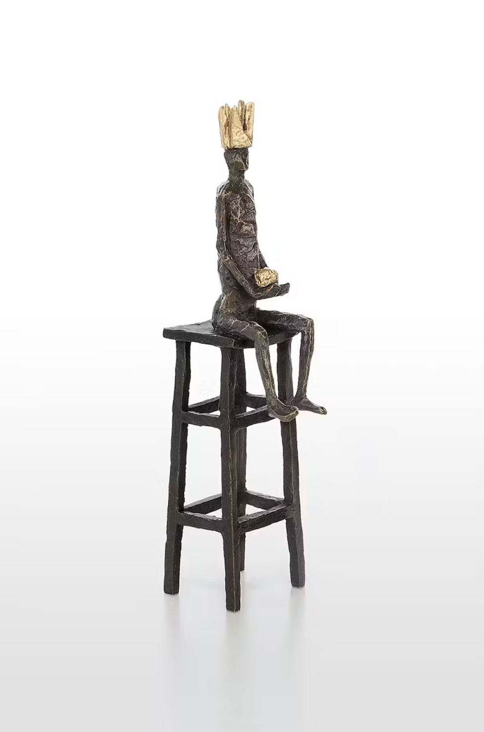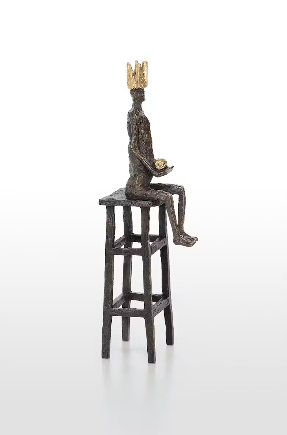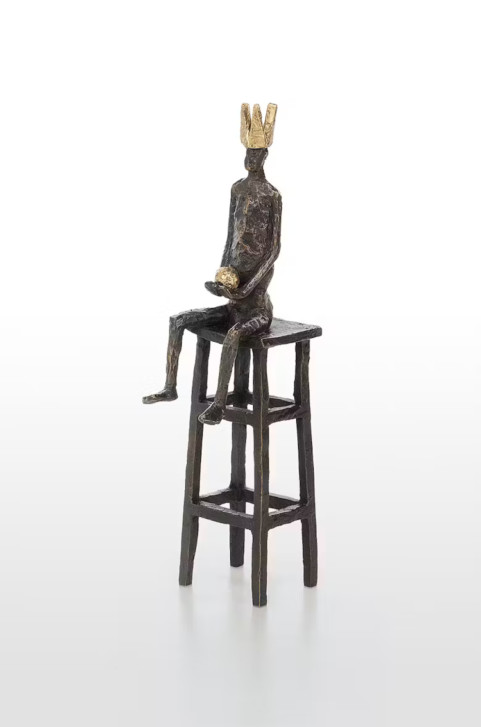 Ein auf einem hohen Hocker sitzender kleiner König mit goldener Krone, der eine goldene Kugel in Händen hält. Die 25 cm hohe Bronzeplastik gehört zu einer Serie sitzender Gestalten. Die weitgehend abstrakt und gesichtslos gehaltenen Figuren erhalten ihre Wirkung allein durch die Körpersprache, die sie und ihre Rolle präsentieren. Die Figur ist auch als Set gemeinsam mit der "Kleinen Königin" erhältlich.