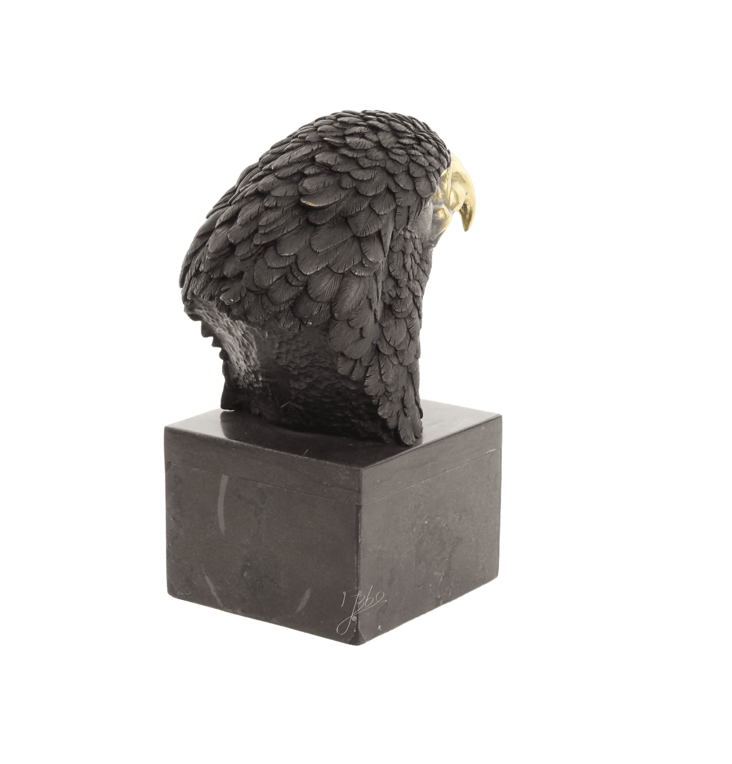 Äußerst detaillierte Abbildung eines Adlerkopfs aus schwarz patinierter Bronze. Jede Feder ist fein zisliert, die Augen wirken lebendig, der Schnabel ist blank poliert. Der Bronzeplastik ist auf einem schwarzen Natursteinsockel befestigt und misst insgesamt 27 cm Höhe.