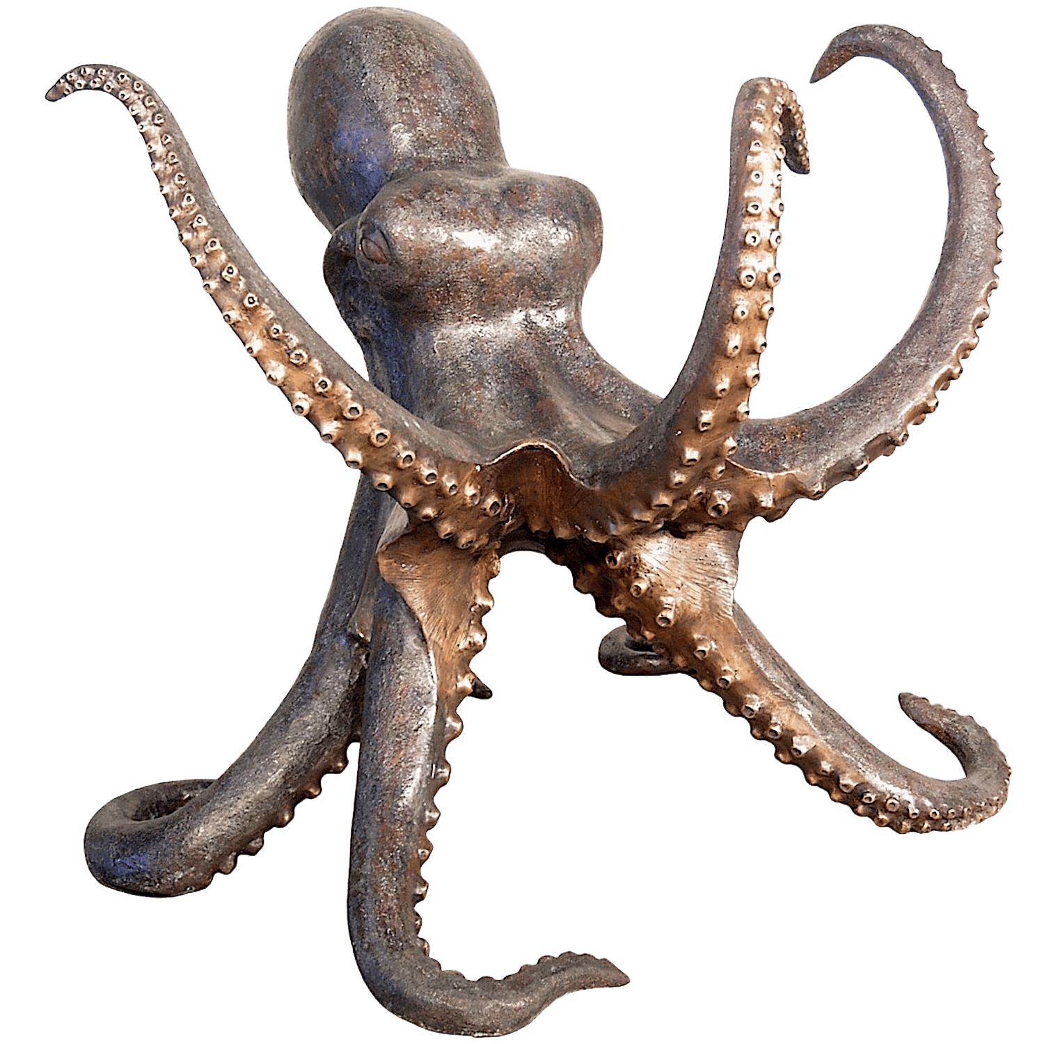 Gewaltige Krake aus patinierter Bronze. Der Kopf und die acht Arme des Tintenfisches/Oktopus sind äußerst detailliert naturnah modelliert. Mit seinen 76 cm Breite und einem Gewicht von 22 kg ein wirklich beeindruckendes Exemplar, das an einem Pool, einem Teich oder im SPA-Bereich für Furore sorgt.
