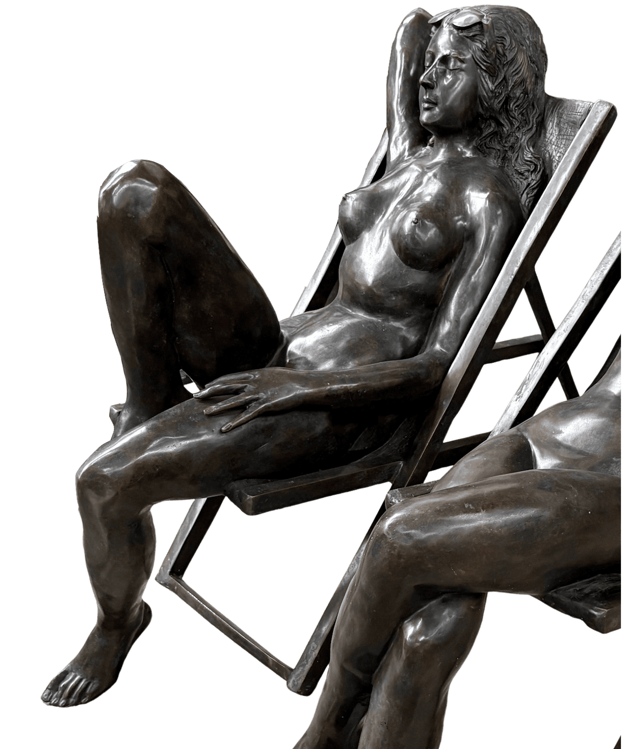 Lebensgroße Studie einer Frau in einem Sonnenstuhl/Liegestuhl aus patinierter Bronze (130 cm). Sie nimmt unbekleidet ein Sonnenbad. Der rechte Arm hängt über dem Kopfteil des Stuhls, der linke ruht auf ihrem Oberschenkel. Das rechte Bein ist angewinkelt, der rechte Fuß stützt sich auf den Rand des Liegestuhls. Ihre Augen sind geschlossen, ihre Sonnenbrille ist auf die Stirn geschoben. Sie macht, wie beim Sonnenbad üblich, einen sehr entspannten Eindruck. Eine sehr lebensnahe und fein modellierte Bronzeplastik, die, im Garten oder auf einem großen Balkon stehend, von Ferne täuschend echt wirkt - und auch von Nahem ihre Reize hat. Auch in einer Sauna, am Pool oder einem Spa findet diese Bronzeplastik einen guten Platz. Eine elegante Bronzeplastik für Innen- und Außenbereiche.