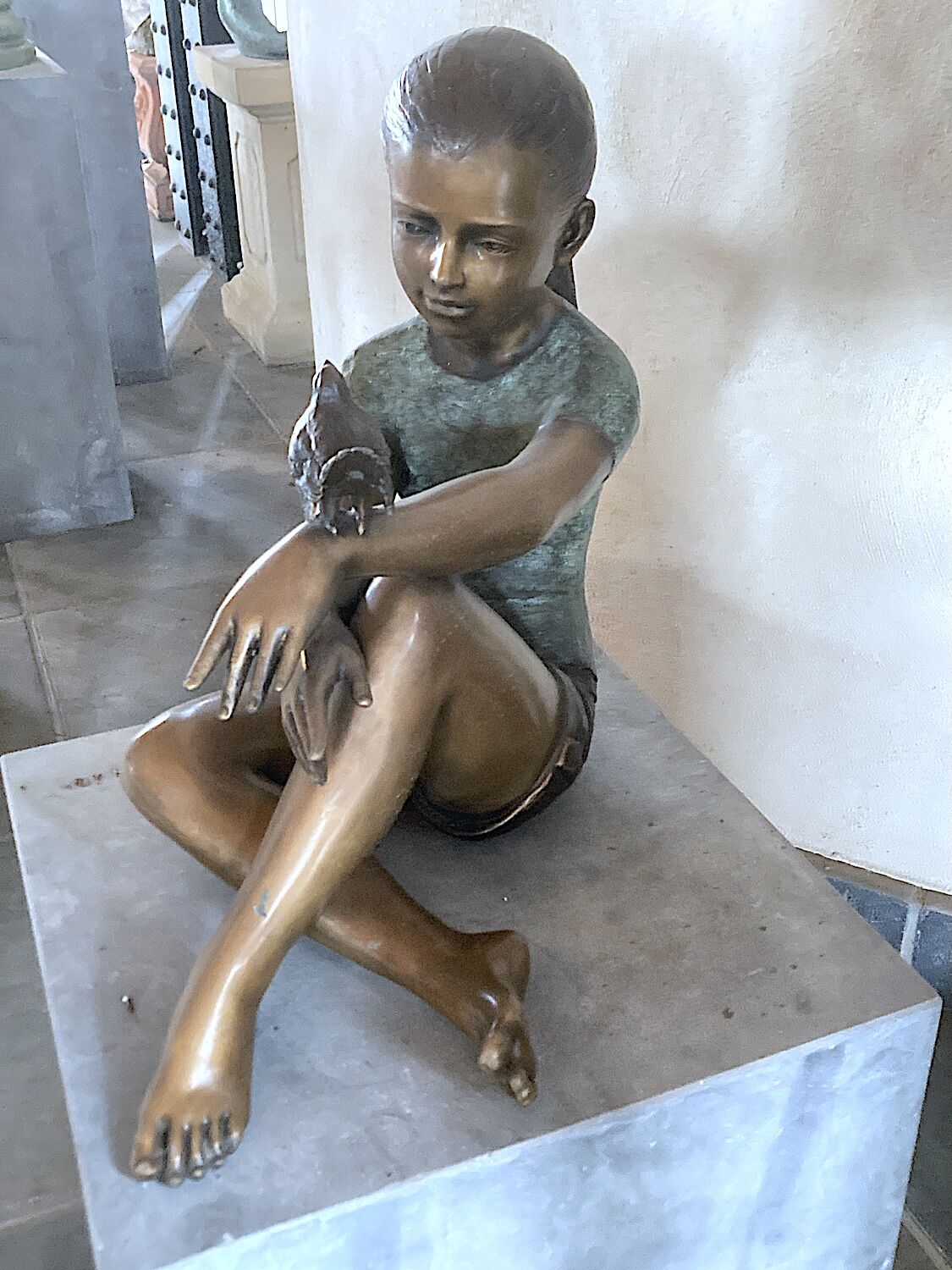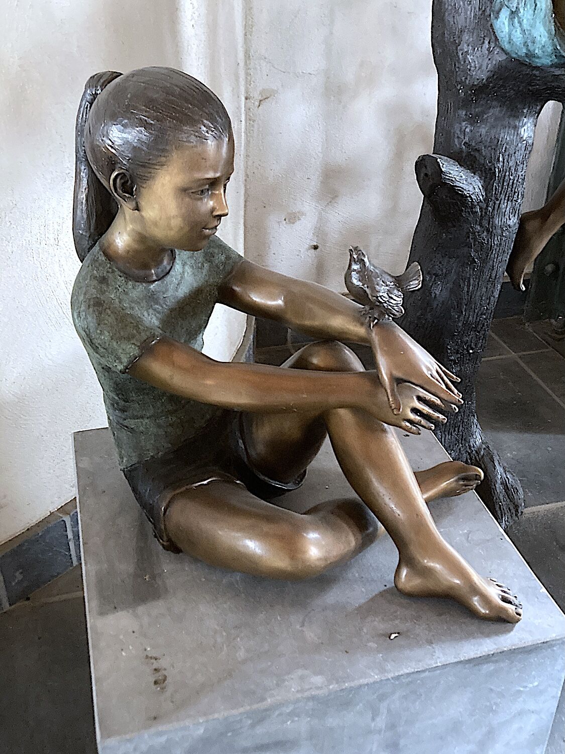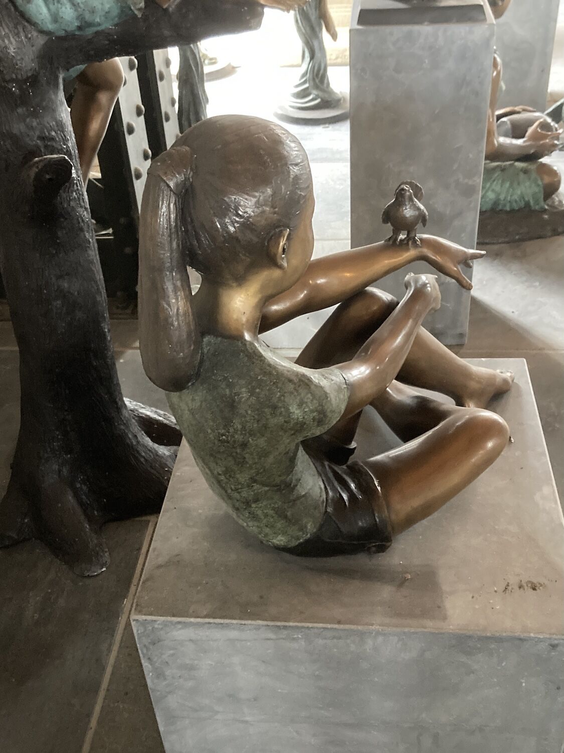 Mehrfarbig patinierte Bronzefigur (53 cm) eines sitzenden Mädchens in Shorts und blauem T-Shirt. Auf ihrem linken Arm sitzt ein zwitschernder Vogel, den sie behutsam beobachtet. Eine liebevolle Bronzeplastik und realistische Studie eines naturliebenden Mädchens für außen und innen.