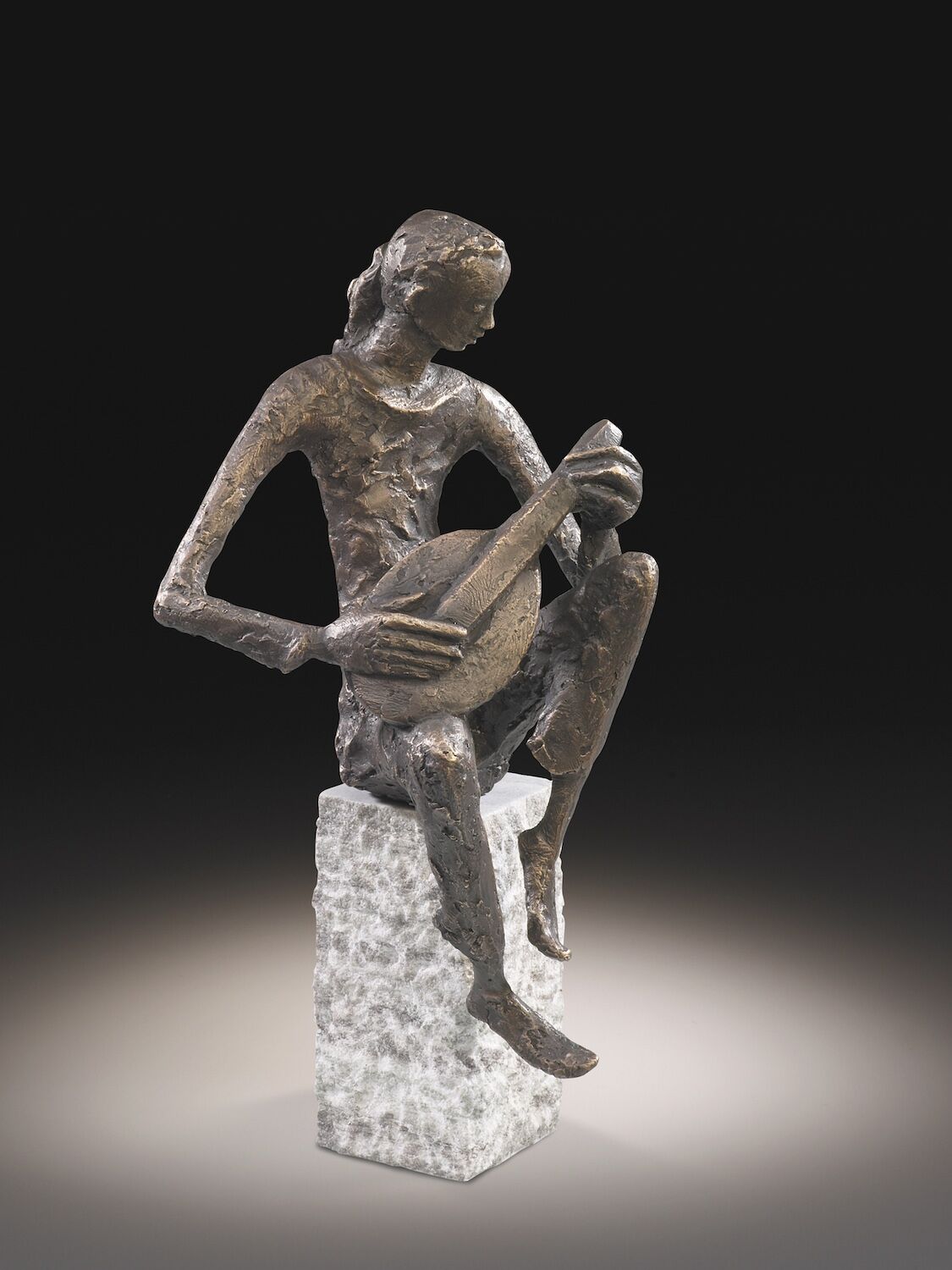 Innige Darstellung einer Lautenspielerin aus patinierter Bronze (53 cm). Die Bronzeplastik sitzt auf einem bossierten Marmorsockel und ist fest mit diesem verbunden. Die Bronzeplastik ist auf 99 Exemplare limitiert.