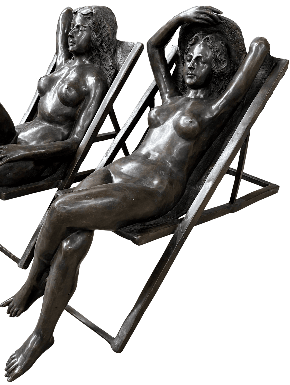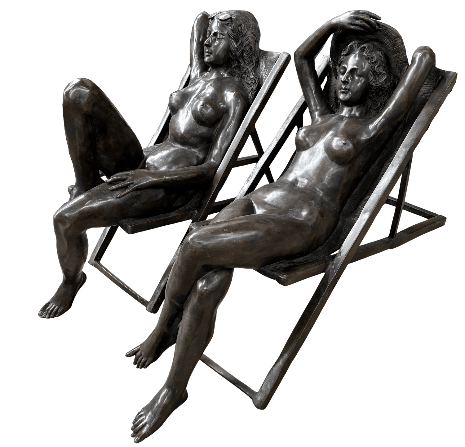 Lebensgroße Studie einer Frau in einem Sonnenstuhl/Liegestuhl aus patinierter Bronze (153 cm). Sie nimmt unbekleidet ein Sonnenbad. Beide Arme sind angehoben. Mit der rechten Hand richtet sie ihren Sonnenhut. Der linke Arm liegt über dem Kopfteil des Stuhls. Ihre Beine sind übereinander geschlagen. Ihre Augen sind geschlossen. Sie vermittelt einen sehr entspannten und glücklichen Eindruck. Eine sehr lebensnahe und fein modellierte Bronzeplastik, die, im Garten oder auf einem großen Balkon stehend, von Ferne täuschend echt wirkt - und auch von Nahem ihre Reize hat. Auch in einer Sauna, am Pool oder einem Spa findet diese Bronzeplastik einen guten Platz. Eine elegante Bronzeplastik für Innen- und Außenbereiche.