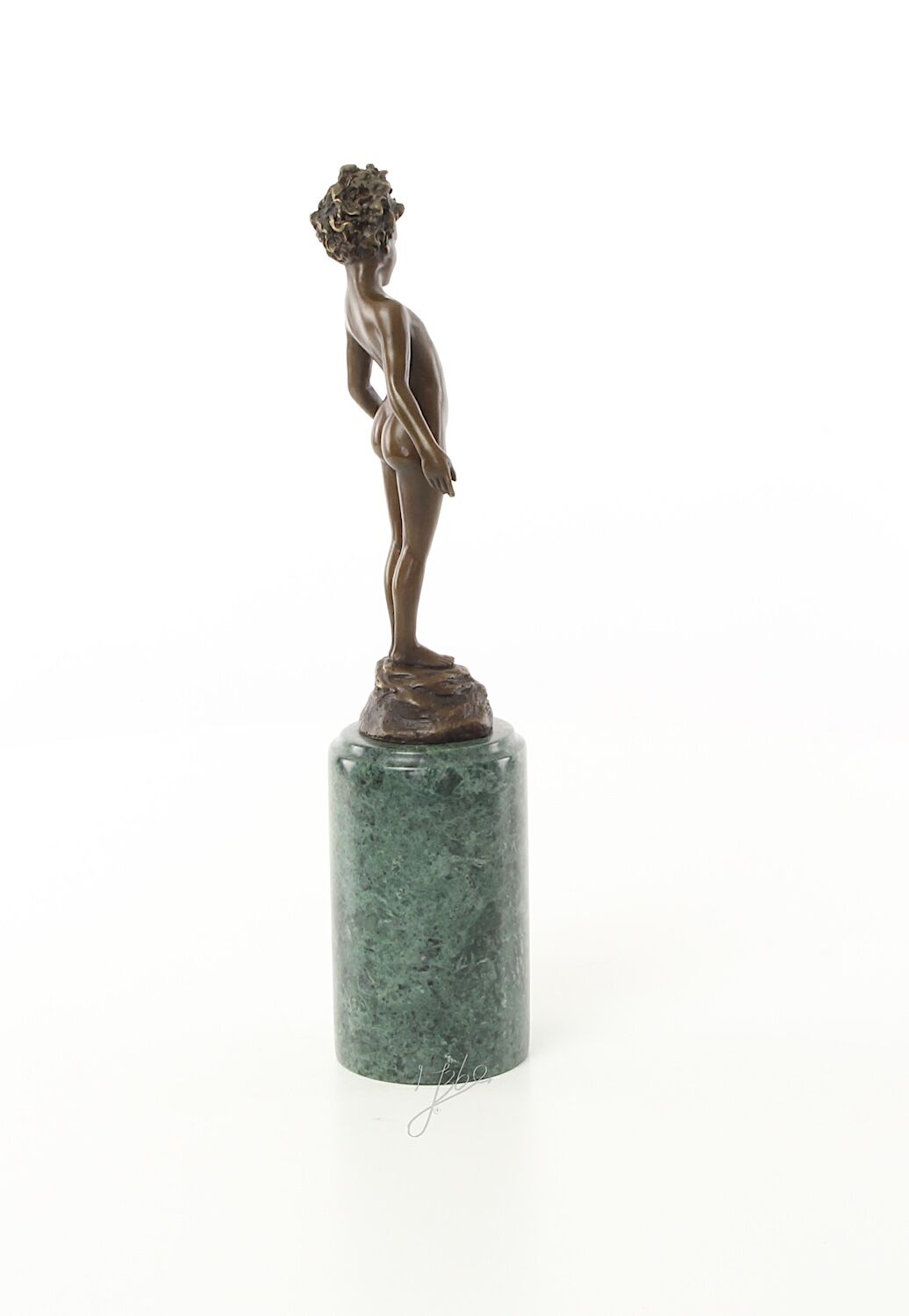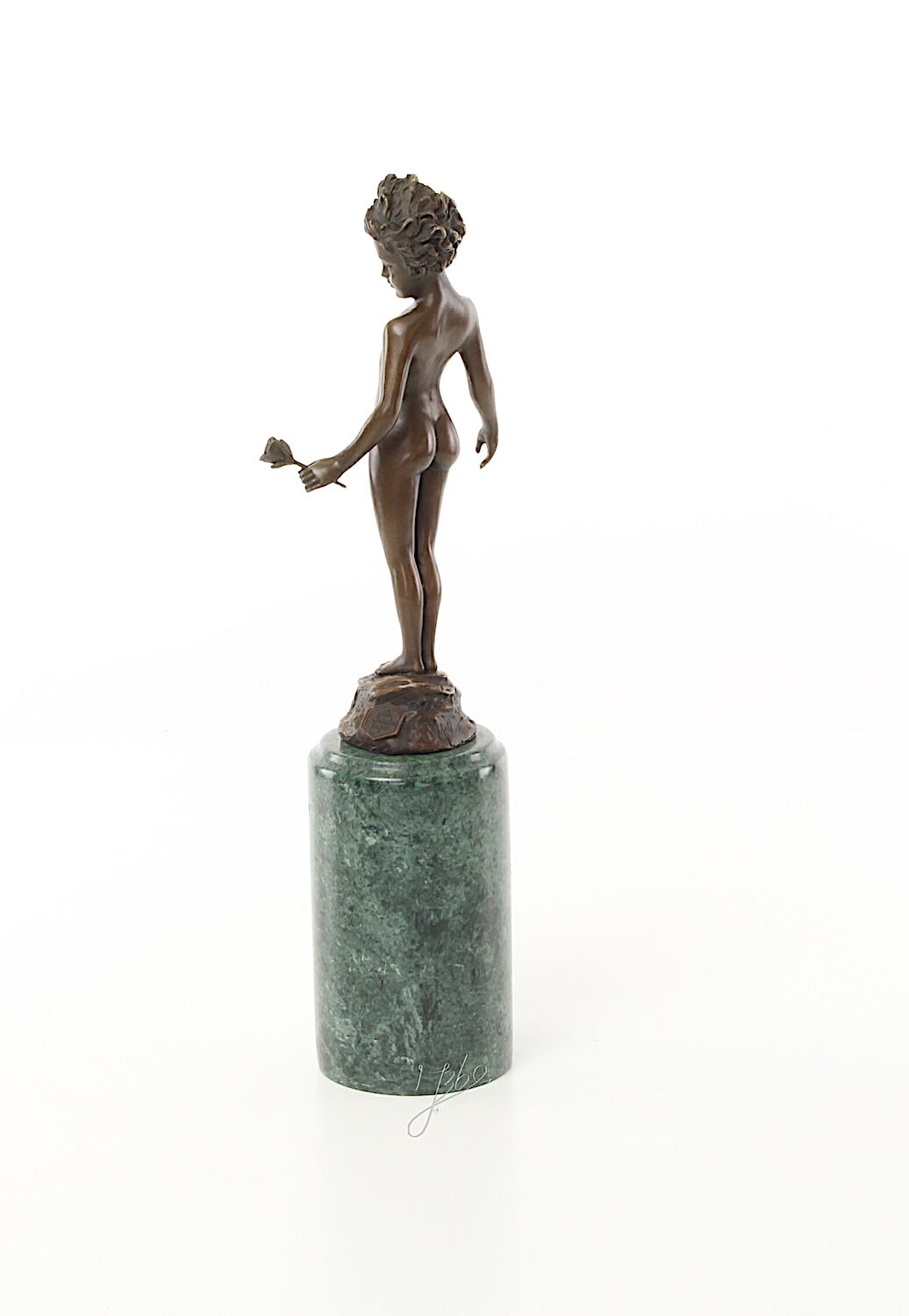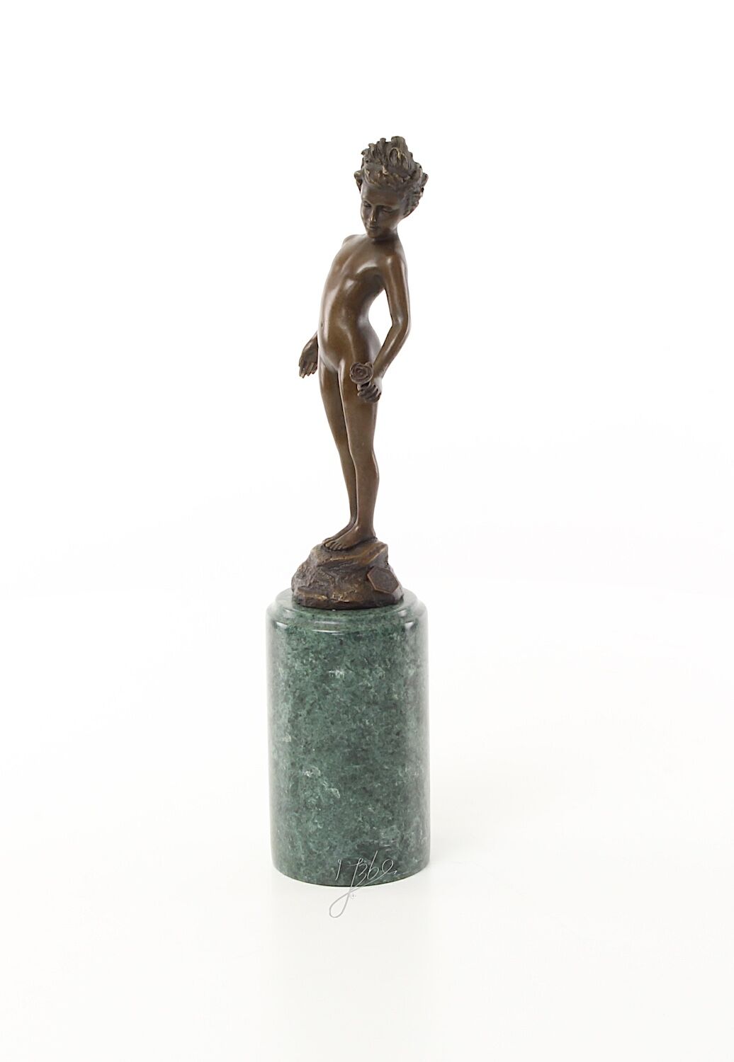 Klassische Darstellung eines unbekleideten Mädchens aus Bronze auf Steinsockel (insgesamt 26 cm). In der linken Hand hält sie eine Rose, auf die das Mädchen versonnen blickt.