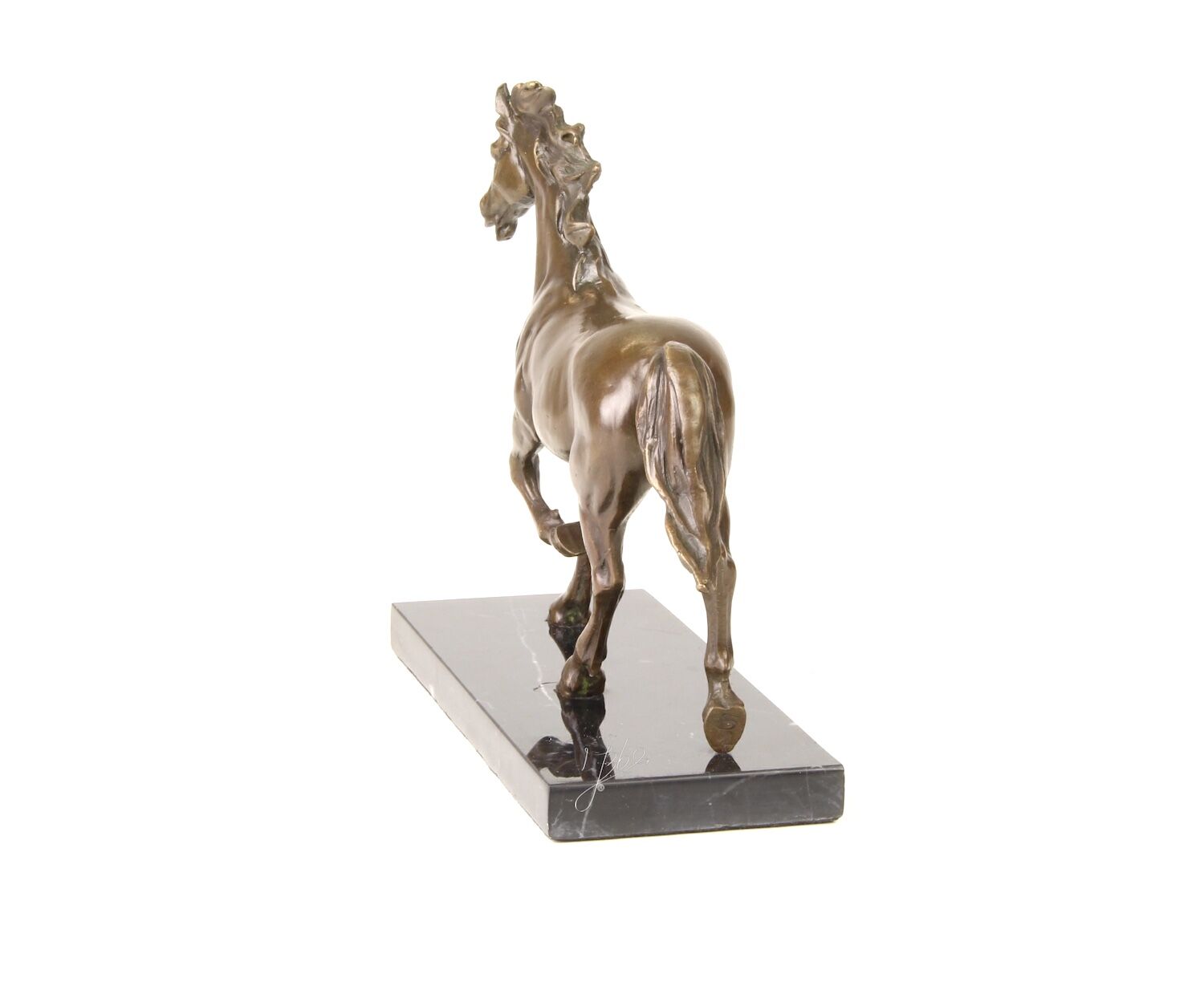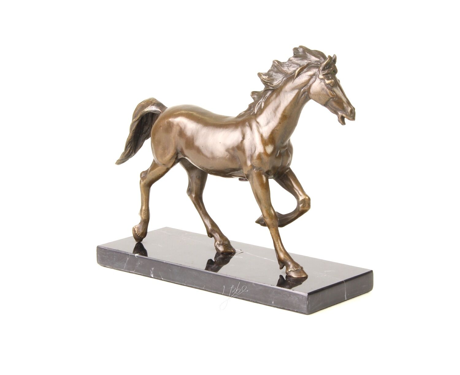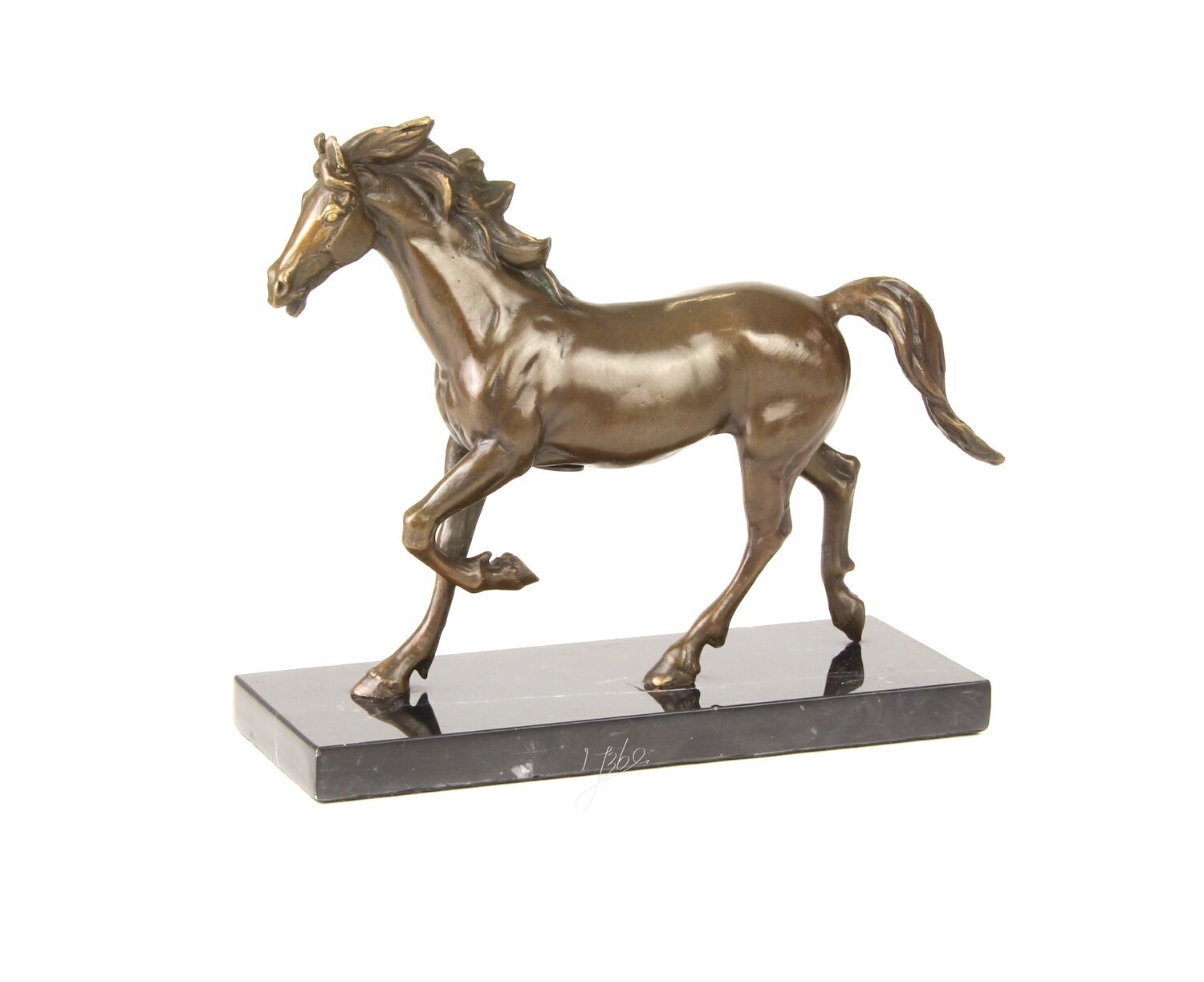 Kleine Bronzefigur (23 cm) eines trabenden Pferdes in anmutiger Pose mit angehobenem Vorderbein auf Steinsockel. Eine naturgetreue Studie für alle Freundinnen und Freunde dieser großartigen Tiere.