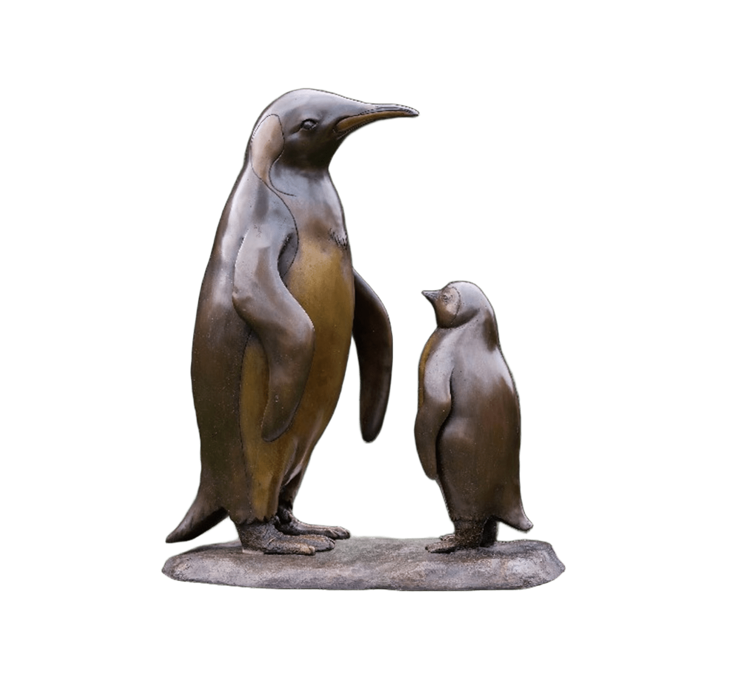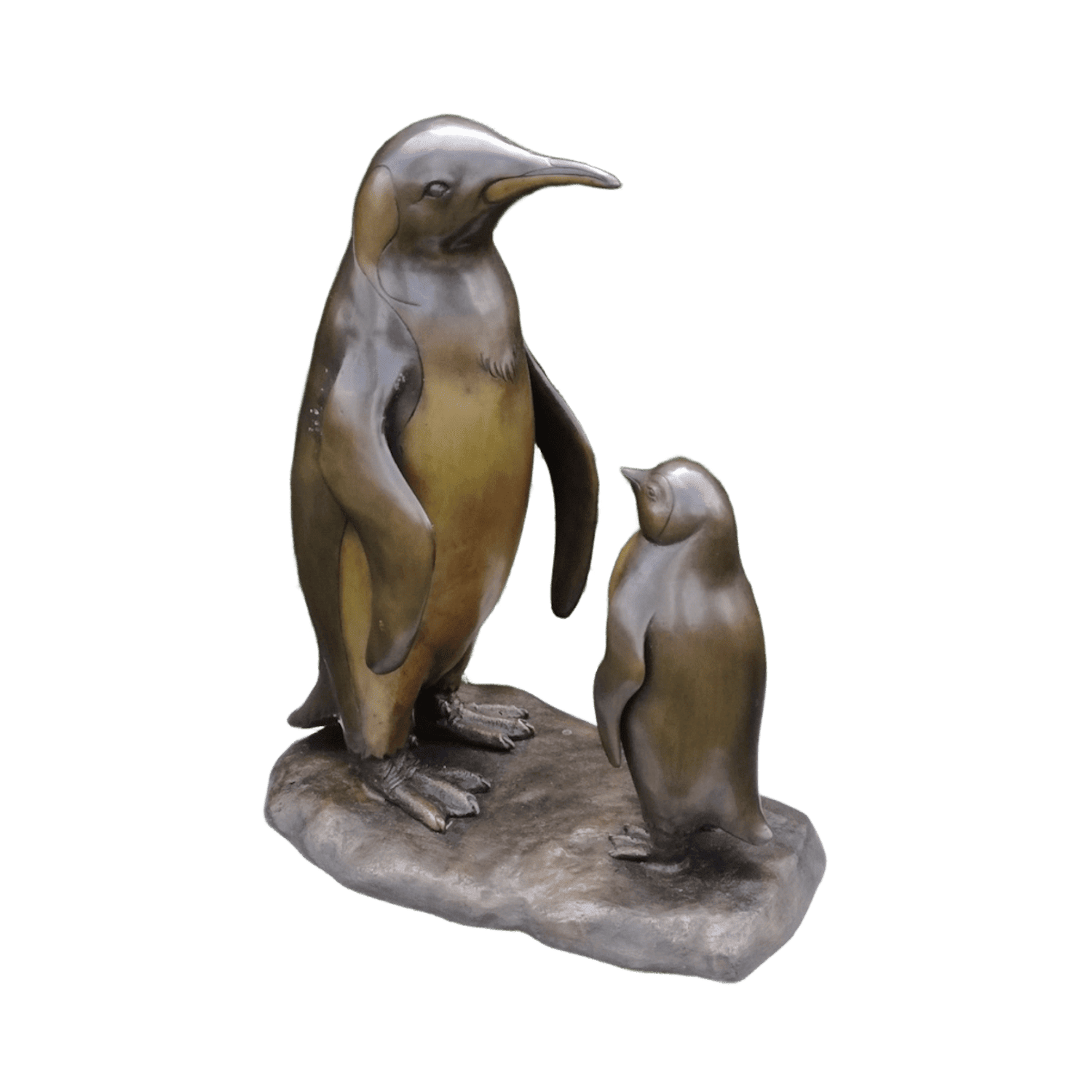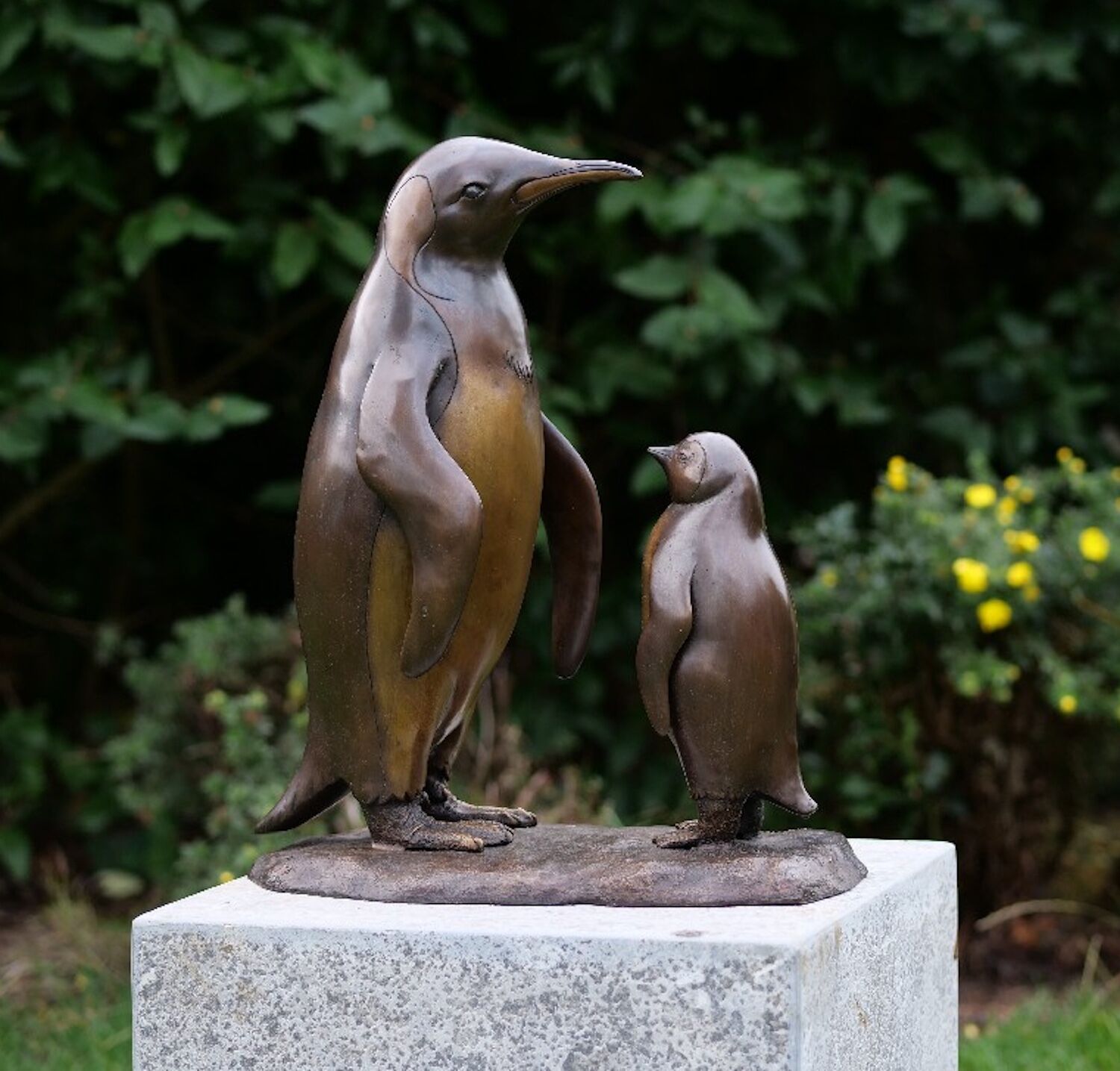 Eine Pinguinmutter steht neben ihrem Jungen auf einer Eisscholle. Die Tiere aus zweifarbig patinierter Bronze (45 cm breit) sind lebensnah modelliert und wirken sehr realistisch. Eine hochwertig gearbeitete Bronzeplastik, an der Sie draußen im Garten, an Pool oder Teich oder drinnen im Haus viel Freude haben werden.