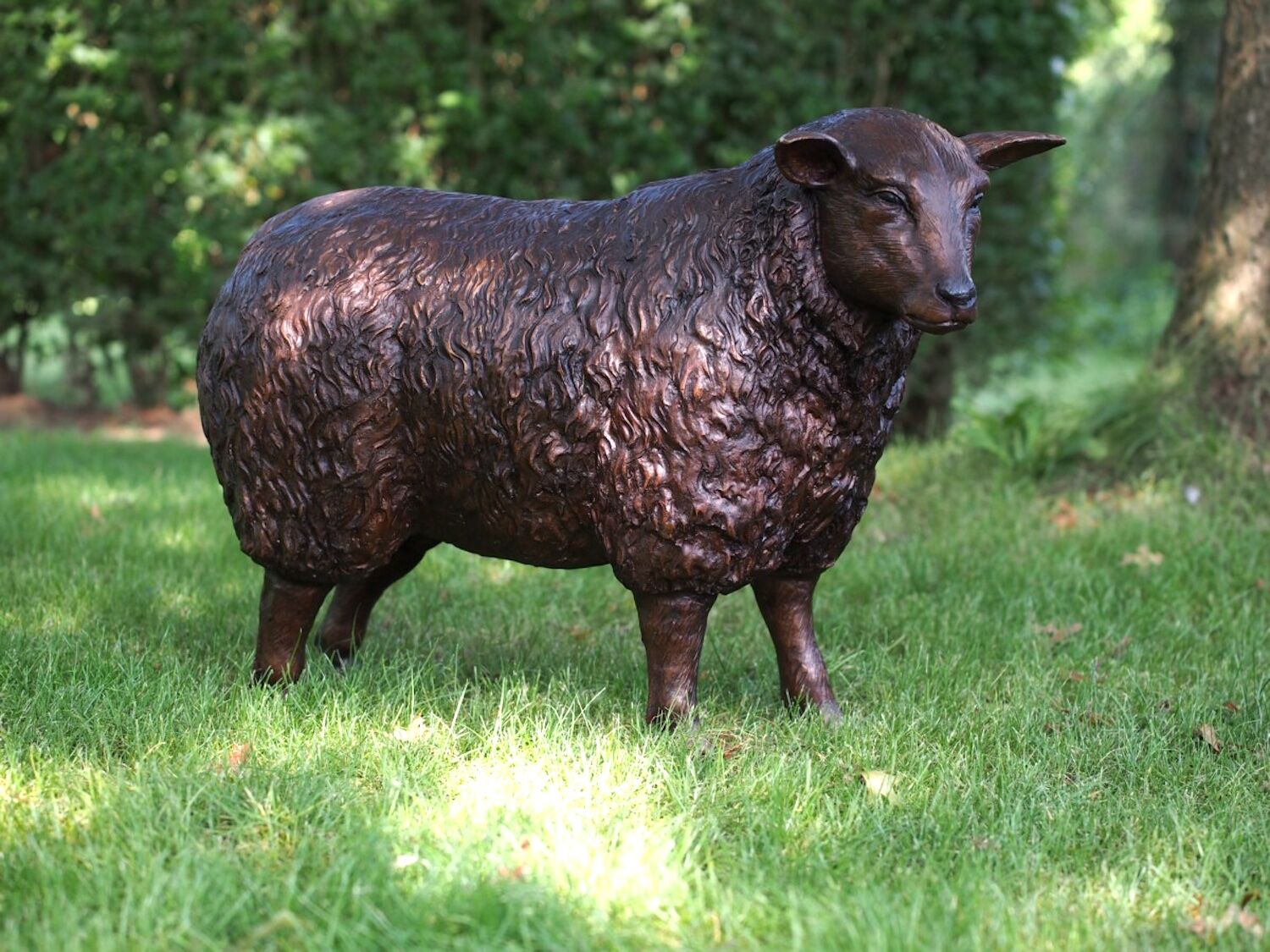 Konzentriert schauendes Schaf aus patinierter Bronze (80 cm). Eine sehr nah am tierischen Original angelehnte Bronzeplastik, die zu Bestaunen einfach Freude macht. Die prächtige Wolle ist so plastisch modelliert, dass man sie am Liebsten herzen möchte. Wunderbar auch als Familie mit Schafbock BONGO und Lamm BONDY.