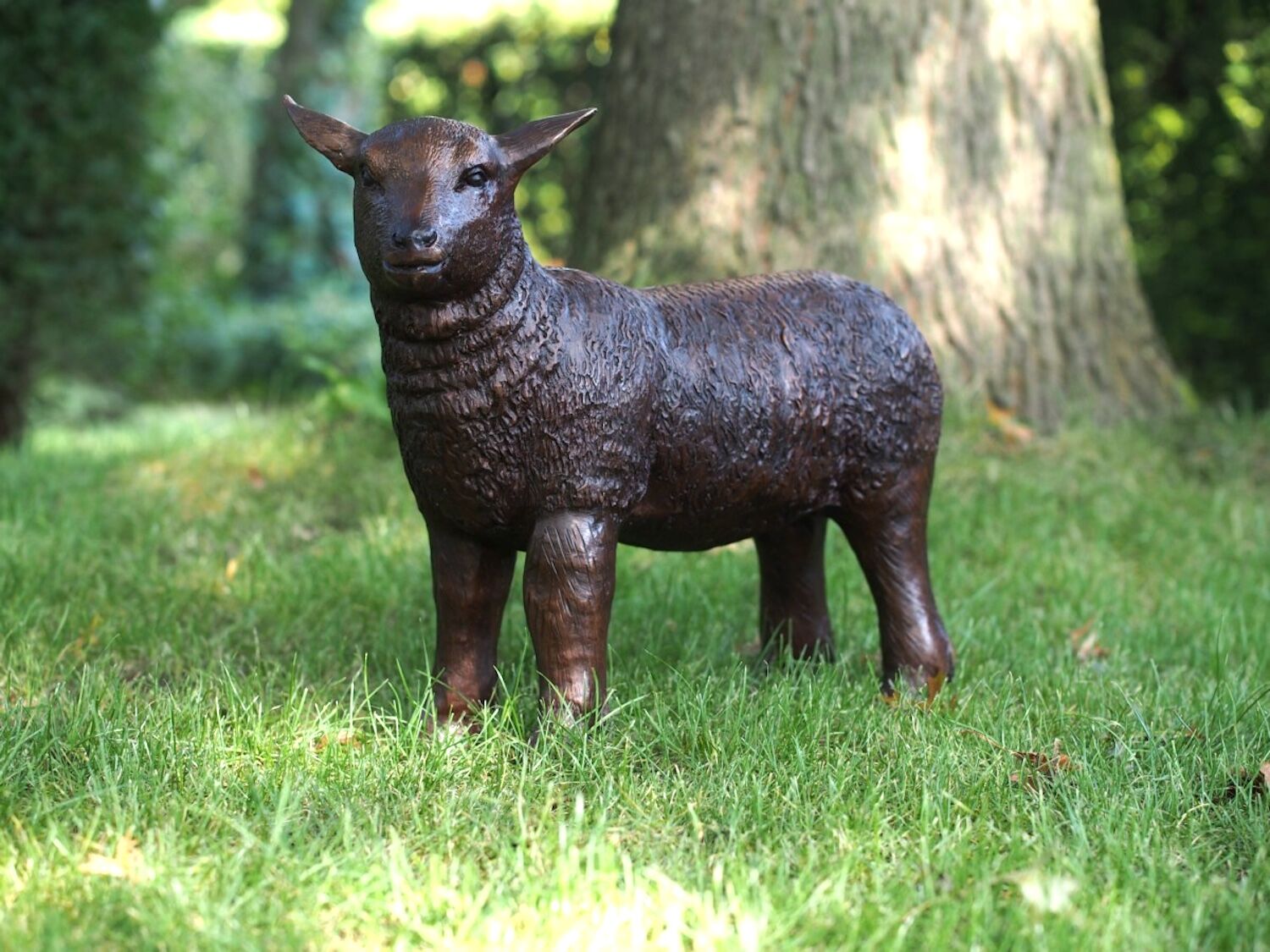 Anmutiges junges Schaf (Lamm) aus patinierter Bronze (50 cm). Es steht ruhig auf seinen vier Beinen und schaut aufmerksam in die Ferne. Eine beruhigende und berührende Bronzeplastik, die in einem Garten eine sanfte Aura schafft. Sehr schön im familiären Verbund mit Schaf BONNY und Schafbock BONGO.