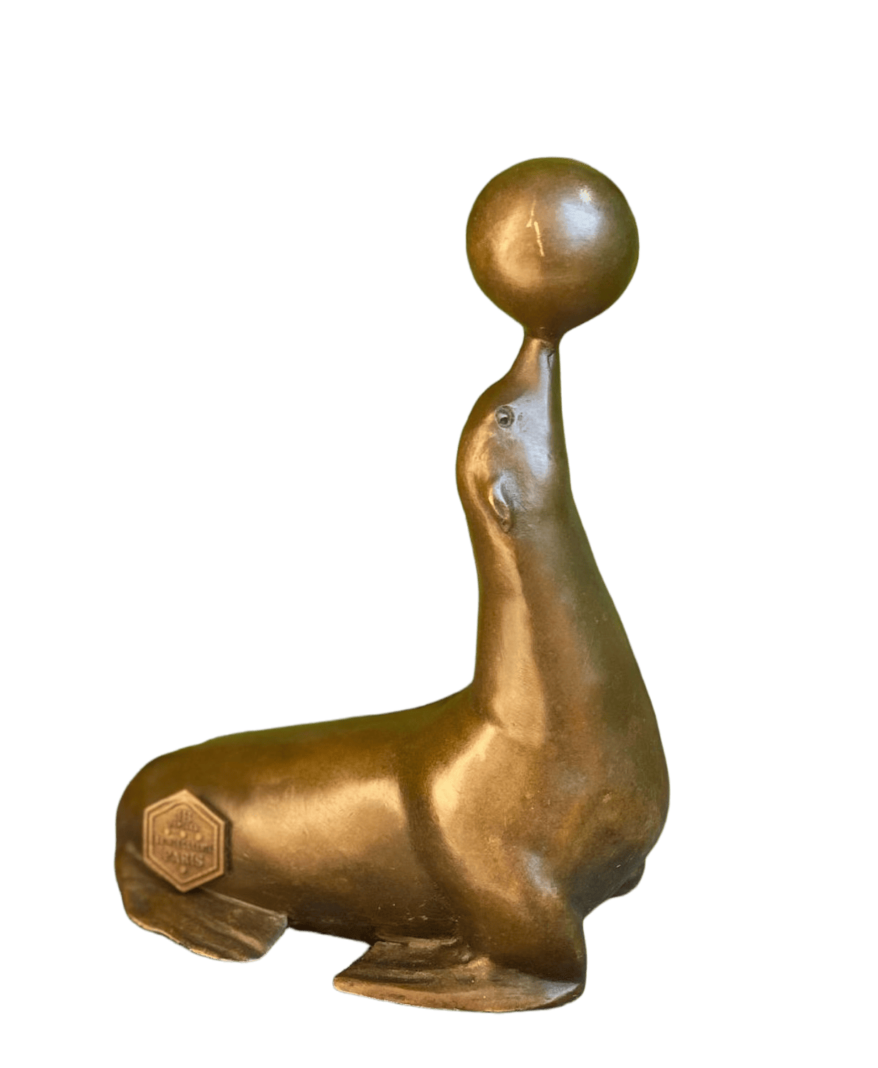 Modern stilisierte Darstellung eines Seelöwen, der einen Ball auf der Schnauze balanciert. Die Bronzeplastik dieses Seehunds/Robbe gefällt in Haus und Garten, drinnen wie draußen.