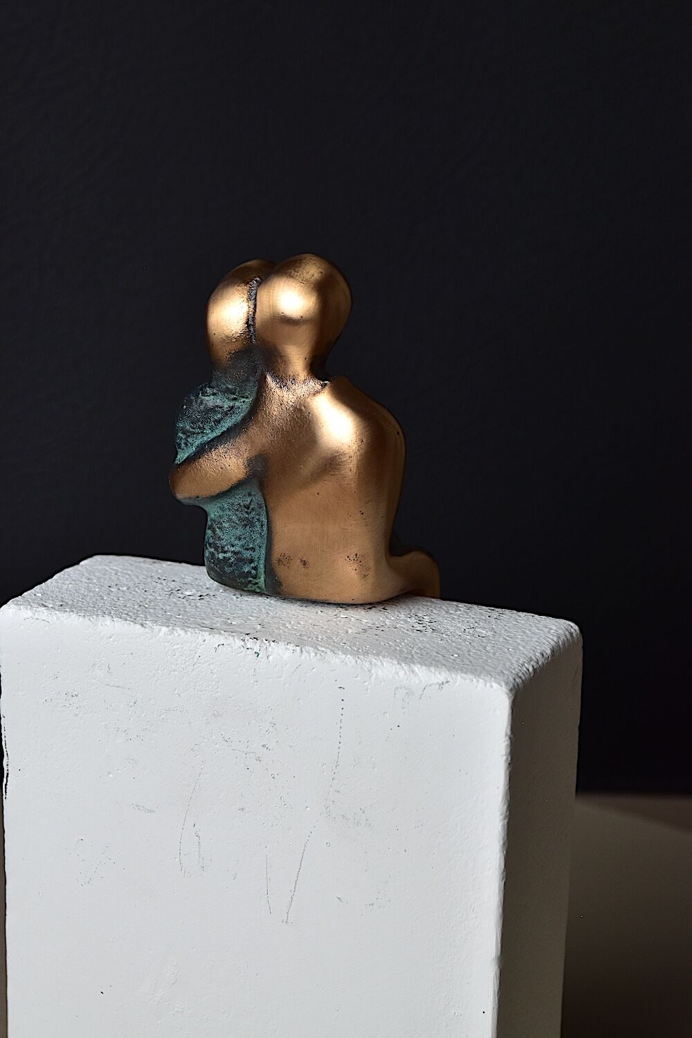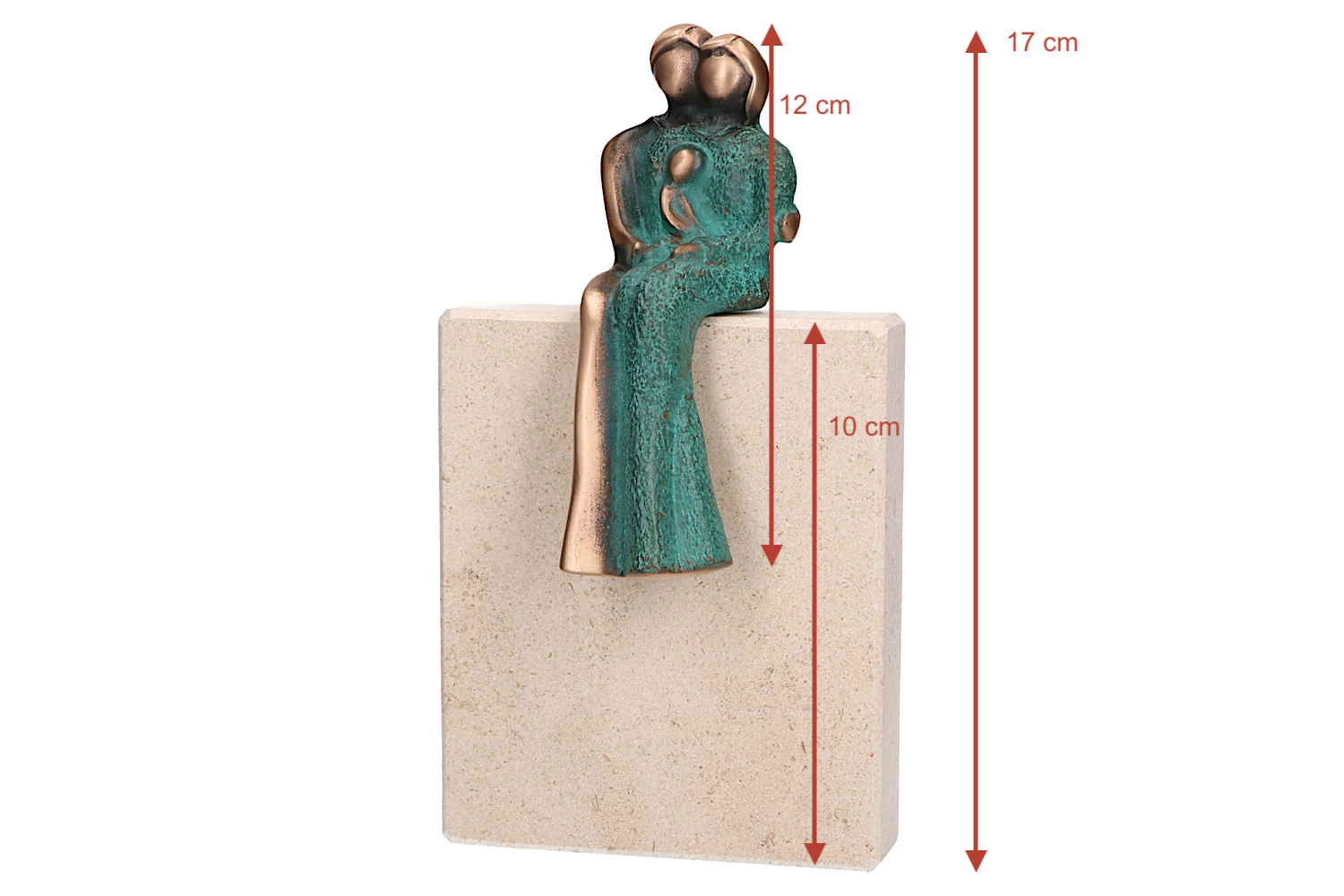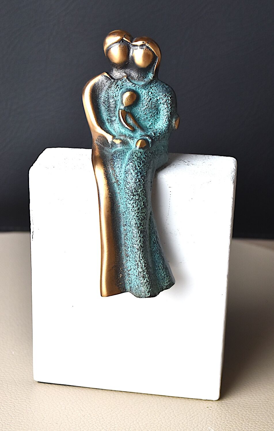 Auf einem Naturstein sitzende stilisierte Kleinfamilie aus Mutter, Vater und kleinem Kind. Die im Sandgussverfahren massiv gegossene Bronzeplastik wird in Handarbeit poliert und teilweise grün patiniert. Die Eleganz dieser Skulptur entsteht durch den lebendigen Kontrast aus hell und grünlich patinierten Bereichen. Die Bronzefamilie sitzt nicht fixiert auf einem cremefarbenen Natursteinquader, sondern kann beliebig positioniert werden.