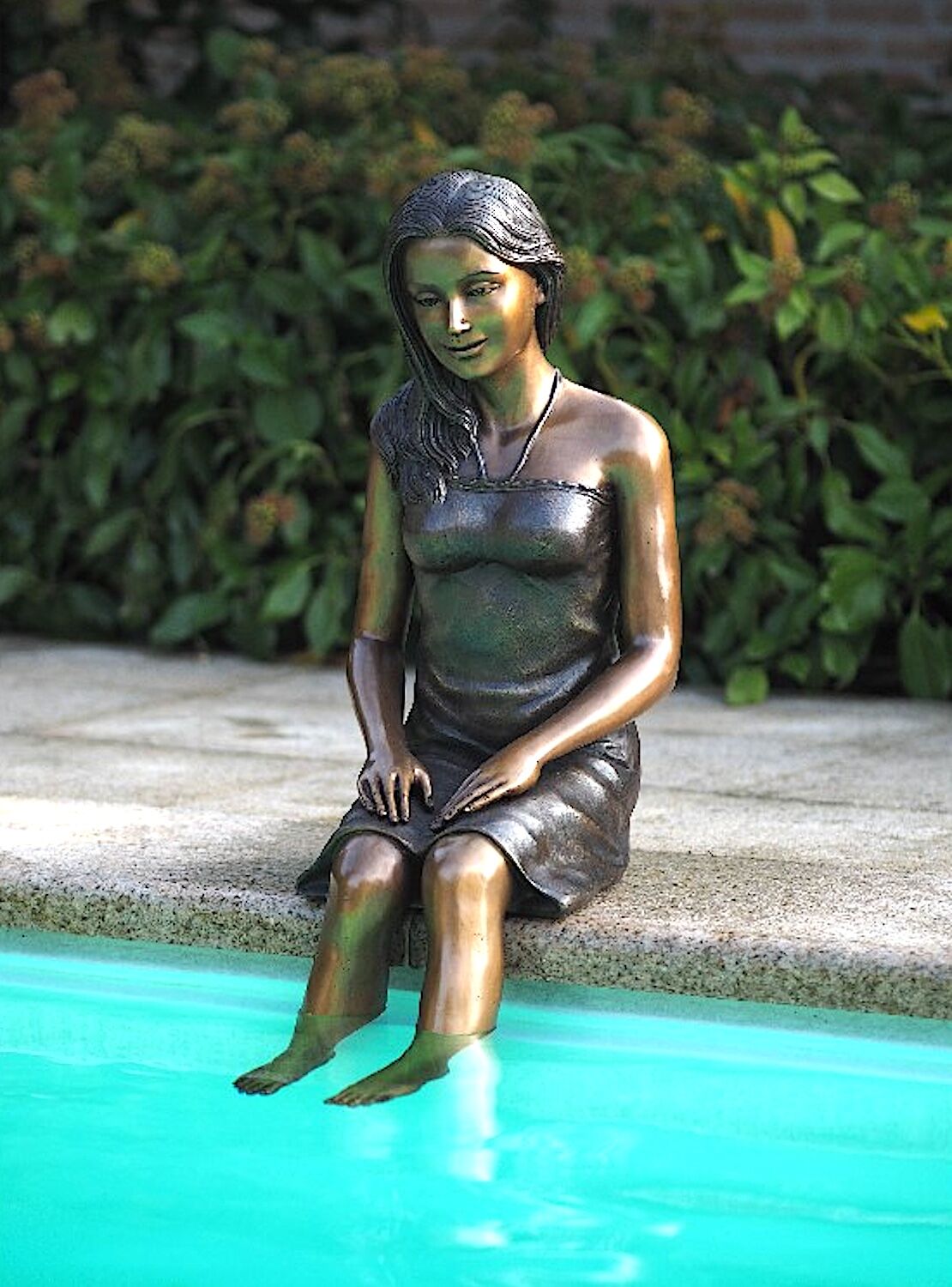 Leicht lächelndes, sitzendes Mädchen aus patinierter Bronze (95 cm). Sie verzaubert, mit den Beinen im Wasser baumelnd, einen Pool oder Teich. Oder von einer Bank, einem Podest oder anderen Sitzmöglichkeiten. Unten befinden sich Gewindebohrungen zur Fixierung.