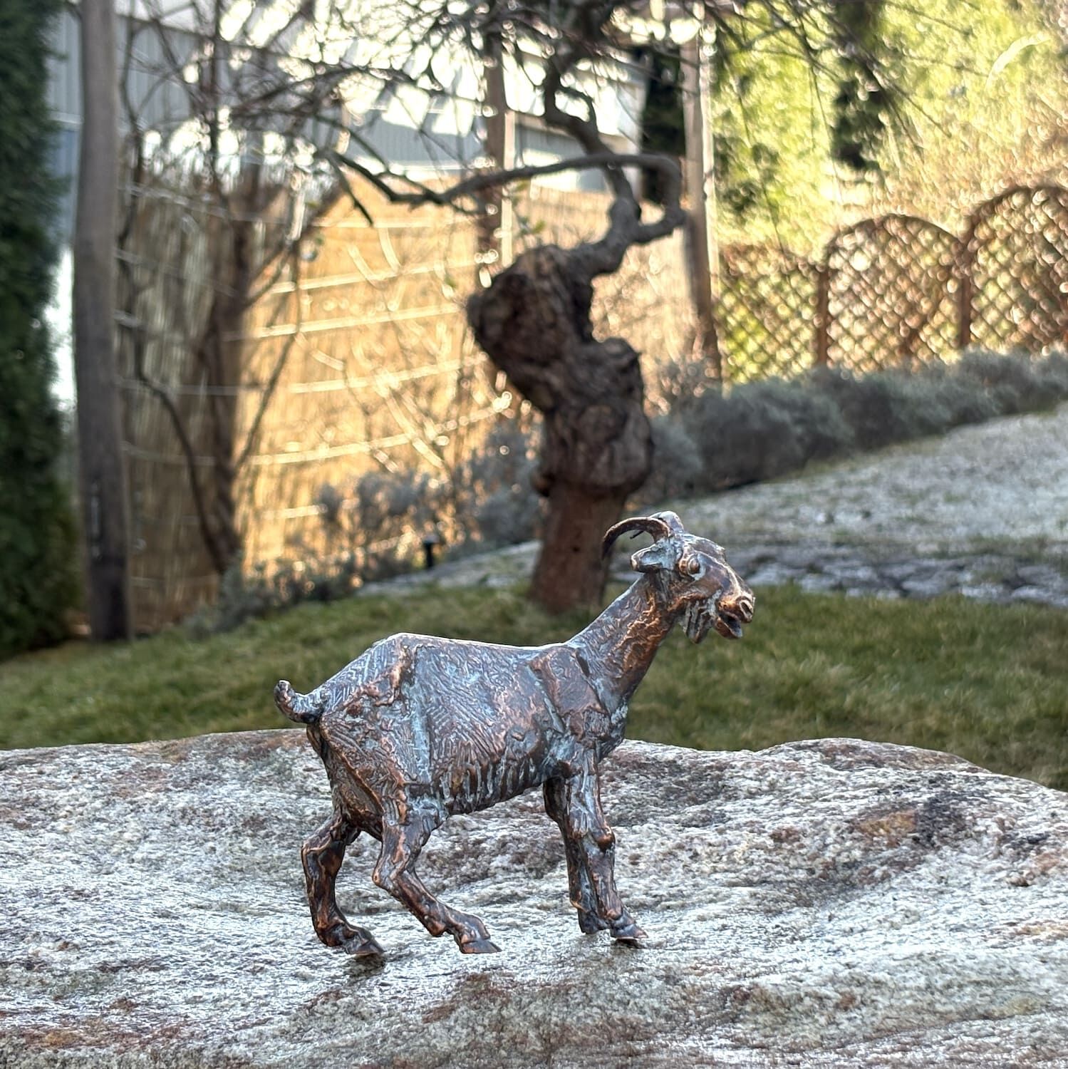 Studie einer Ziege aus patinierter Bronze (13 cm). Scheu und neugierig zugleich, reckt sie dem Betrachter den Kopf entgegen, der Hinterlauf ist schon zur schnellen Flucht in Position gebracht. Eine aus der schwäbischen Giesserei Strassacker stammende Bronzeplastik. Sie ist künstlerisch wie handwerklich von hoher Qualität.