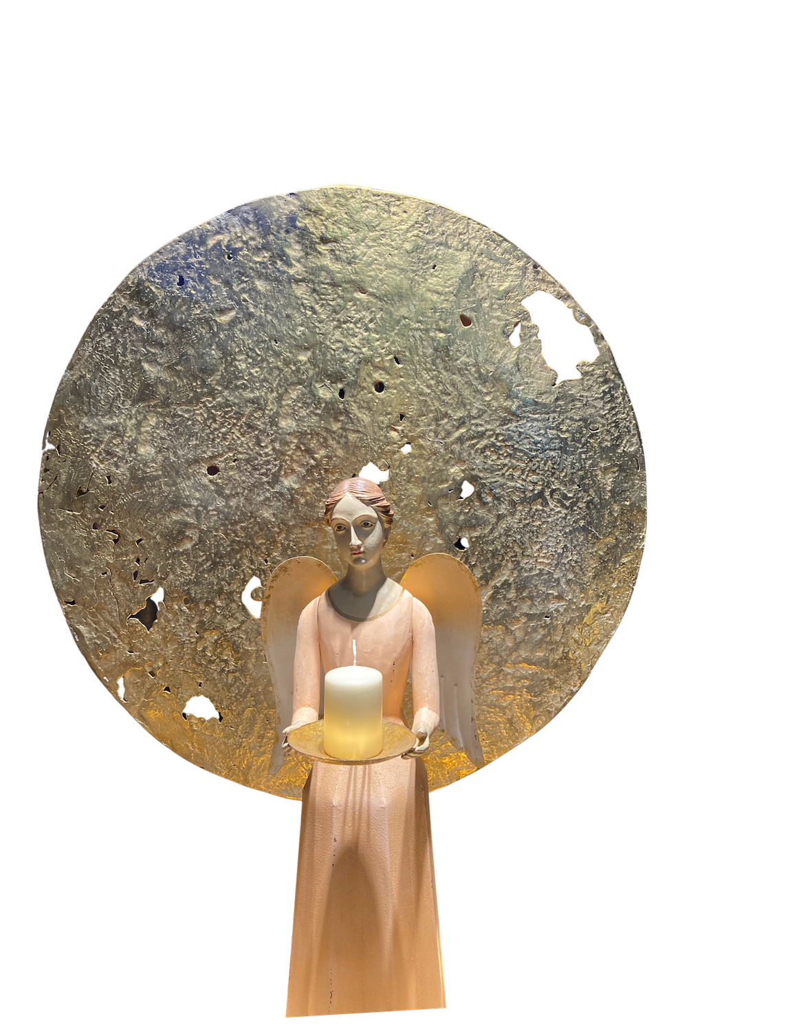 Blank poliertes Bronzeobjekt (ø 75 cm), das mit seiner gebrochenen Oberfläche einen fernen Planeten darstellen könnte - oder eine archaische Darstellung des Himmels. Sie kann auf einem Ständer stehen oder an Wand befestigt werden. Die HIMMELSSCHEIBE ist auch größer in ø 120 cm und in ø 175 cm erhältlich.