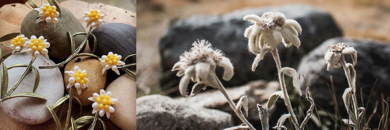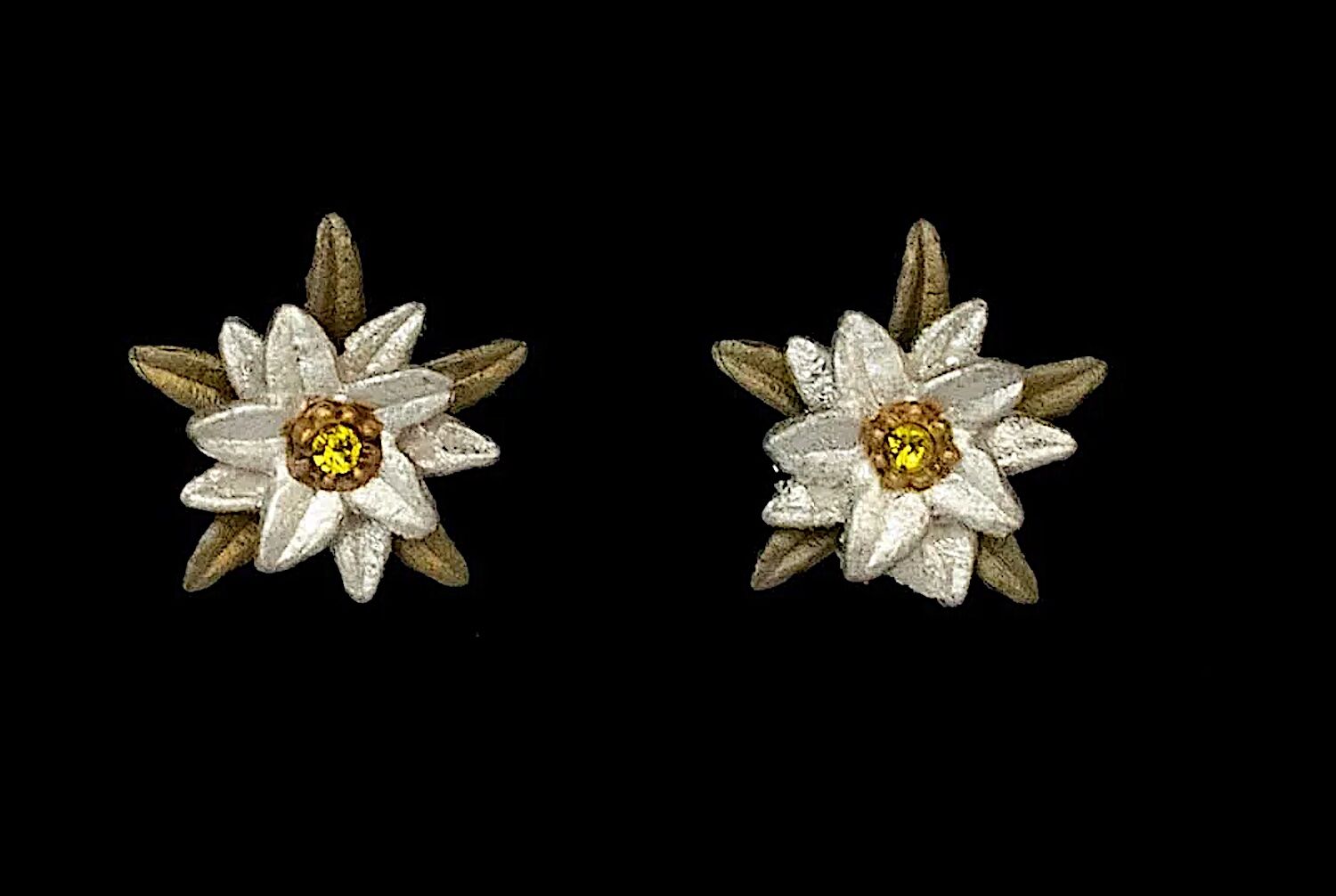 Die Blüten des Edelweiß bestimmen die Eleganz dieses Paar Ohrsteckers. Es besteht aus mit Weißgold veredelter, handgefertigter Bronze. Im Inneren der Blüten finden sich österreichische Kristalle in einer Goldfassung. Diesen Schmuck hat Michael Michaud gemeinsam mit der Schauspielerin Angela Cartwright entworfen. Anlass war das sechzigste Jubiläum des Films "The Sound of Music", in dem Österreich - quasi die Heimat des Edelweiß - und Mrs. Cartwright jeweils tragende Rollen spielen.