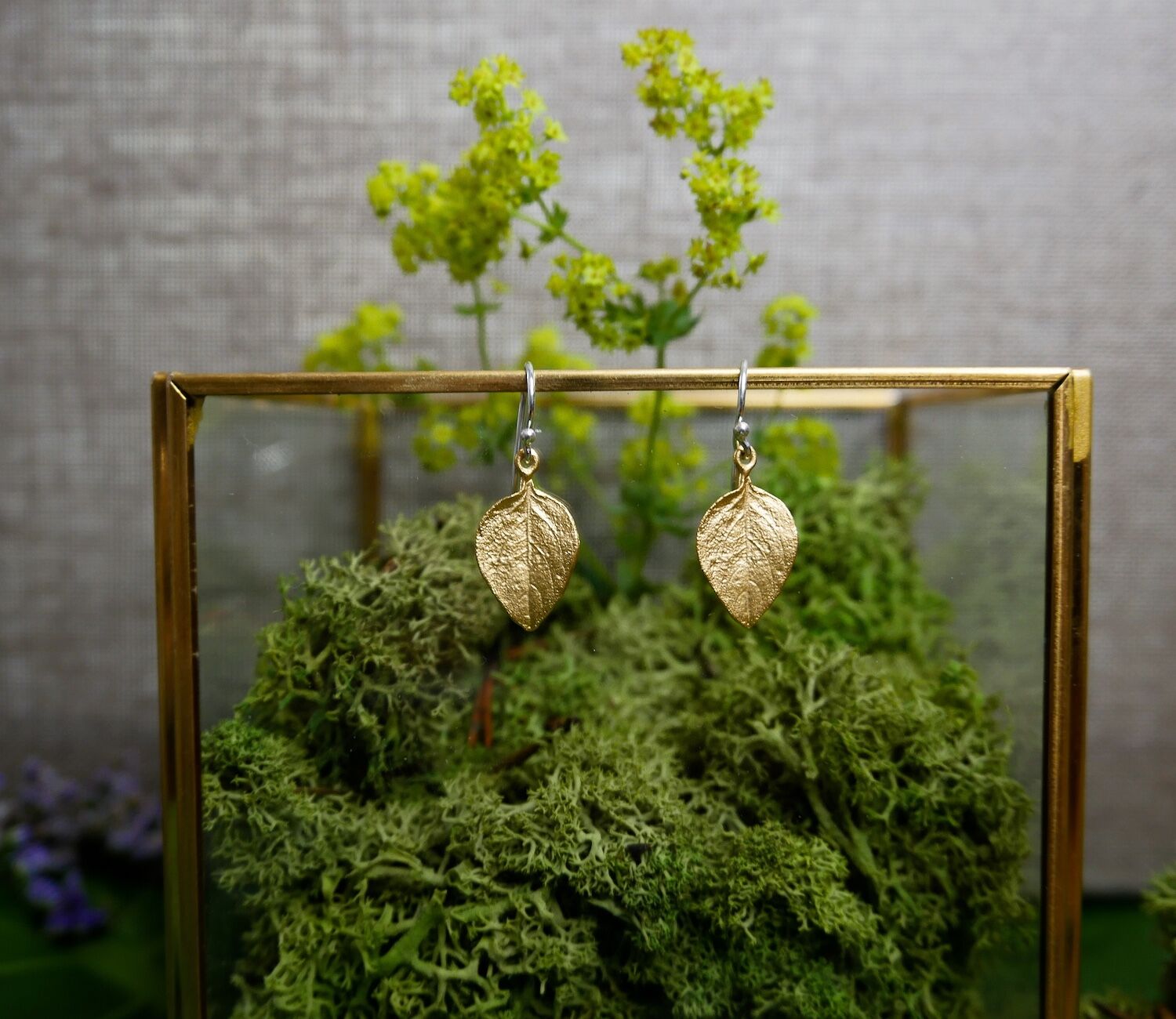 Ein Eukalyptusblatt als Ohrhänger aus Bronze. Dieses Paar Ohrringe ist schön und elegant wie die Natur.