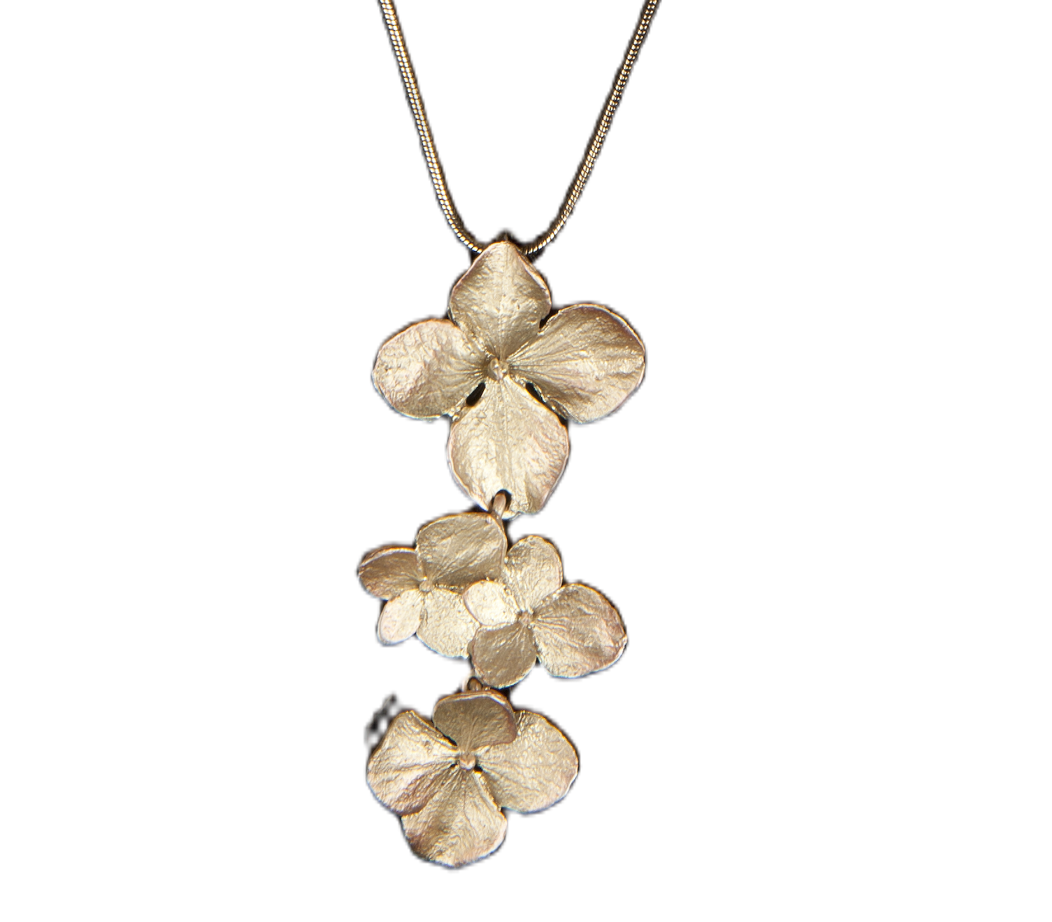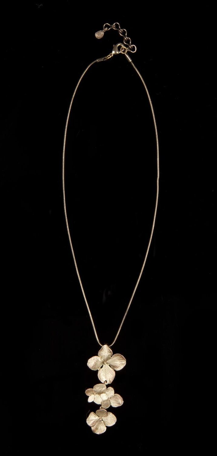 Bronzekette mit dreiteiligem Anhänger in Form von eleganten Blüten der Hortensie. Jedes Detail der Blütenblätter ist sichtbar. Die Hortensienkette ist aus Bronze, die Hortensienblüten sind mit einer Antikbronzepatina versehen, die mit Kupfer akzentuiert ist. Jedes Schmuckstück liegt in einer attraktiven Geschenkbox, ergänzt um Bilder und Erläuterungen.