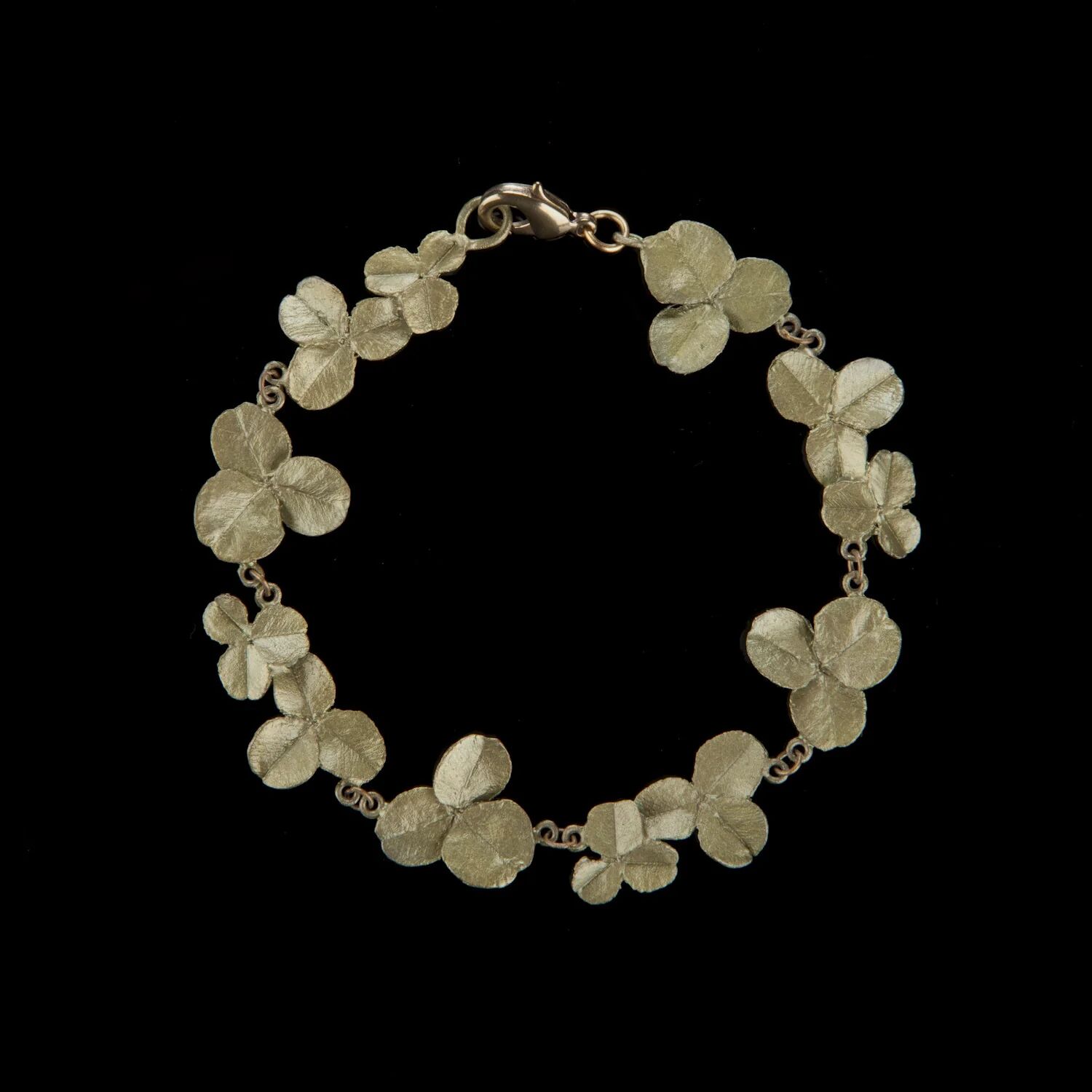 Ein Armband aus mehreren Kleeblättern, verewigt in handpatinierter Bronze. Jedes Schmuckstück liegt in einer attraktiven Geschenkbox.