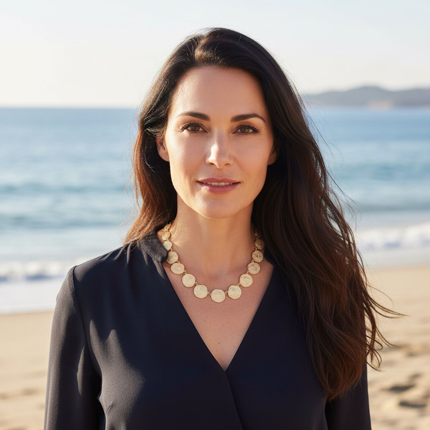 Ein Collier aus bronzenen Schalen der Sattelmuschel, ein köstlicher Gruß aus dem Meer. Die handpatinierten Schalen sind 24 Karat vergoldet und silberbeschichtet. Das macht sie so schön wie die Originale. Eine attraktive Geschenkbox liegt bei.