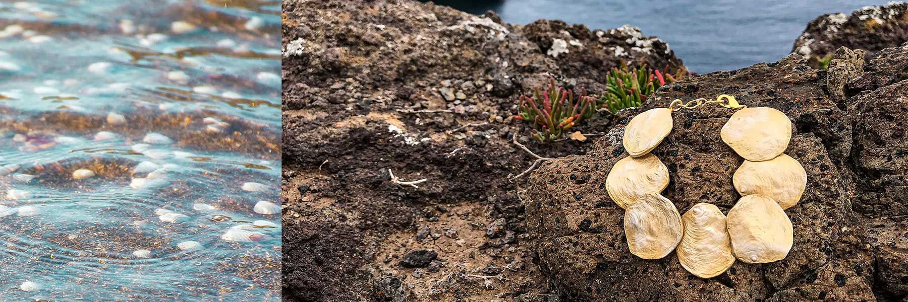 Eine Kette mit einem Anhänger aus drei bronzenen Schalen der Sattelmuschel. Die handpatinierten Schalen sind 24 Karat vergoldet und silberbeschichtet. Das macht sie so schön wie die Originale. Eine attraktive Geschenkbox liegt bei.