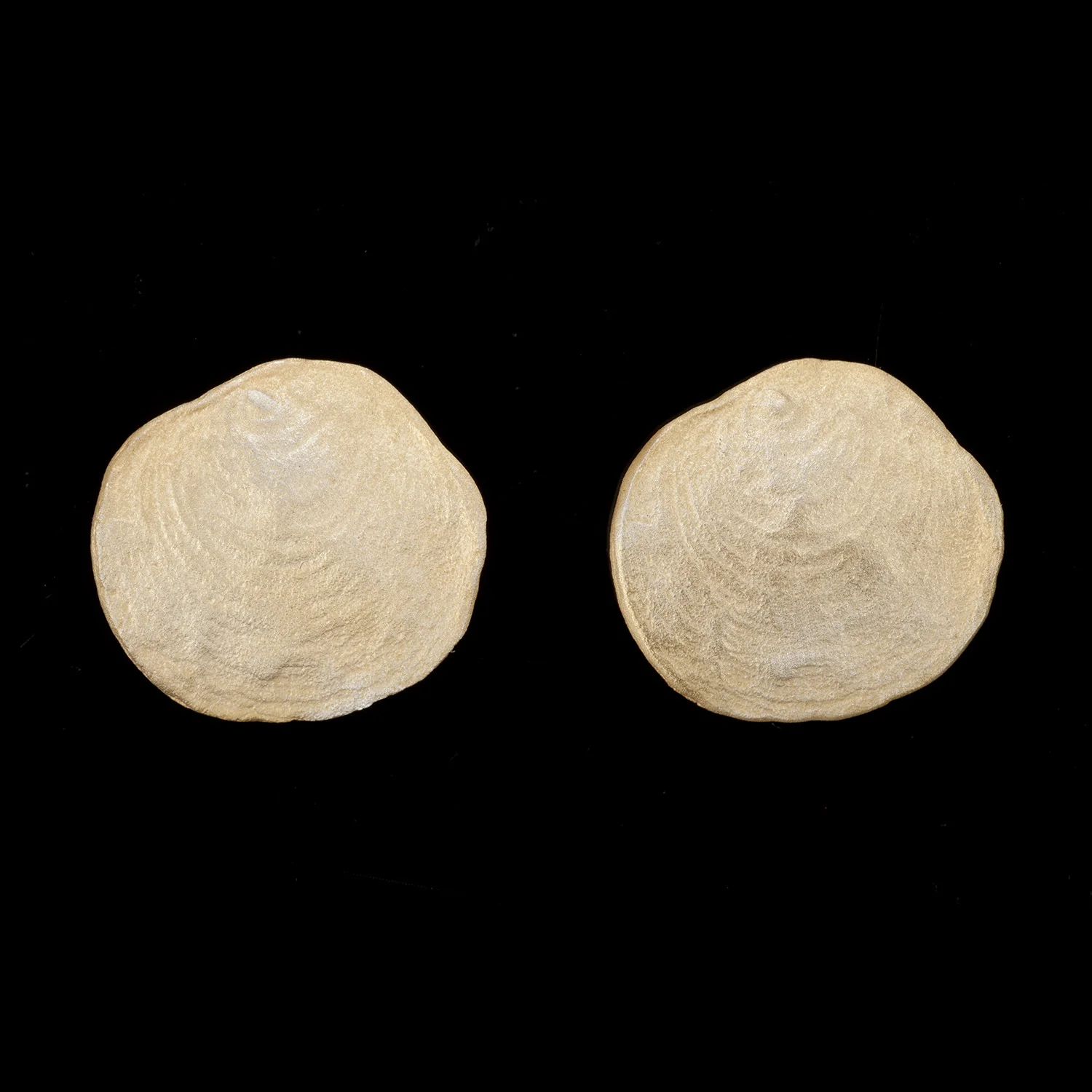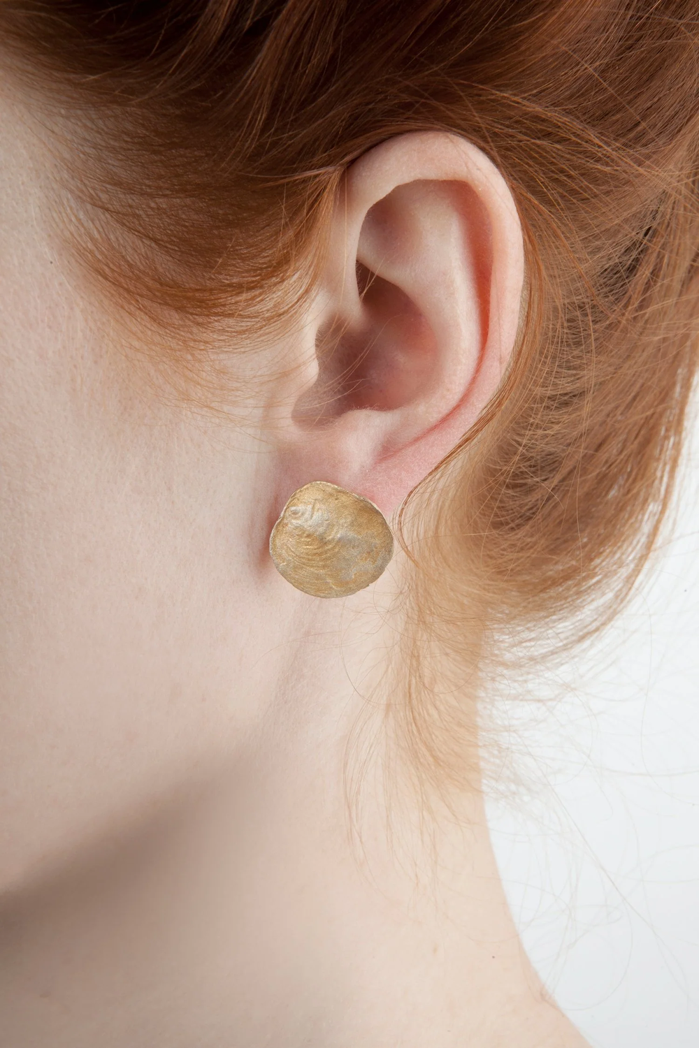 Ein Paar Ohrstecker aus den bronzenen Schalen der Sattelmuschel. Die handpatinierten Schalen sind 24 Karat vergoldet und silberbeschichtet, die Stecker aus Silber Das macht sie so schön wie die Originale. Eine attraktive Geschenkbox liegt bei.