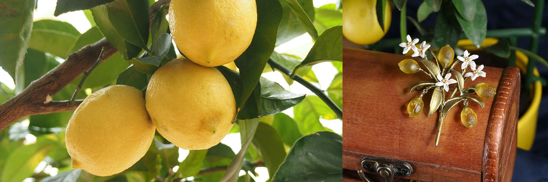 Ein Anhänger mit einer kleinen Zitrone aus Glas, darüber bronzene Blätter. Der Stecker besteht aus 925 Silber. Ein vitales kleines Kunstwerk fürs Ohr. Es liegt in einer attraktiven Geschenkbox.