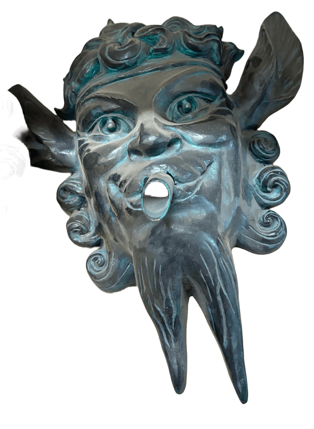 Freundliches Teufelsgesicht als Wasserspeier aus patinierter Bronze (35 cm hoch). Er hat lange Ohren, einen Zickenbart und einen wachen erfreuten Blick. Auf der Rückseite befindet sich eine Stange zur Fixierung des Wasserspeiers in Mauerwerk. Lieferung ohne Schlauch und Pumpe.