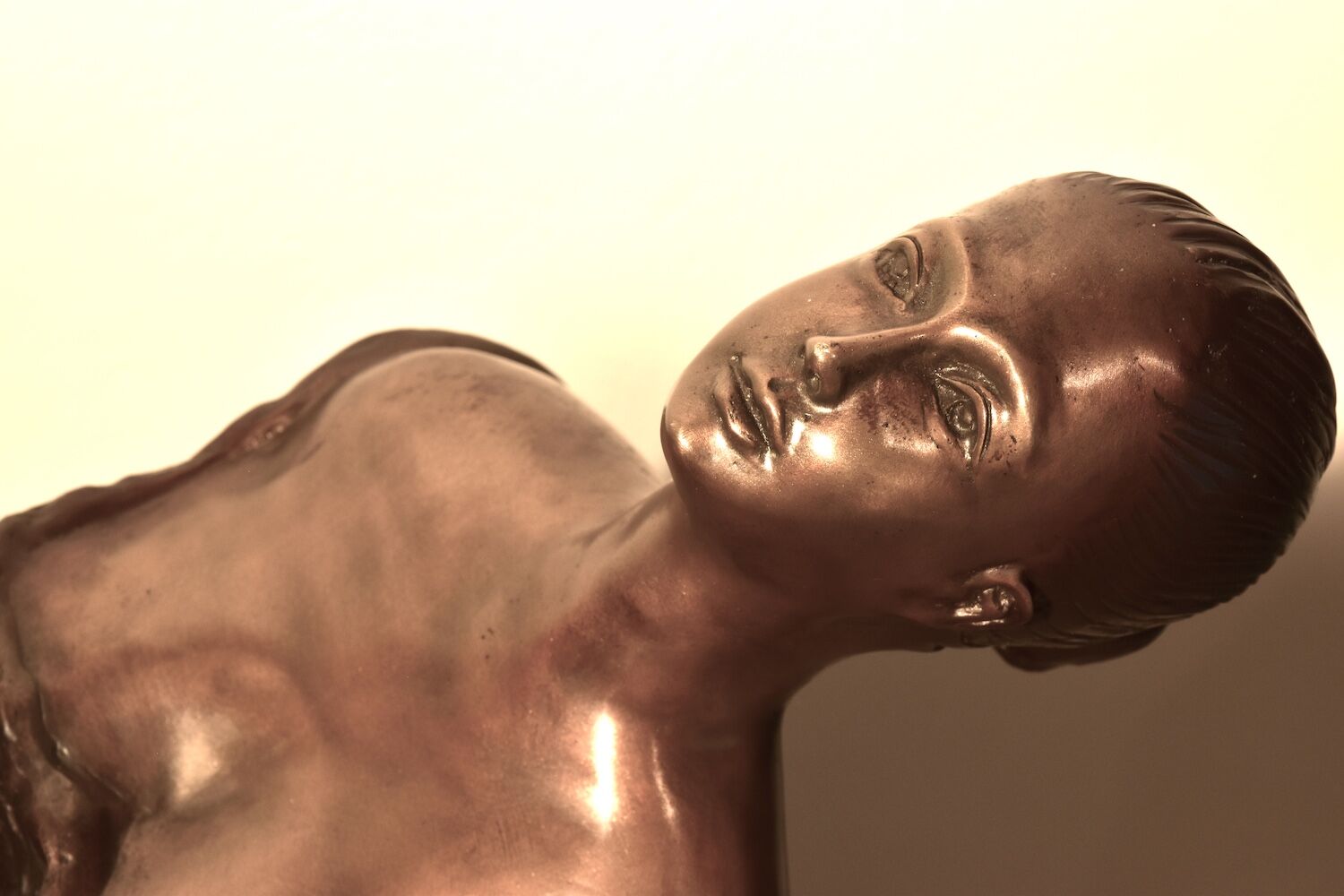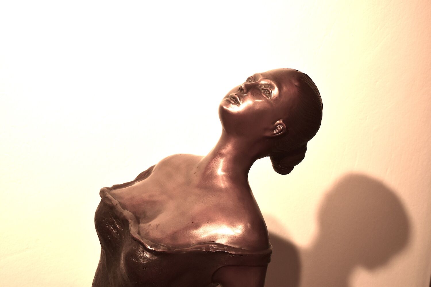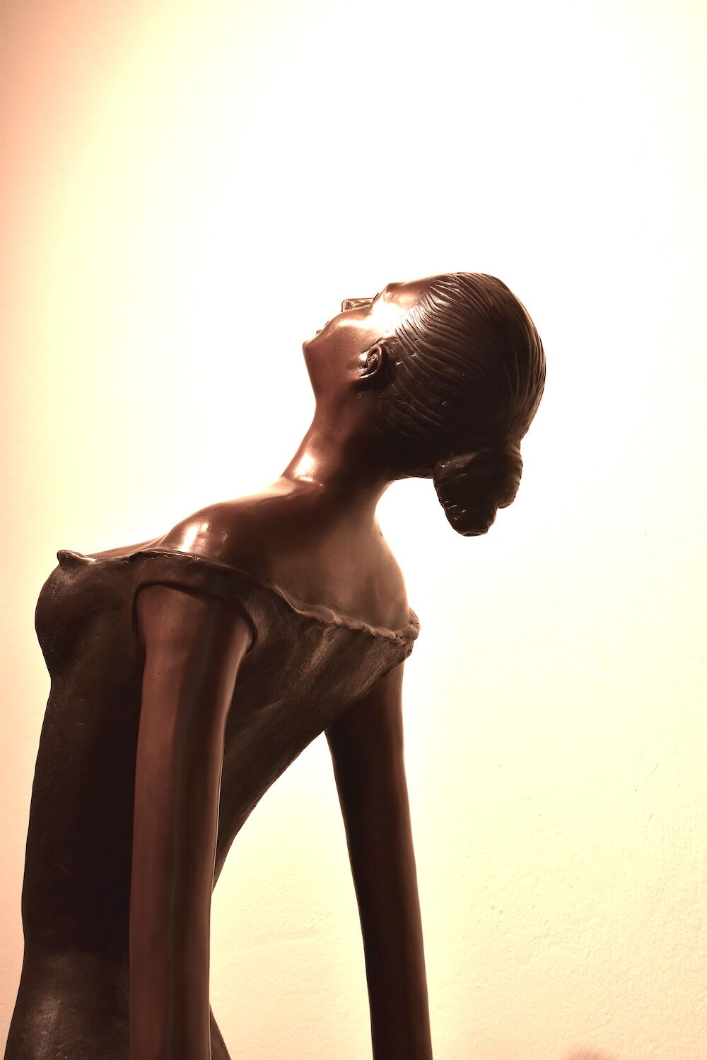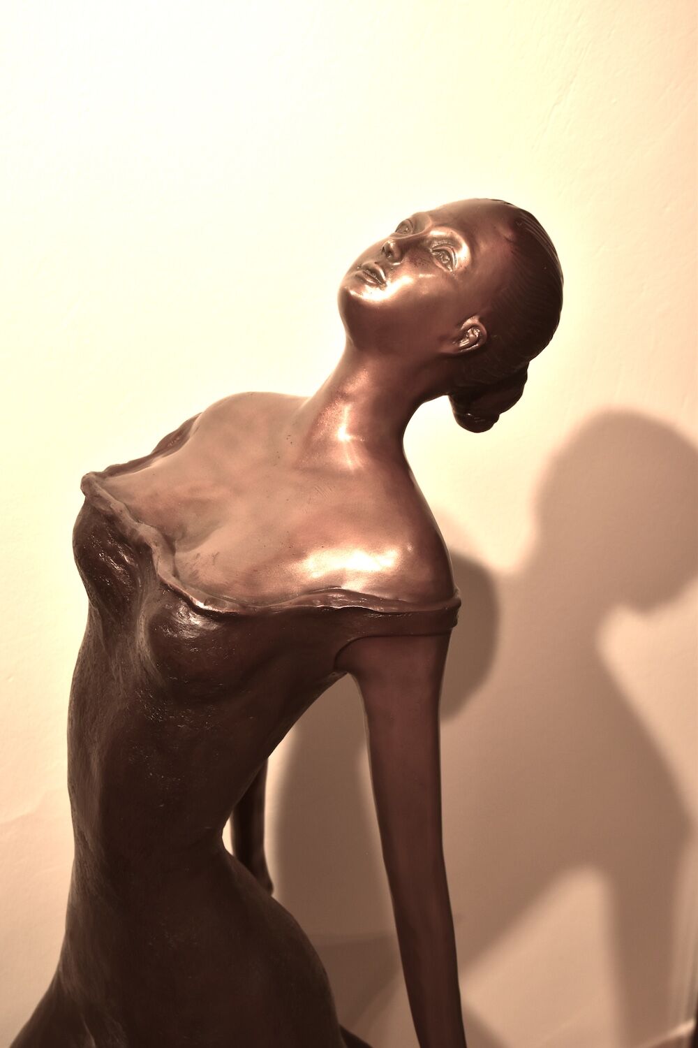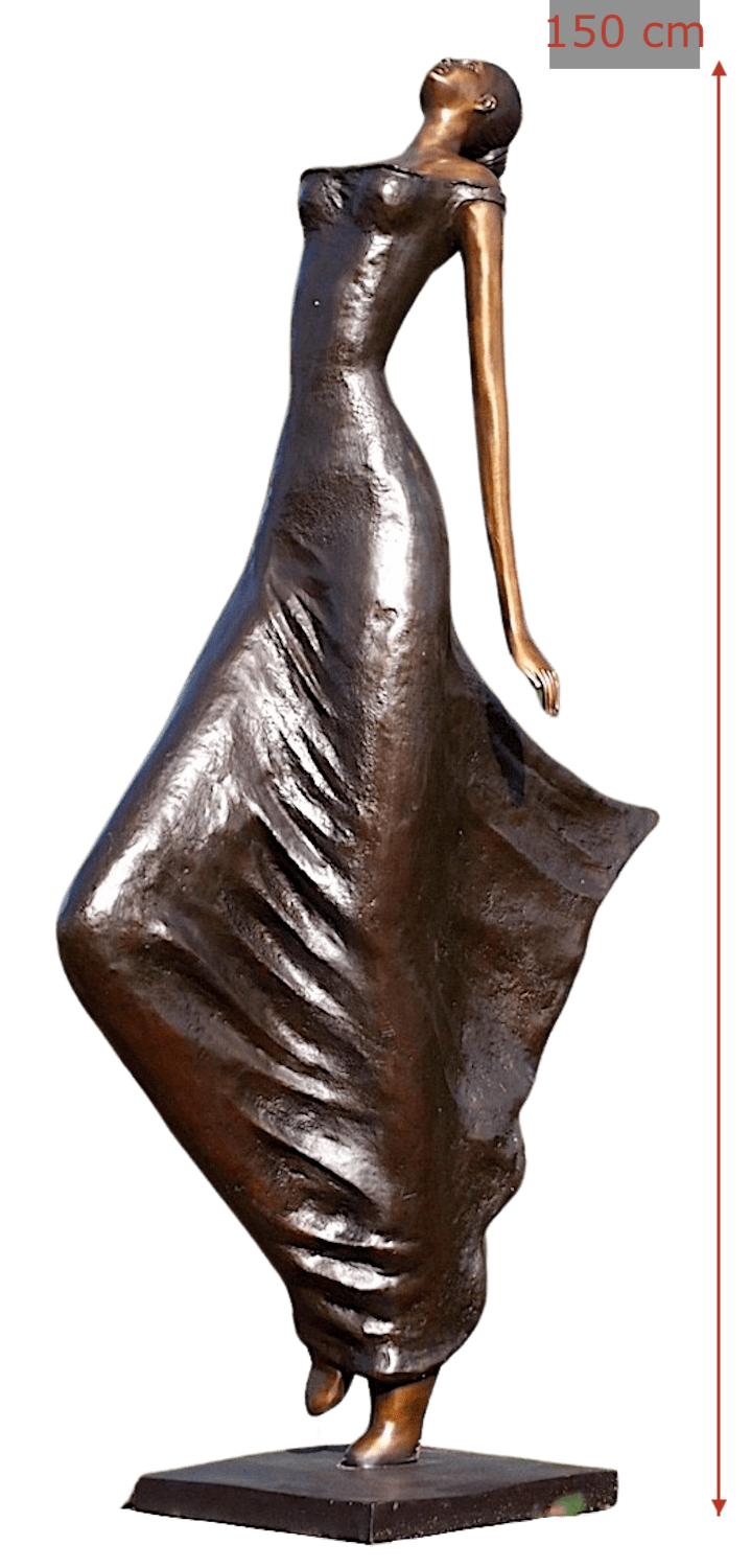 Mit zurückgeworfenem Kopf schreitet die Dame voran. Das angewinkelte rechte Bein verharrt schwebend. Das Kleid der zweifarbig patinierten Bronzefigur (150 cm) zeichnet den schlanken Körper ab und bildet hinten einen Schweif. Eine präzise, künstlerisch abstrahierte Studie einer tanzenden Frau. Pure Eleganz in Bronze für Haus oder Garten.