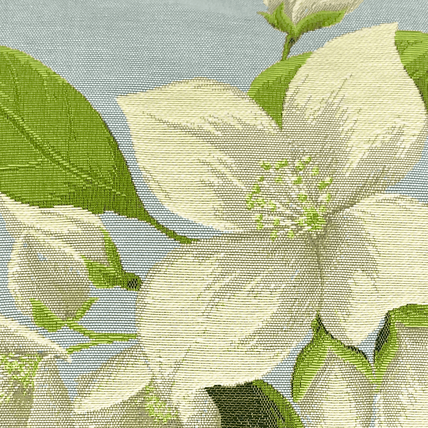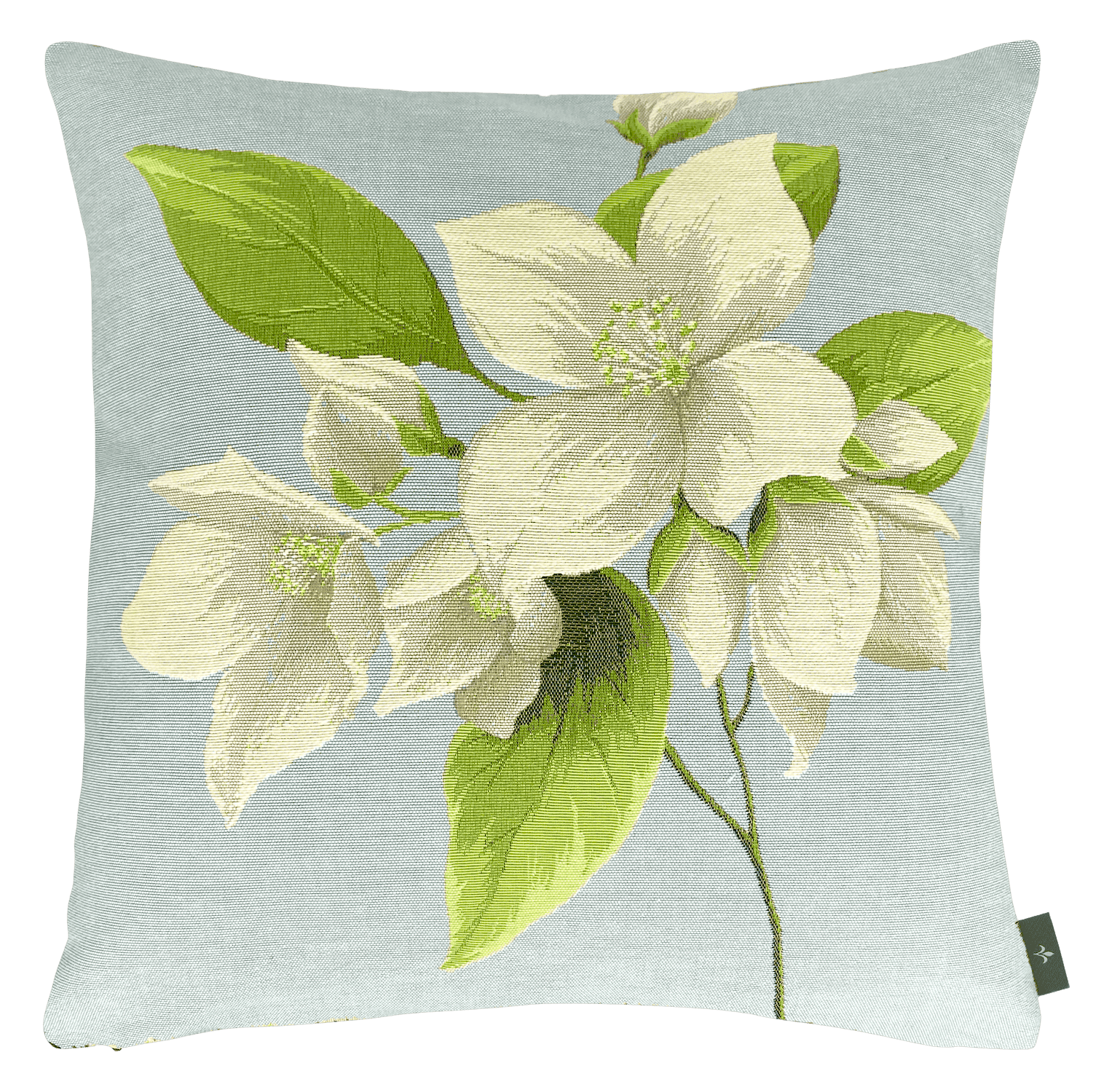 Prächtige Blüten des Jasmin auf hellblauem Hintergrund. Die beigefarbene Rückseite dieses Gobelinkissens besteht aus Baumwolle. Eine elegante Qualitätsarbeit der Manufaktur Art de Lys aus Frankreich.
