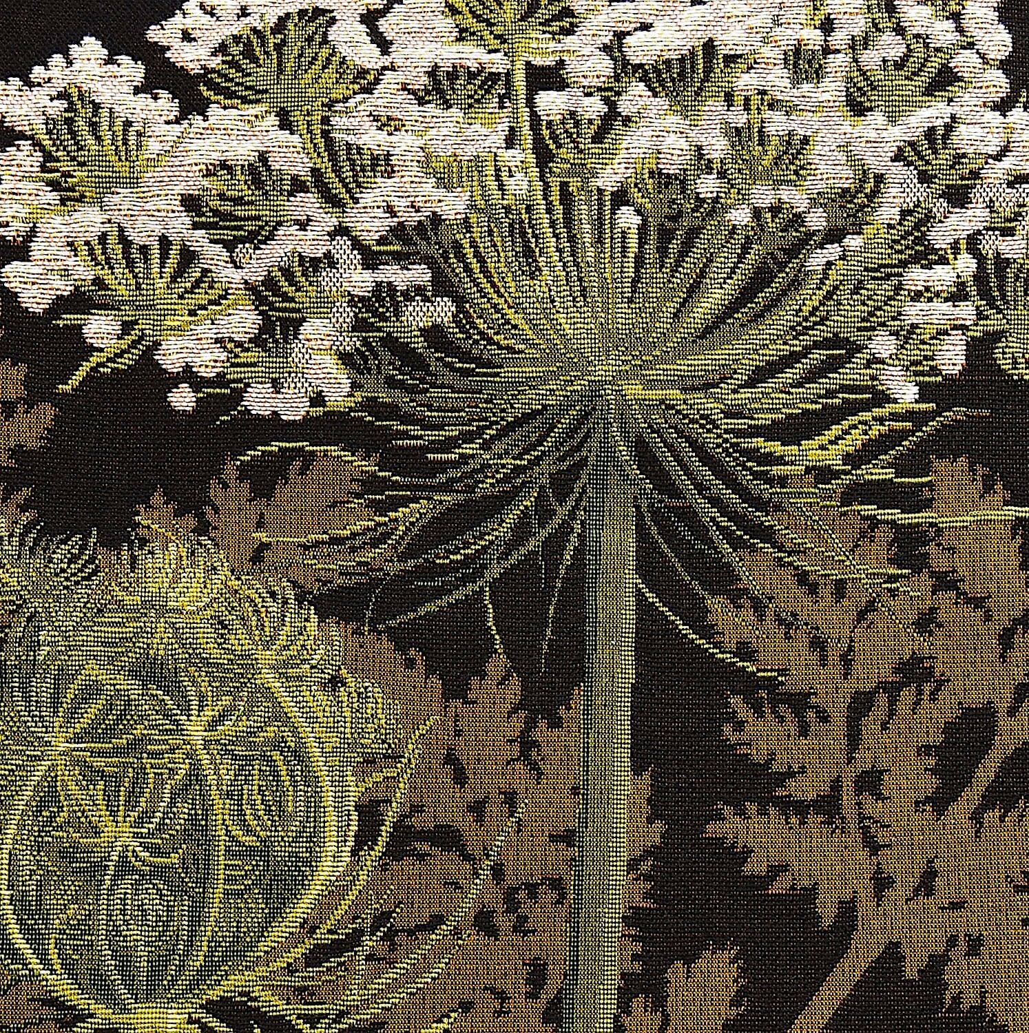 Vor schwarzem Hintergrund leuchtet eine weiße Blüte und eine Dolde der Wilden Möhre. Die beigefarbene Rückseite besteht aus Baumwolle. Eine Qualitätsarbeit der Manufaktur Art de Lys aus Frankreich.