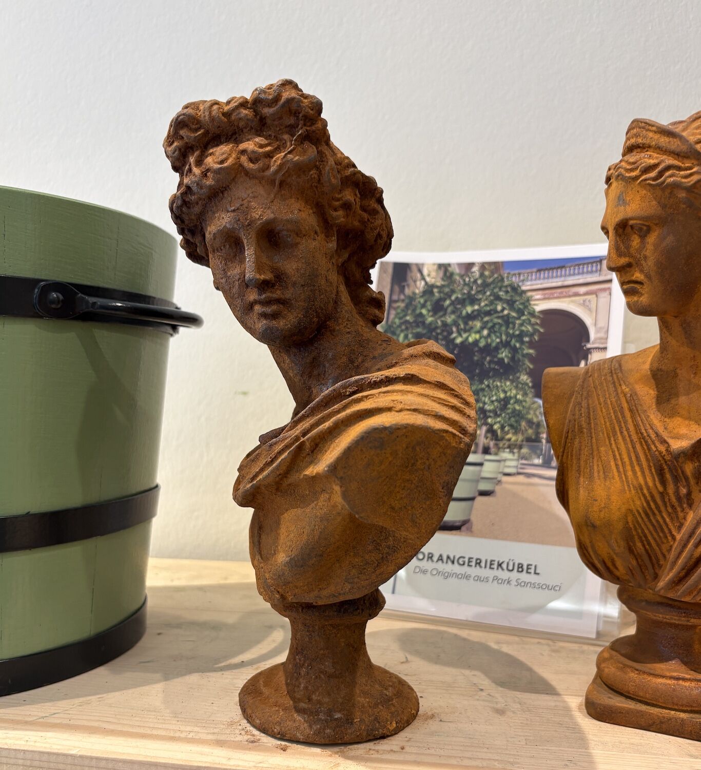 Kopfbüste eines Details der weltbekannten Marmorskulptur des Apollo von Belvedere, einem Meisterwerk der klassischen Bildhauerkunst. Diese ist wiederum eine Kopie des griechischen Originals aus Bronze, geschaffen um 330 v. Chr. Der Gott Apollo ist in der griechischen wie römischen Mythologie für besonders viele Sparten zuständig, unter anderem für das Licht, den Frühling, die sittliche Reinheit und Mäßigung, ebenso der Weissagung sowie der Künste, nicht zu vergessen für die Heilkunst.