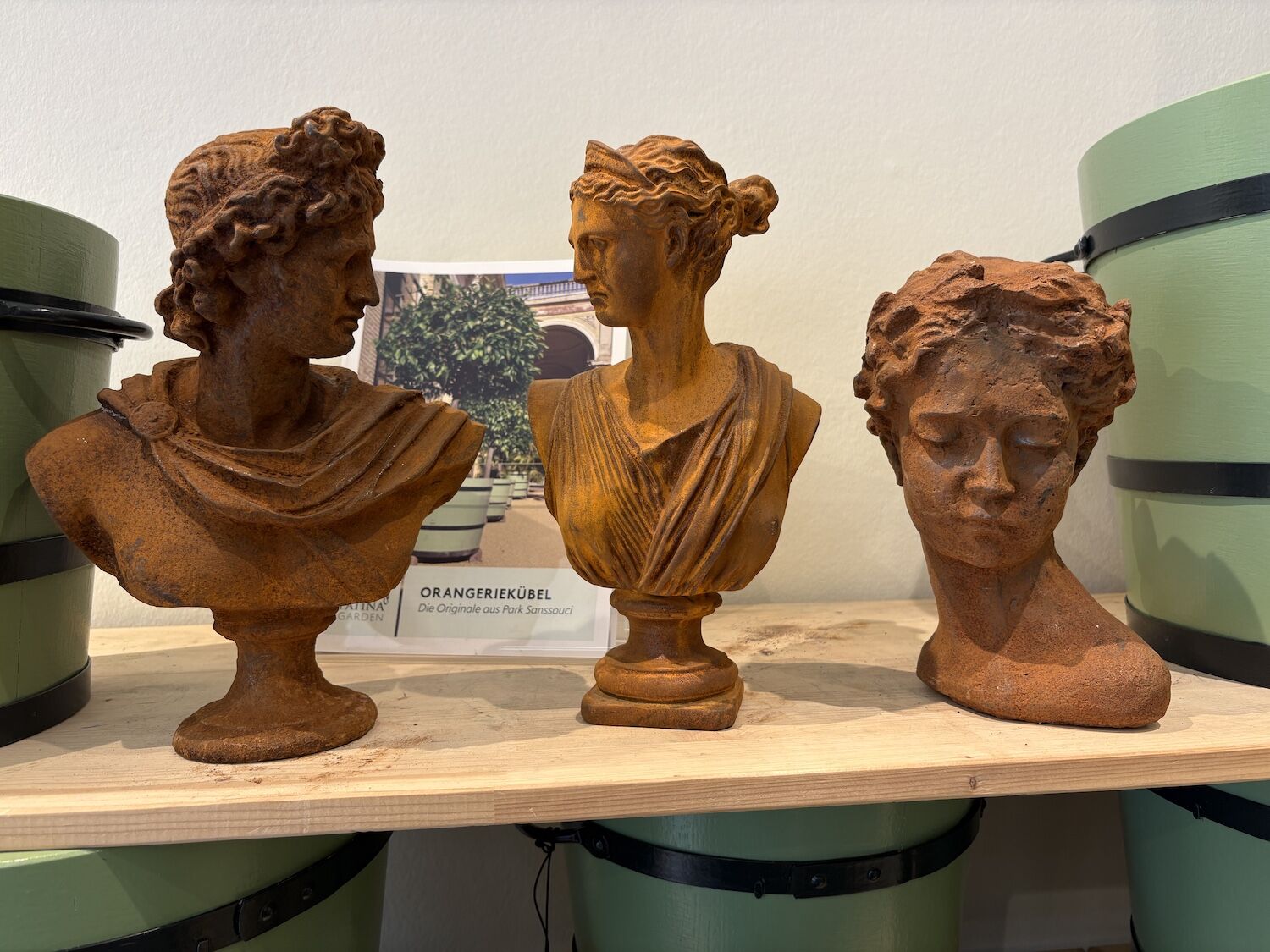 - Die Oberflächen von Objekte aus korrodiertem (rostigem) Gusseisen sind stets verschieden. Die gezeigten Bilder sind daher nur Beispiele. An manchen Stellen können andersfarbige Ausblühungen, Lötspuren oder Kratzer sein. Diese sind produktionsbedingt, stellen keinen Mangel dar und werden mit der Zeit von nachbildendem Rost überlagert. Und natürlich schreitet der Korrosionsprozess voran, wenn die Objekte ungeschützt draußen stehen. Dennoch werden Sie viele Jahre Freude haben an einem Objekt aus korrodiertem Gusseisen.