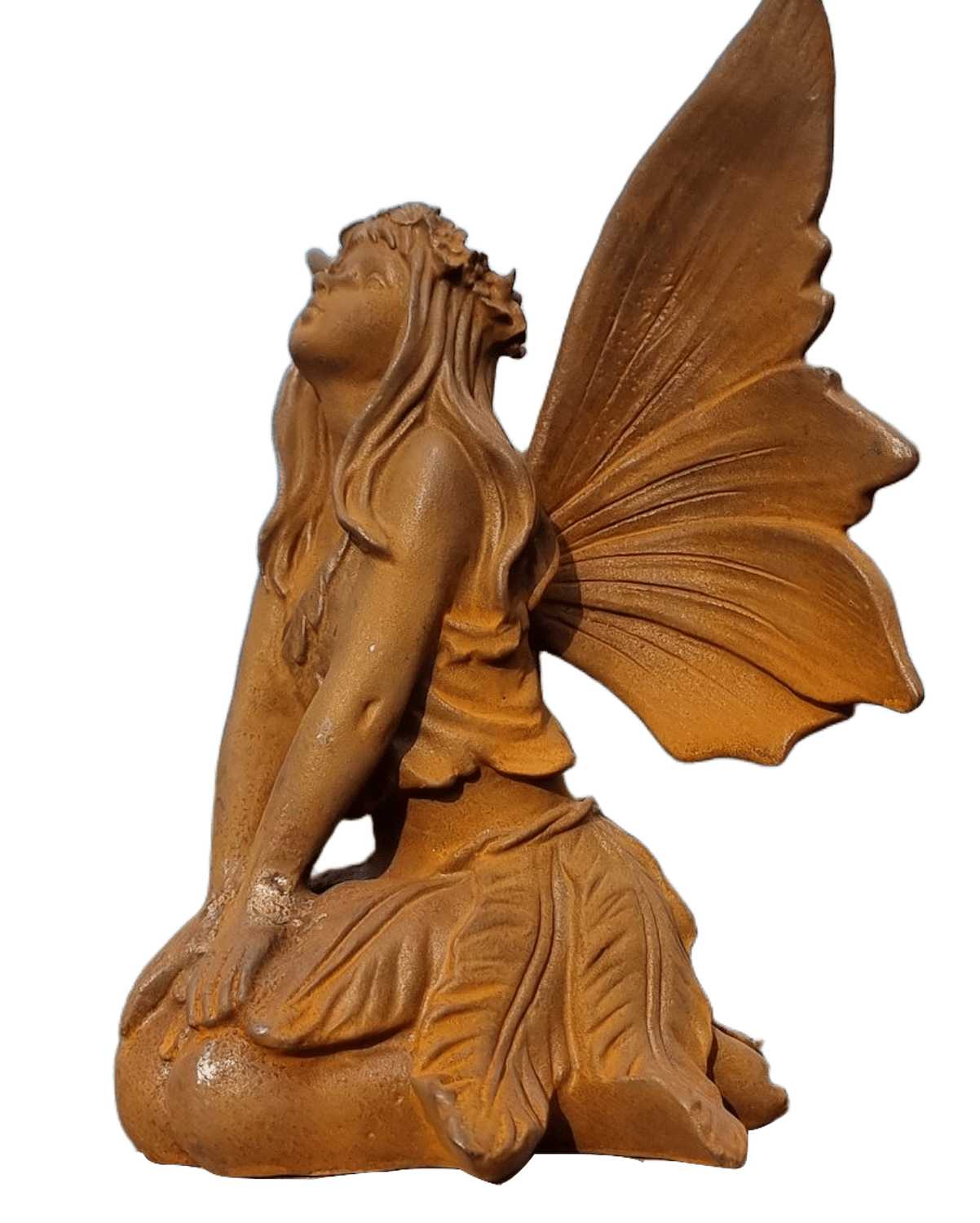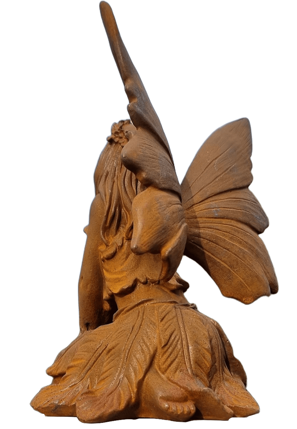Figur einer knienden Elfe (25 cm) aus korrodiertem Gusseisen. Bekleidet mit einem Kleid aus Blüten schaut sie nach oben, die Hände auf den Knien abgelegt.