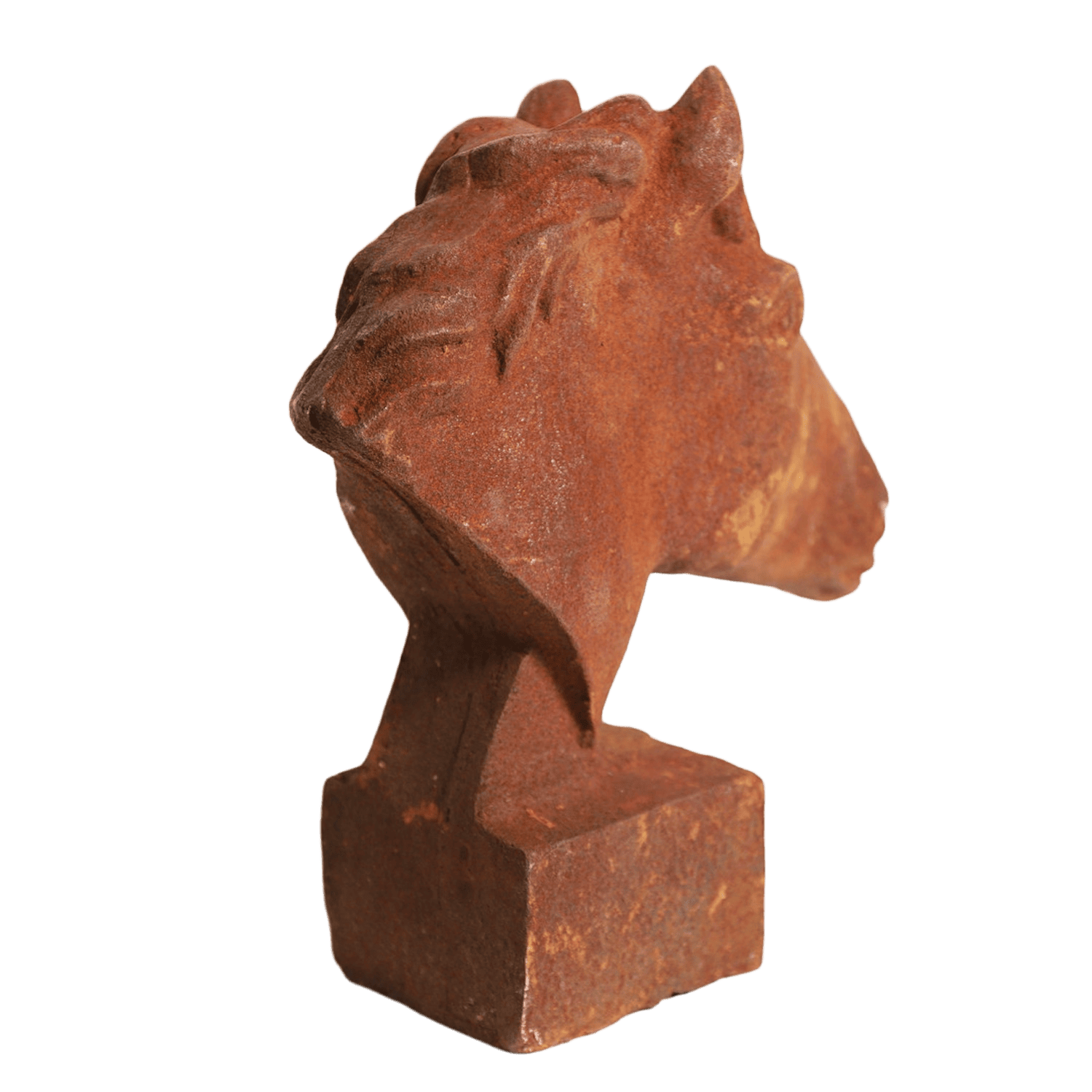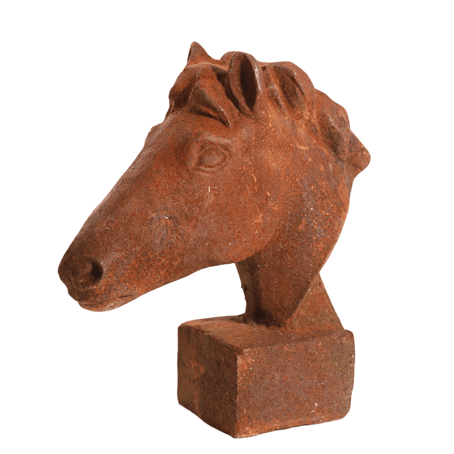 Naturnah gestalteter Kopf eines Pferdes aus korrodiertem Gusseisen. Die 60 cm große Kopfbüste ist eine ruhige Studie für Freunde dieser großartigen Tiere. Auch für den ganzjährigen Außeneinsatz.