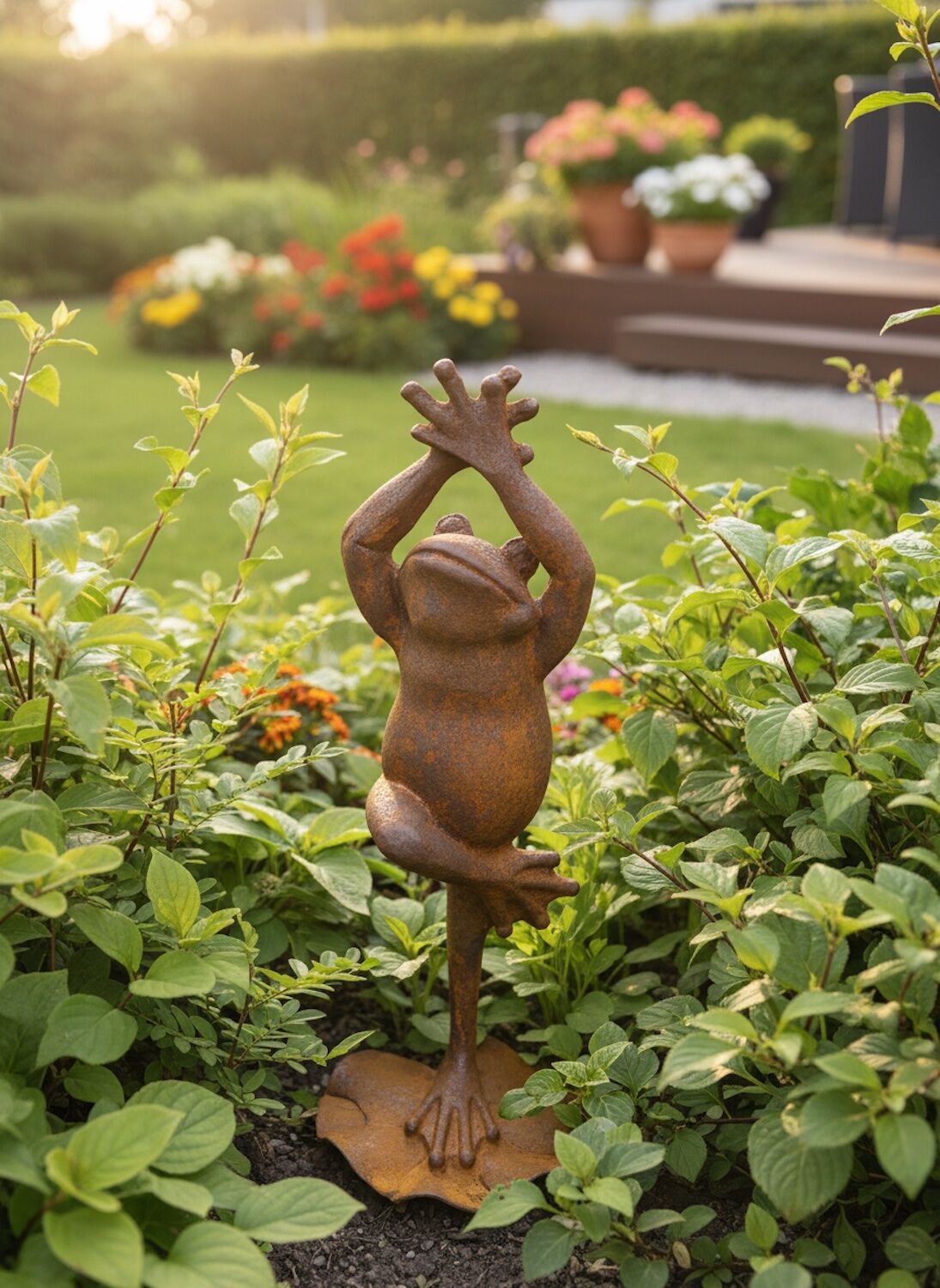 Frosch aus korrodiertem Gusseisen (24 cm), der auf einem Bein stehend Yoga praktiziert. Die Büste ist frostfest und ganzjährig für draußen und drinnen geeignet.
