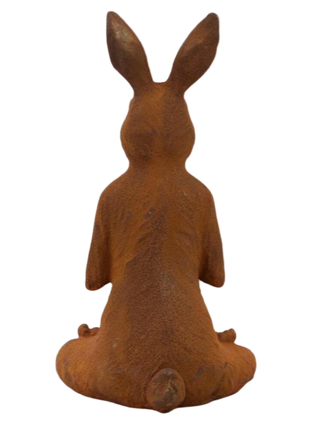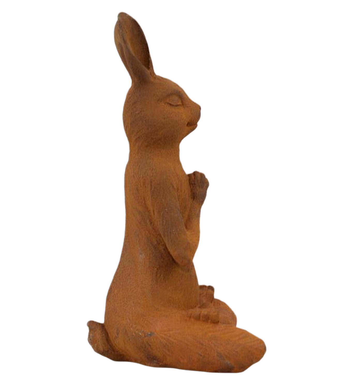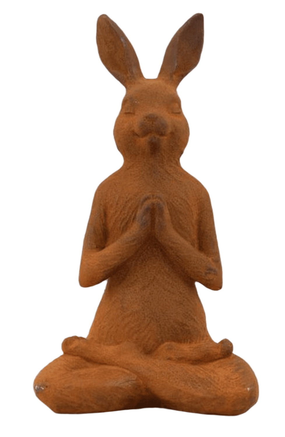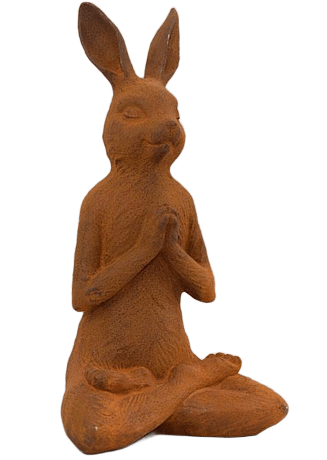 Hase aus korrodiertem Gusseisen (31 cm) im Lotussitz beim Yoga. In die Meditation vertieft, sind seine Augen geschlossen. Der Mund formt ein sanftes Lächeln. Das Objekt ist frostfest und ganzjährig für draußen und drinnen geeignet.