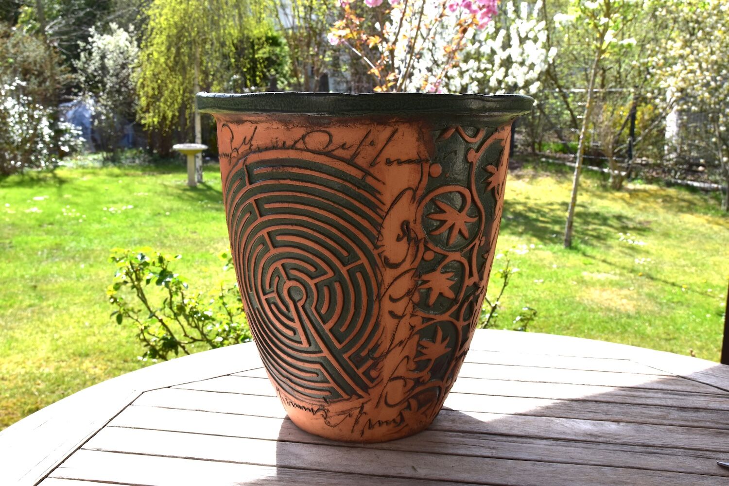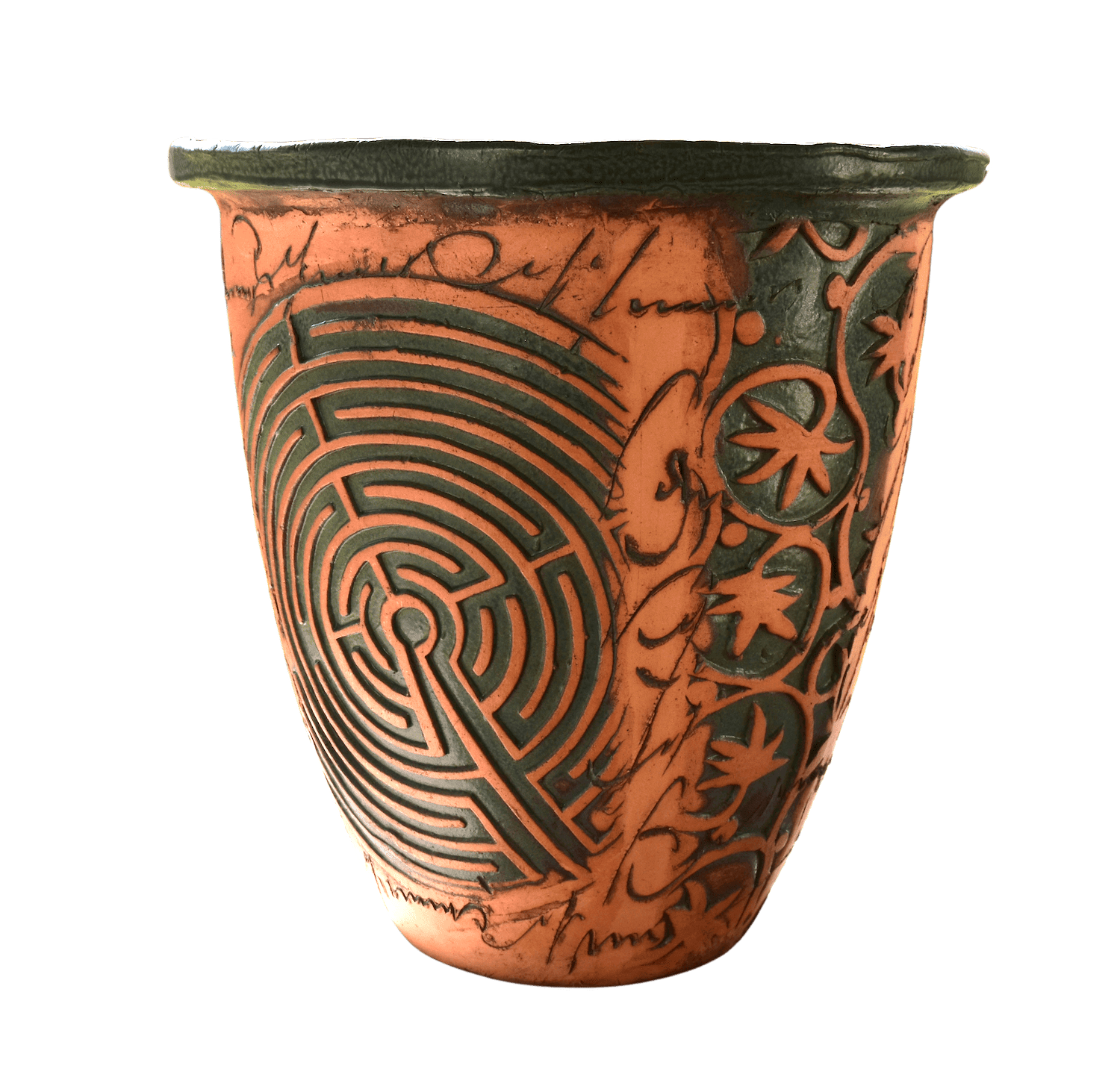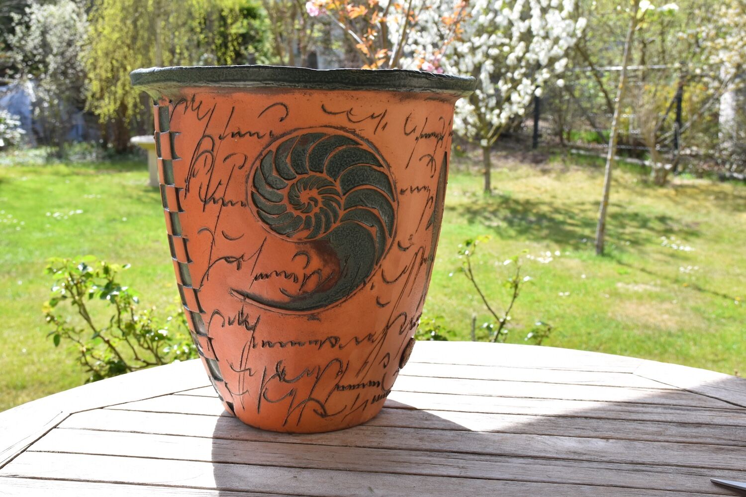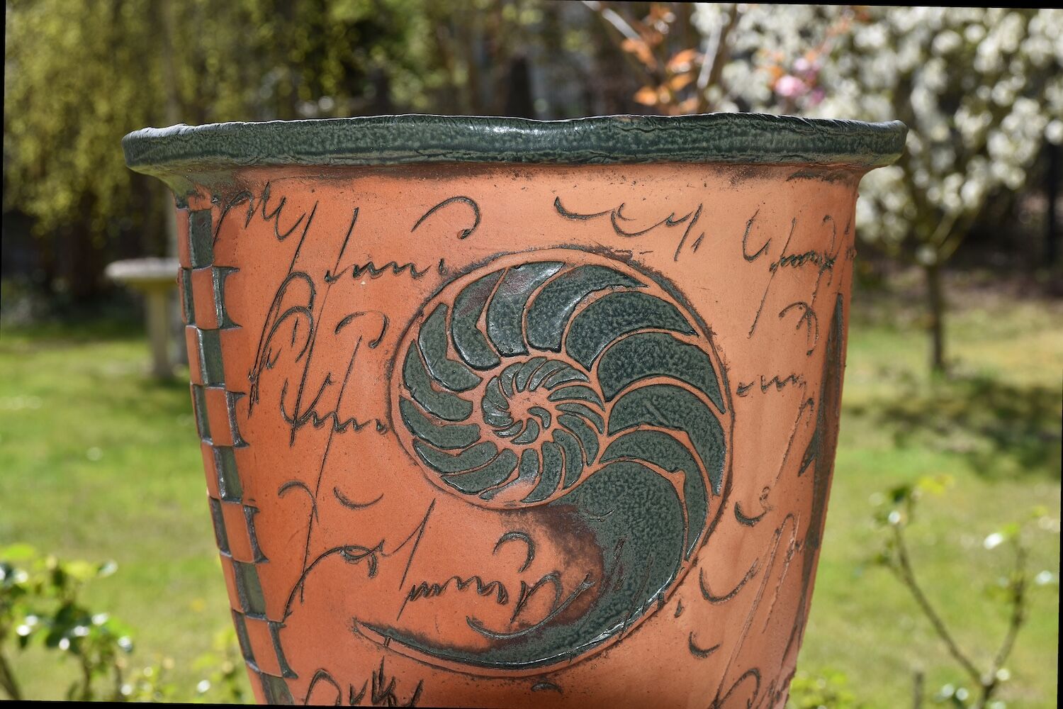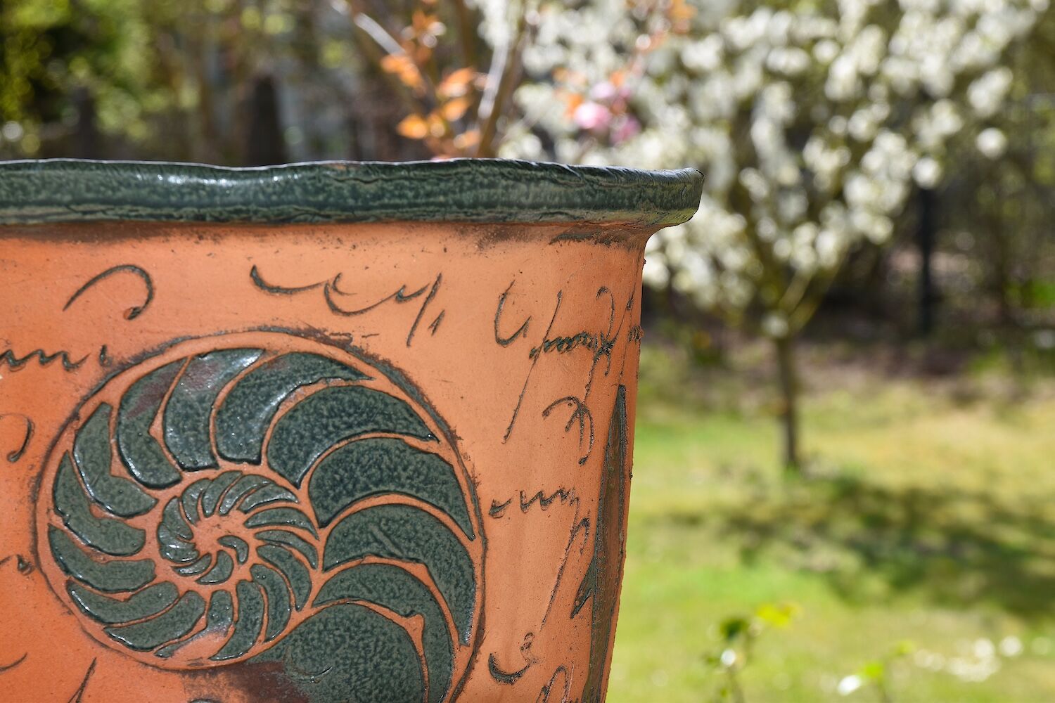 Phantasievolles Keramikgefäß mit verschiedenen, umlaufenden Motiven, zum Beispiel einem Nautilus. Das Pflanzgefäß hat eine derart starke Aussage, dass es auch ohne jede Bepflanzung zu begeistern weiß. Es kann im Gebäudeinneren wie auch ganzjährig draußen stehen. Es wird mit vier kleinen Keramikfüßchen geliefert (nicht im Bild).