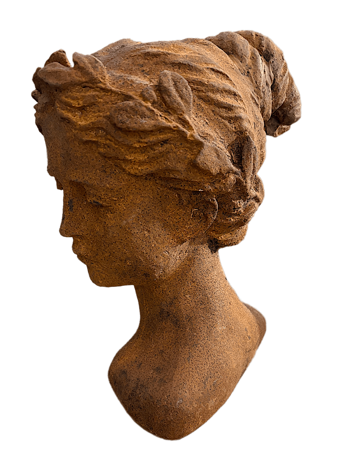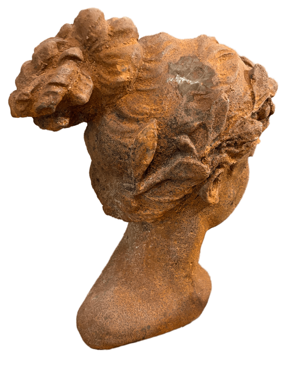 Kopfbüste aus korrodiertem Gusseisen (26 cm) des jungen Götterboten Mercurius, auch als Merkur bekannt. Die Büste ist frostfest und ganzjährig für draußen und drinnen geeignet.